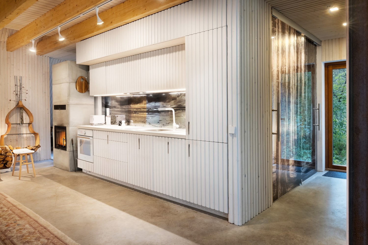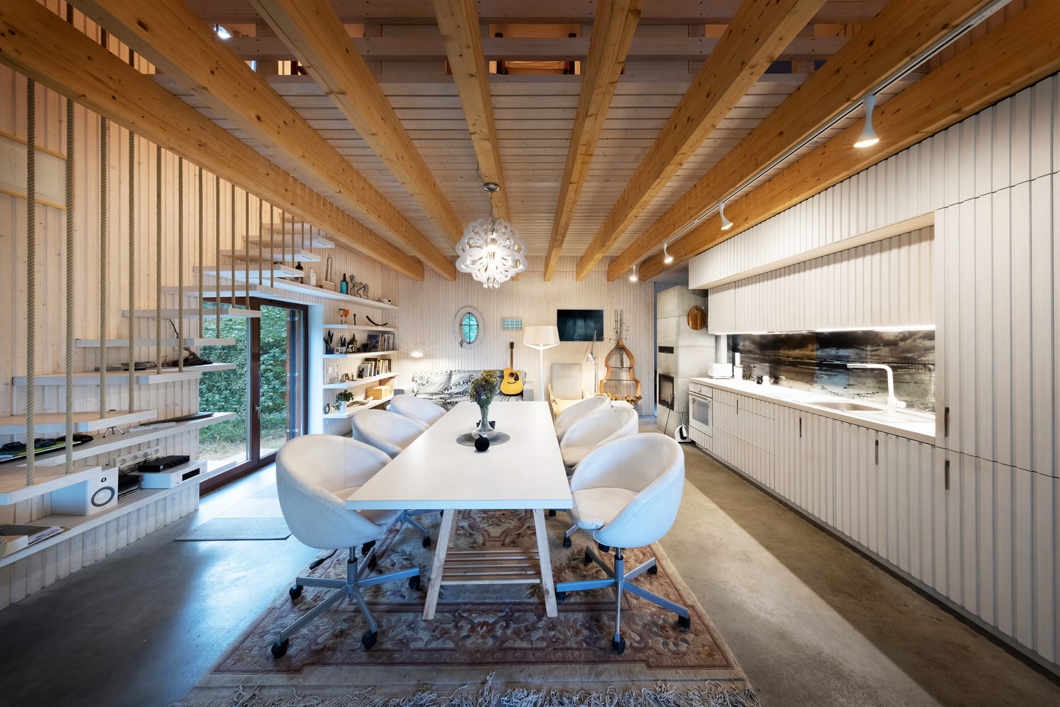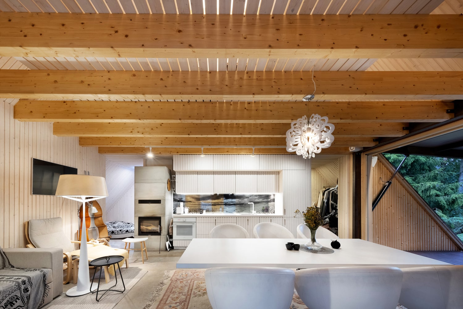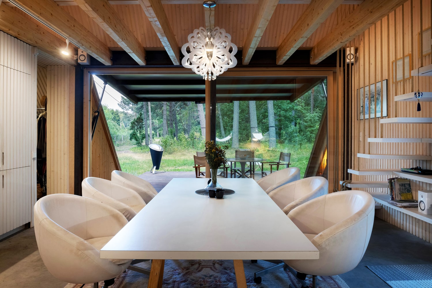 Otwarty dach zapewnia schronienie przed deszczem i światłem słonecznym. Zamknięty tworzy z kolei praktyczną przestrzeń do przechowywania mebli ogrodowych, jednocześnie osłaniając wnętrze przed warunkami atmosferycznymi. Tylna żaluzja domu odsłania mały warsztat, który podobnie zamienia się w przestronną przestrzeń zewnętrzną z zadaszeniem. Odrestaurowane owalne okno między warsztatem a salonem pochodzi z secesyjnej willi w Tallinie zaprojektowanej przez fińskiego architekta Armasa Lindgrena.