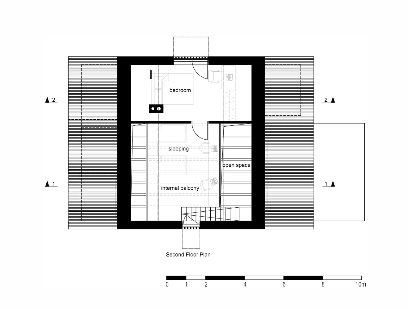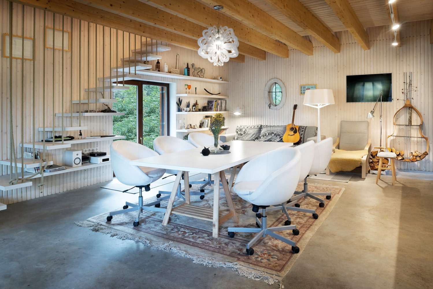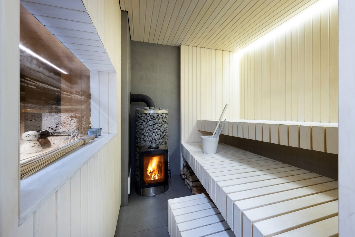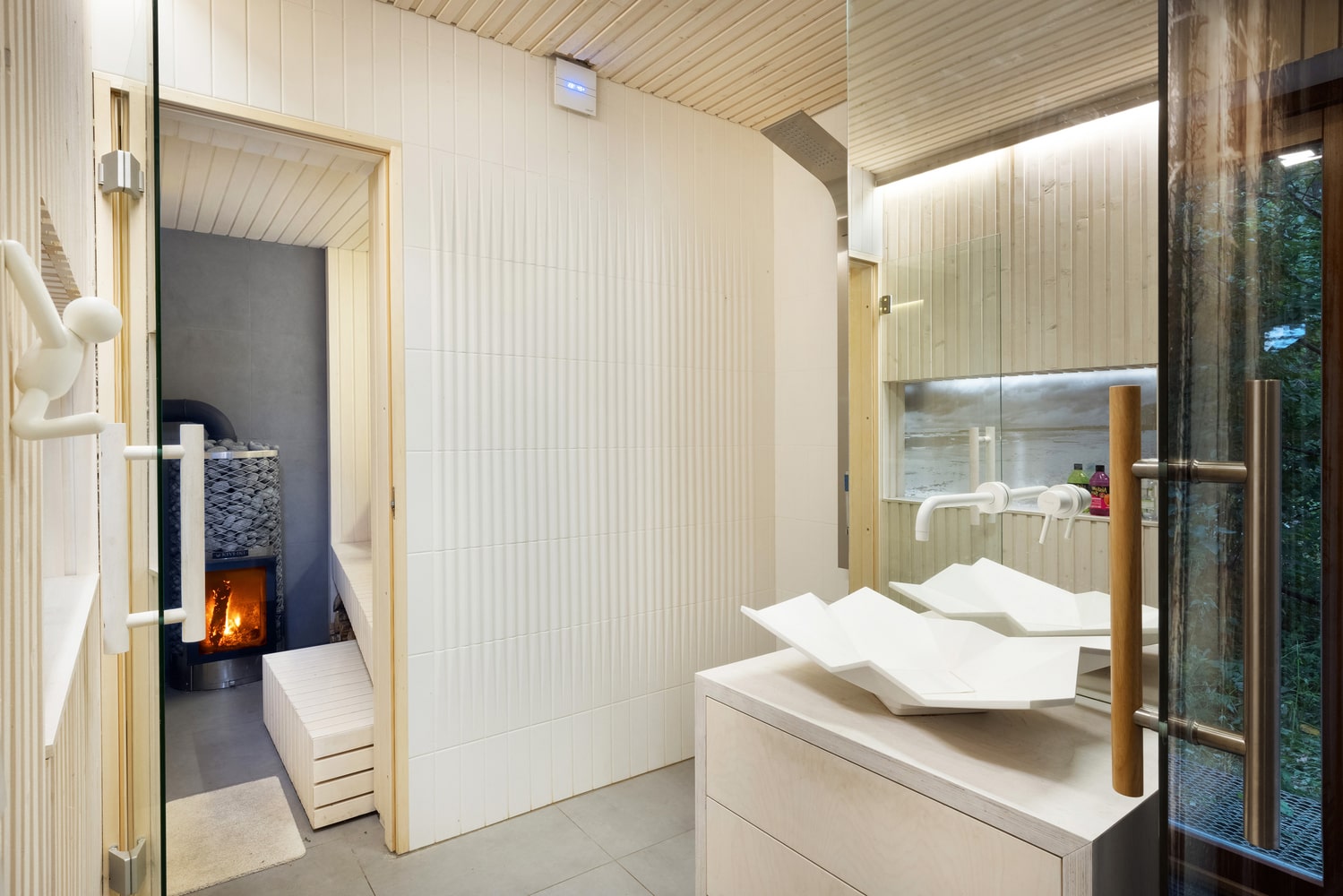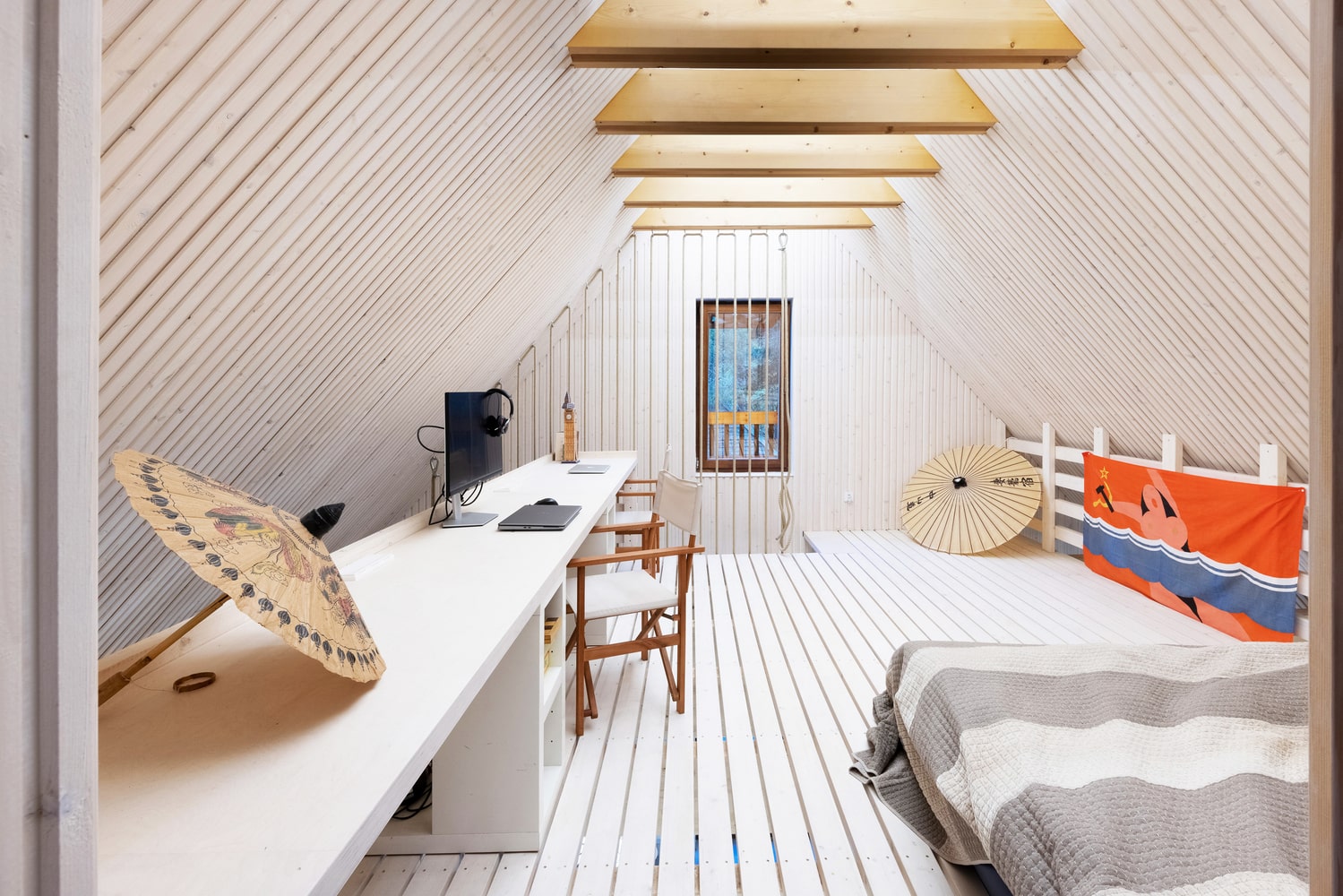 Otwarty dach zapewnia schronienie przed deszczem i światłem słonecznym. Zamknięty tworzy z kolei praktyczną przestrzeń do przechowywania mebli ogrodowych, jednocześnie osłaniając wnętrze przed warunkami atmosferycznymi. Tylna żaluzja domu odsłania mały warsztat, który podobnie zamienia się w przestronną przestrzeń zewnętrzną z zadaszeniem. Odrestaurowane owalne okno między warsztatem a salonem pochodzi z secesyjnej willi w Tallinie zaprojektowanej przez fińskiego architekta Armasa Lindgrena.
