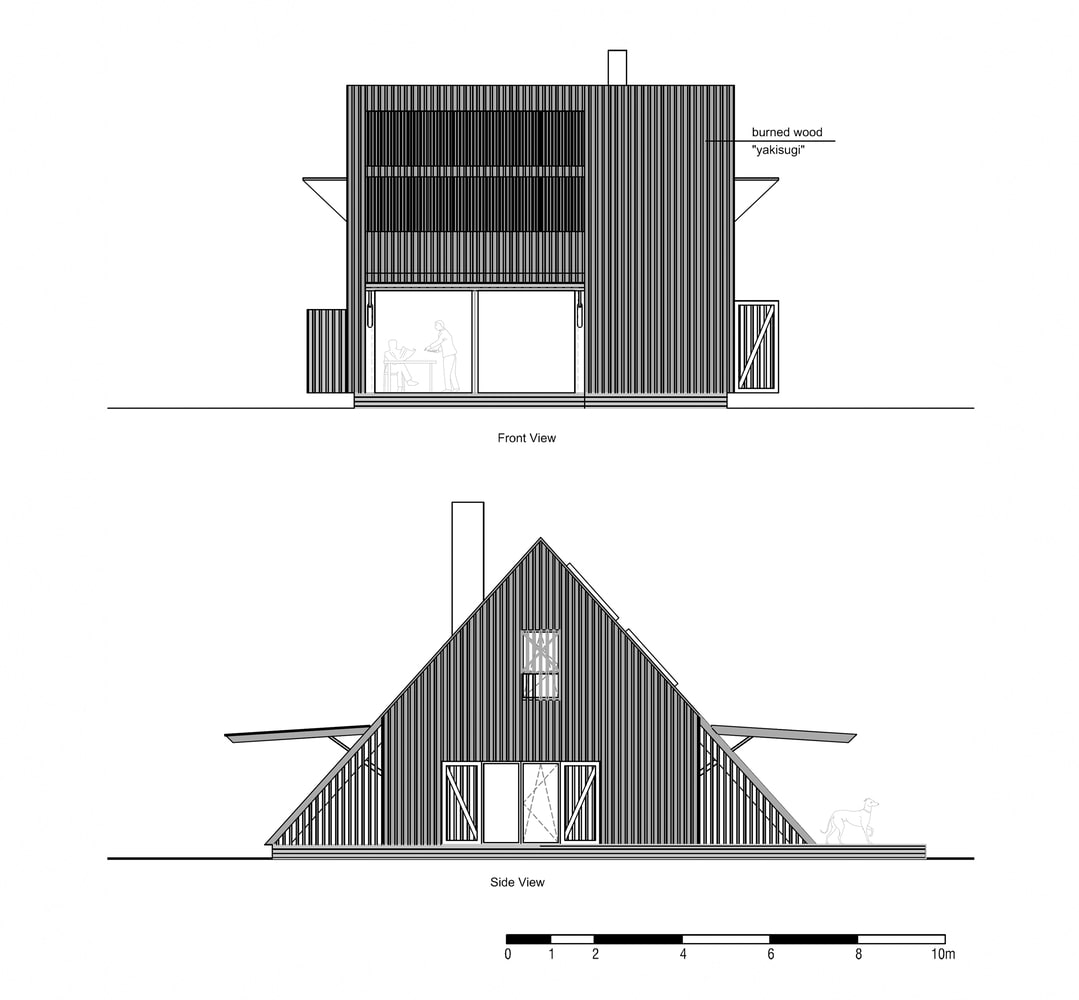 Dom stoi na płycie betonowej, a cała konstrukcja jest drewniana. Również wykończenie zewnętrzne i wewnętrzne to drewno, natomiast konstrukcja okiennic to stal zapewniająca sztywność ruchomych elementów i stabilność domu.