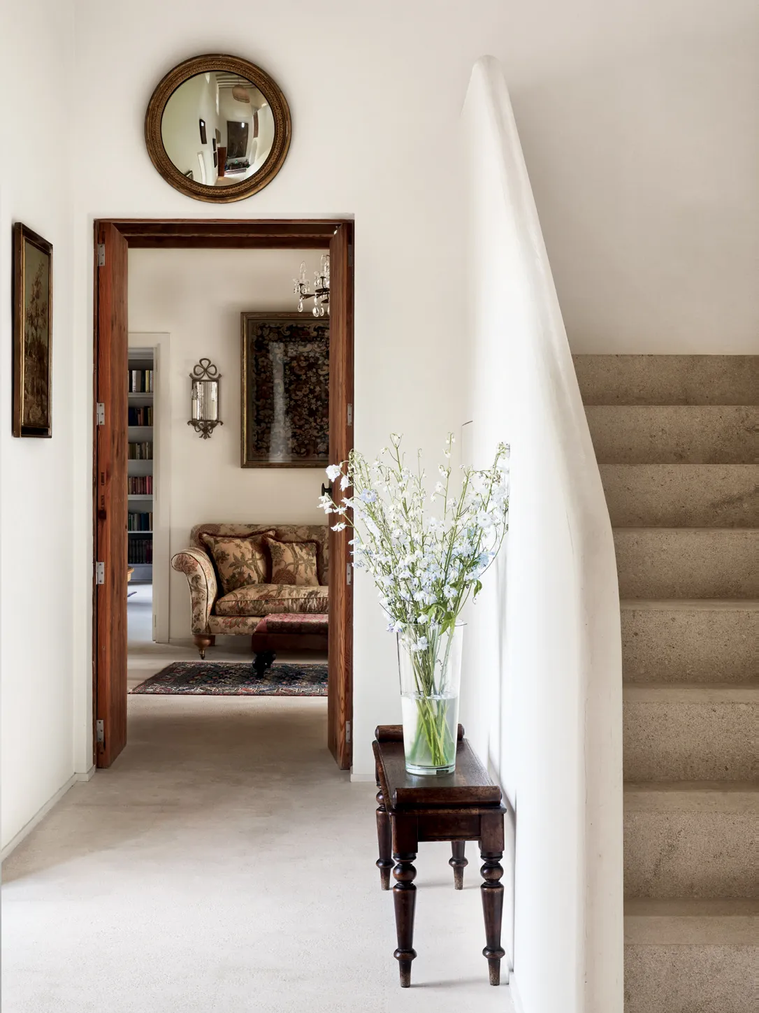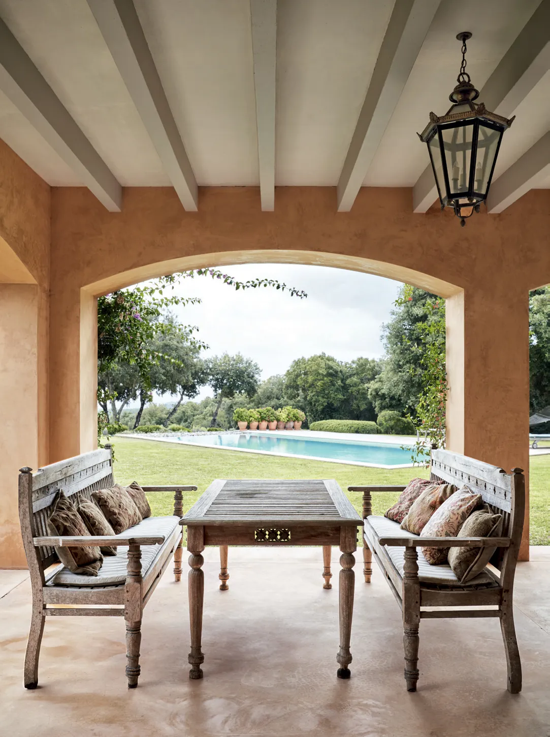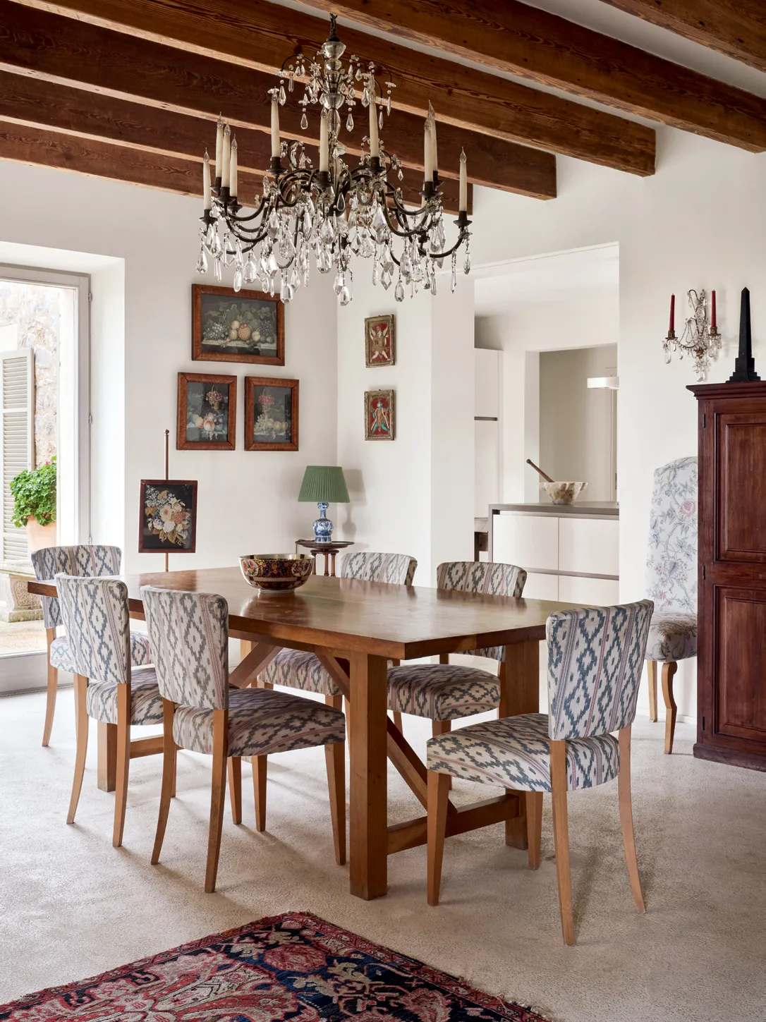 Dom jest mistrzowską klasą w używaniu wzorców. Bielone ściany i białe podłogi z wapienia stanowią neutralne tło, na którym idealnie wygląda radosna mieszanka pasków, kwiatów, lnu i jedwabiu. To sprytna realizacja angielskiej estetyki w hiszpańskiej scenerii. W salonie XVIII-wieczny obraz olejny rodziny Wertzów wypełnia ścianę nad pomarańczowo-różową sofą. Pokój otwiera się z trzech stron na ogród.