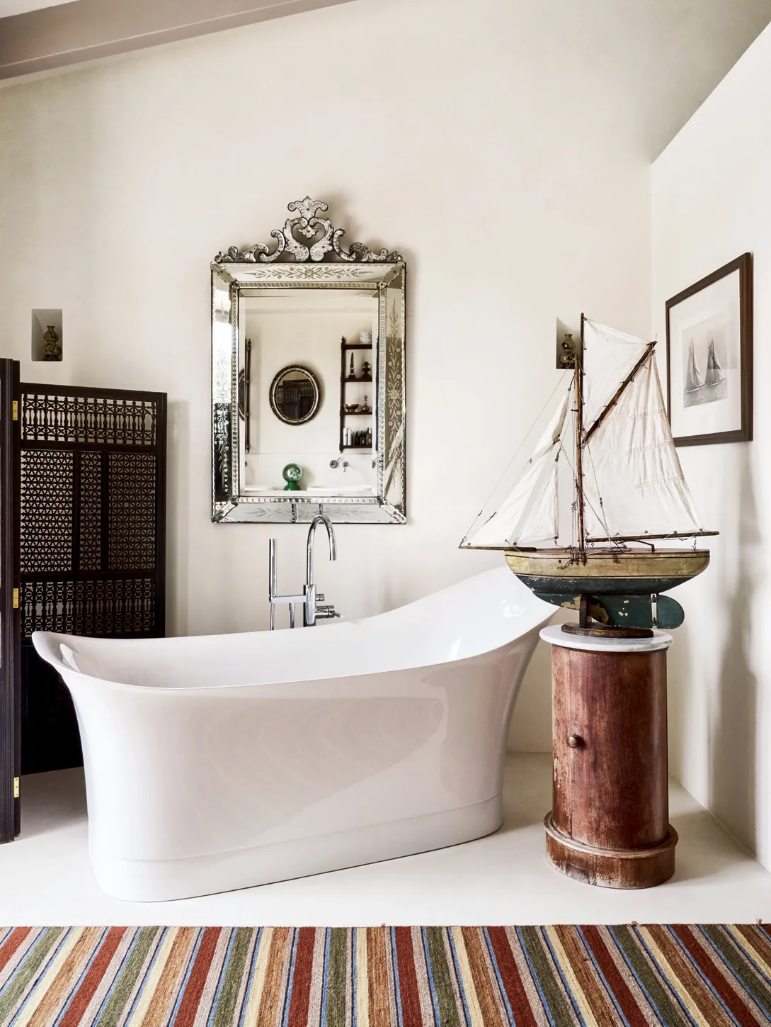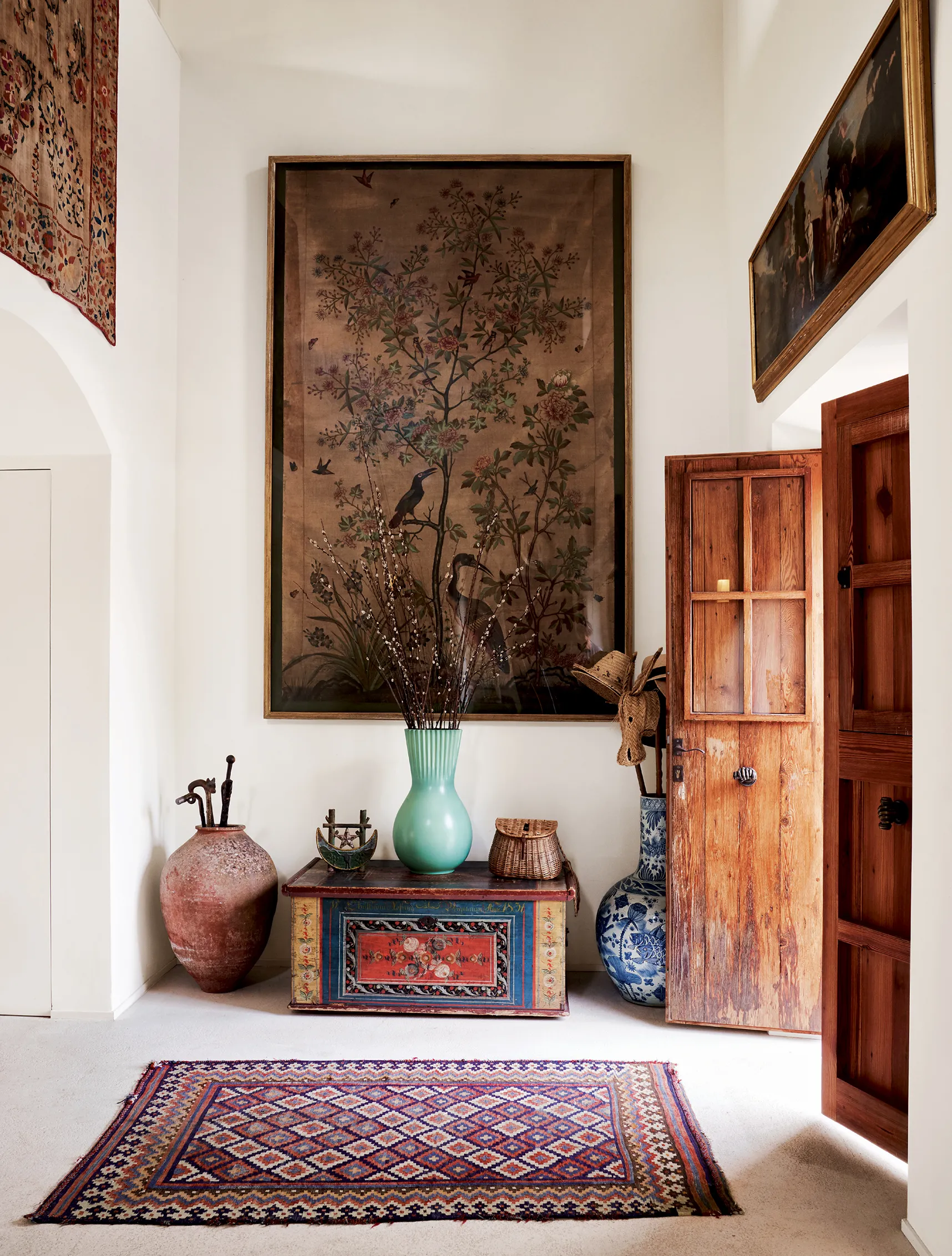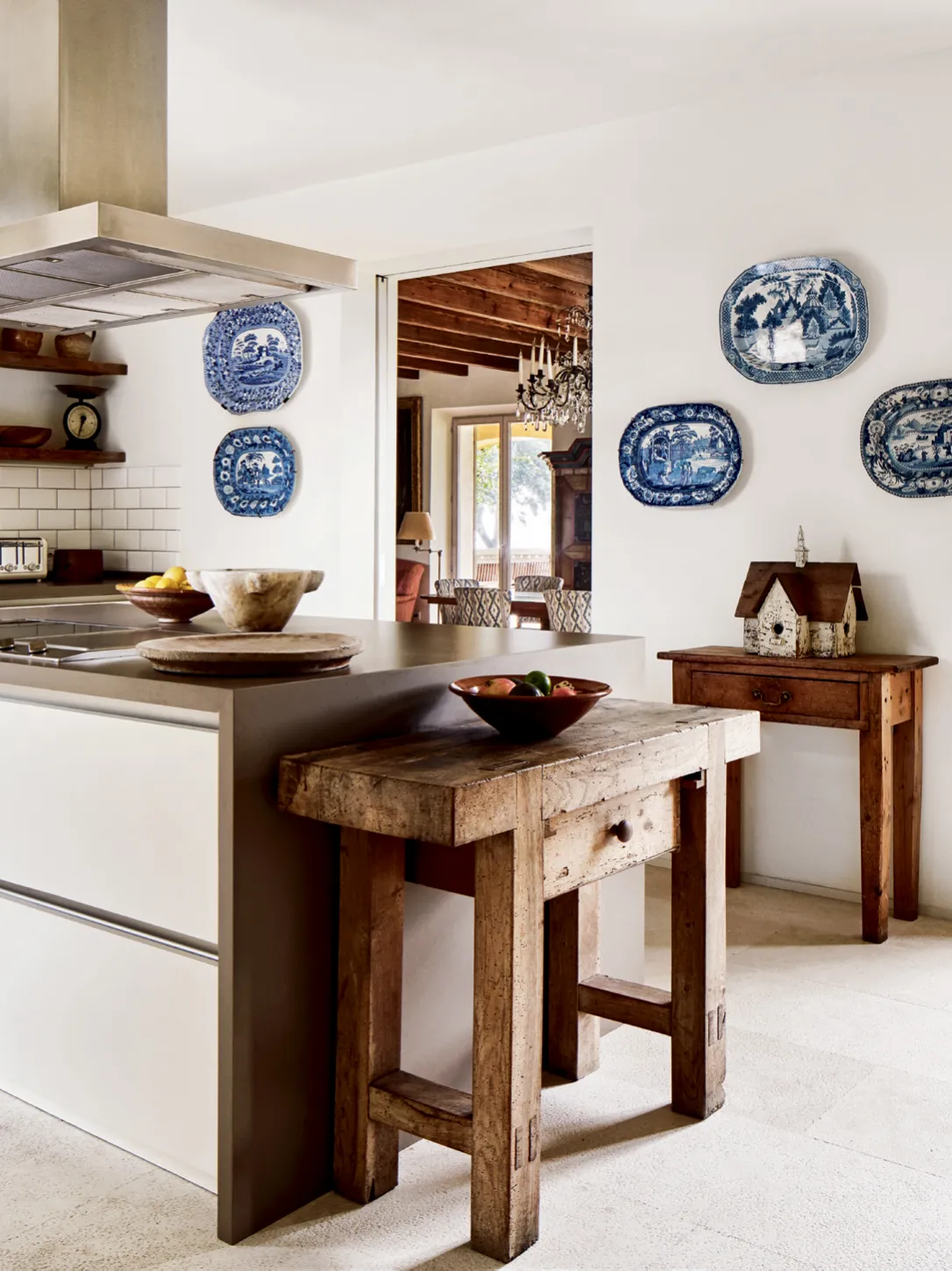 Dom jest mistrzowską klasą w używaniu wzorców. Bielone ściany i białe podłogi z wapienia stanowią neutralne tło, na którym idealnie wygląda radosna mieszanka pasków, kwiatów, lnu i jedwabiu. To sprytna realizacja angielskiej estetyki w hiszpańskiej scenerii. W salonie XVIII-wieczny obraz olejny rodziny Wertzów wypełnia ścianę nad pomarańczowo-różową sofą. Pokój otwiera się z trzech stron na ogród.