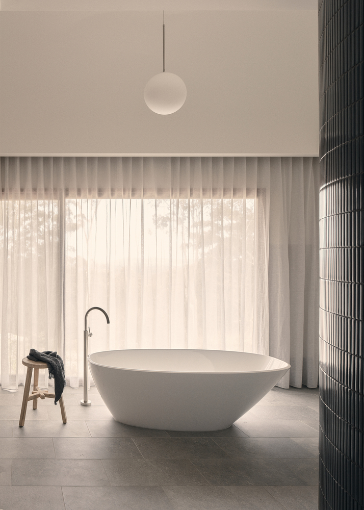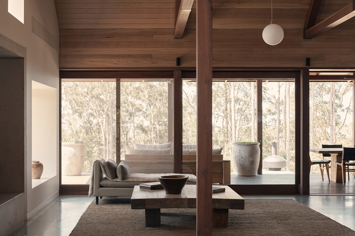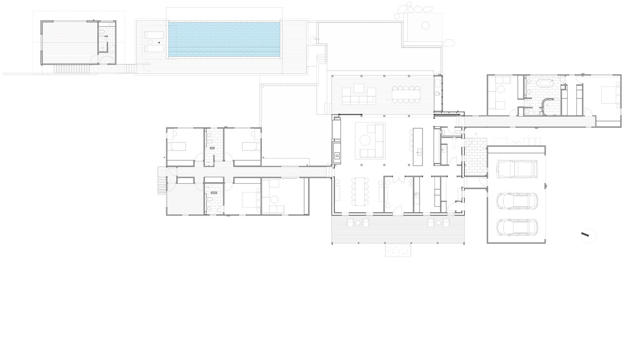W domu znajdują się duże, centralne obszary, w których rodzina może się spotykać, gotować, jeść, śmiać się i odpoczywać. Na obu końcach domu znajdują się mniejsze, intymne sypialnie, w których można spędzić bardziej osobisty, spokojny czas. Dom zapewnia silne połączenie z otaczającym krajobrazem. Pokoje w domu mają duże, przesuwane, szklane drzwi i okna, które otwierają się na ogrody i krajobraz za nimi. Dom wykorzystuje naturalne światło i wentylację, dzięki czemu mieszkańcy mogą poczuć dzień i pory roku.