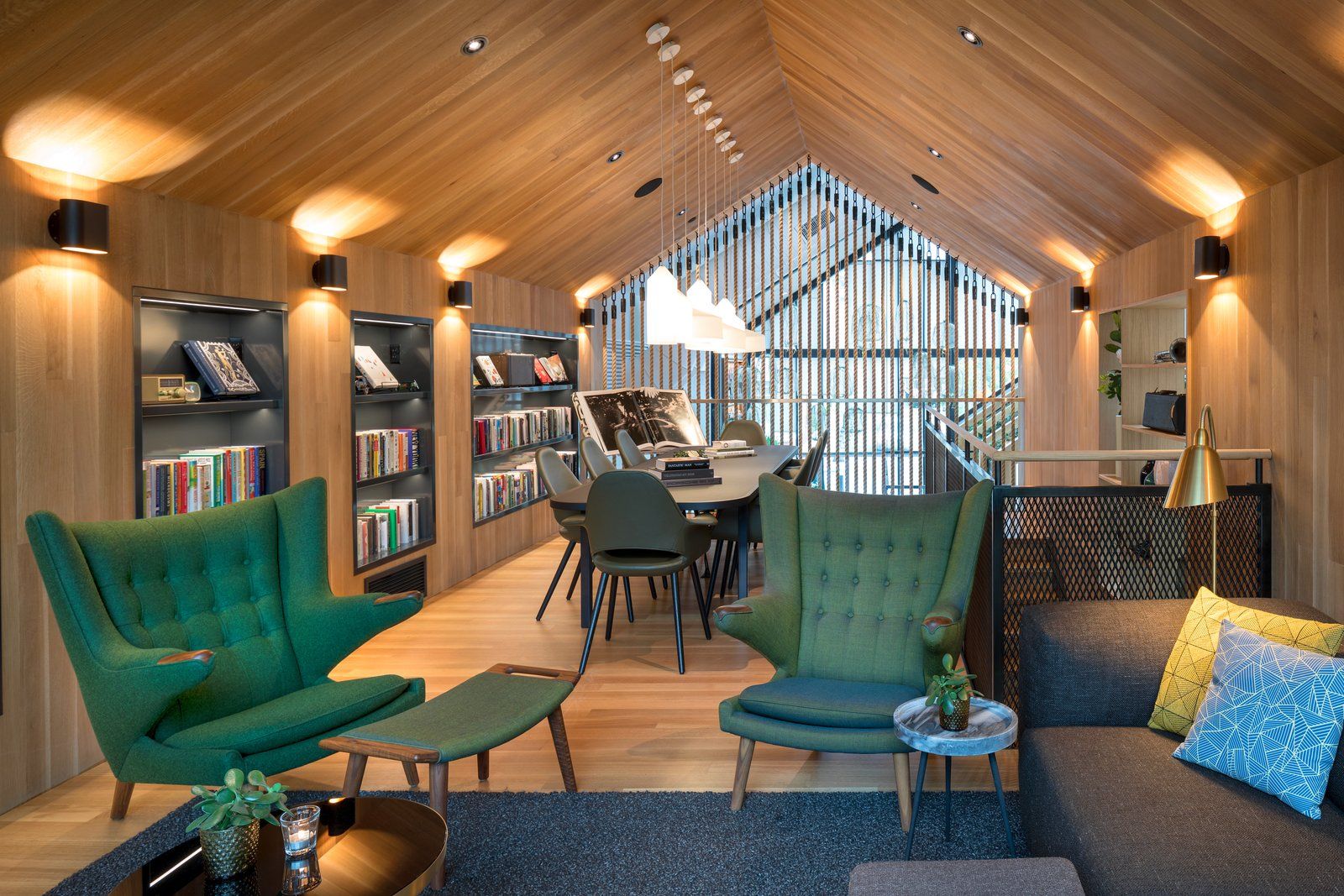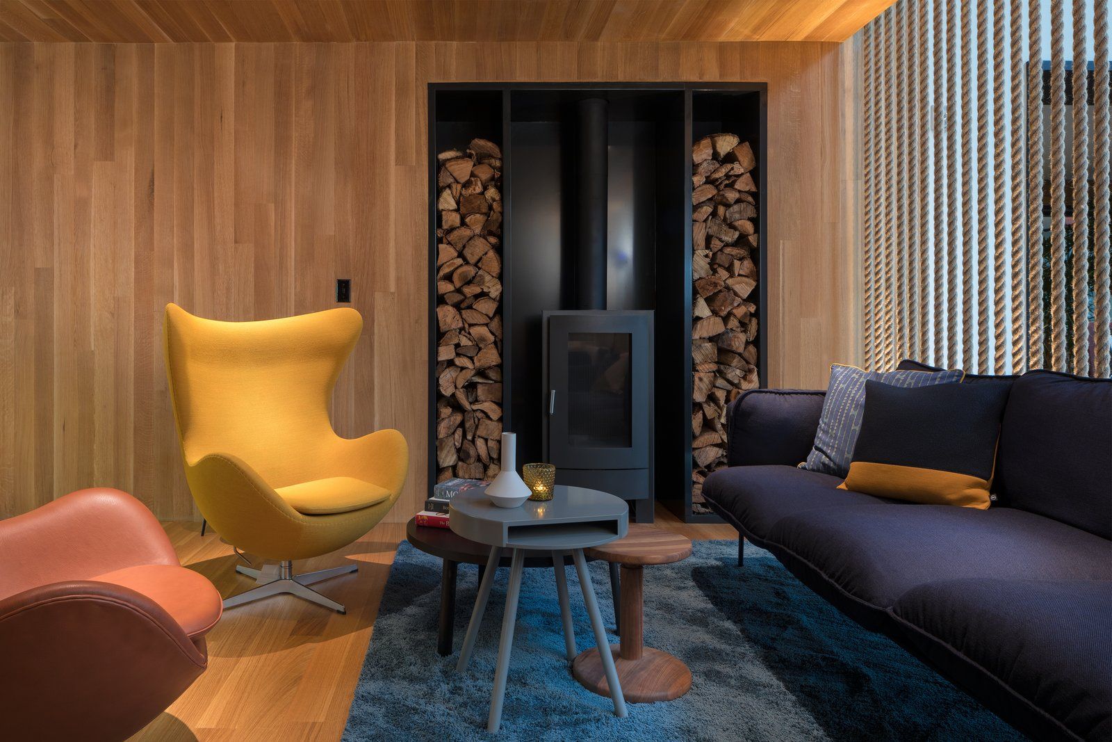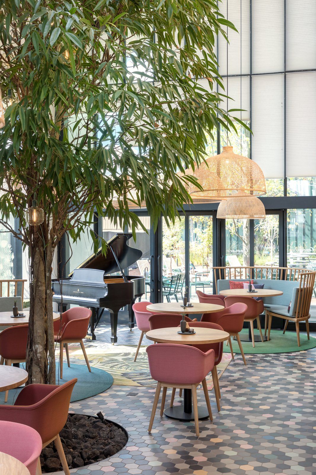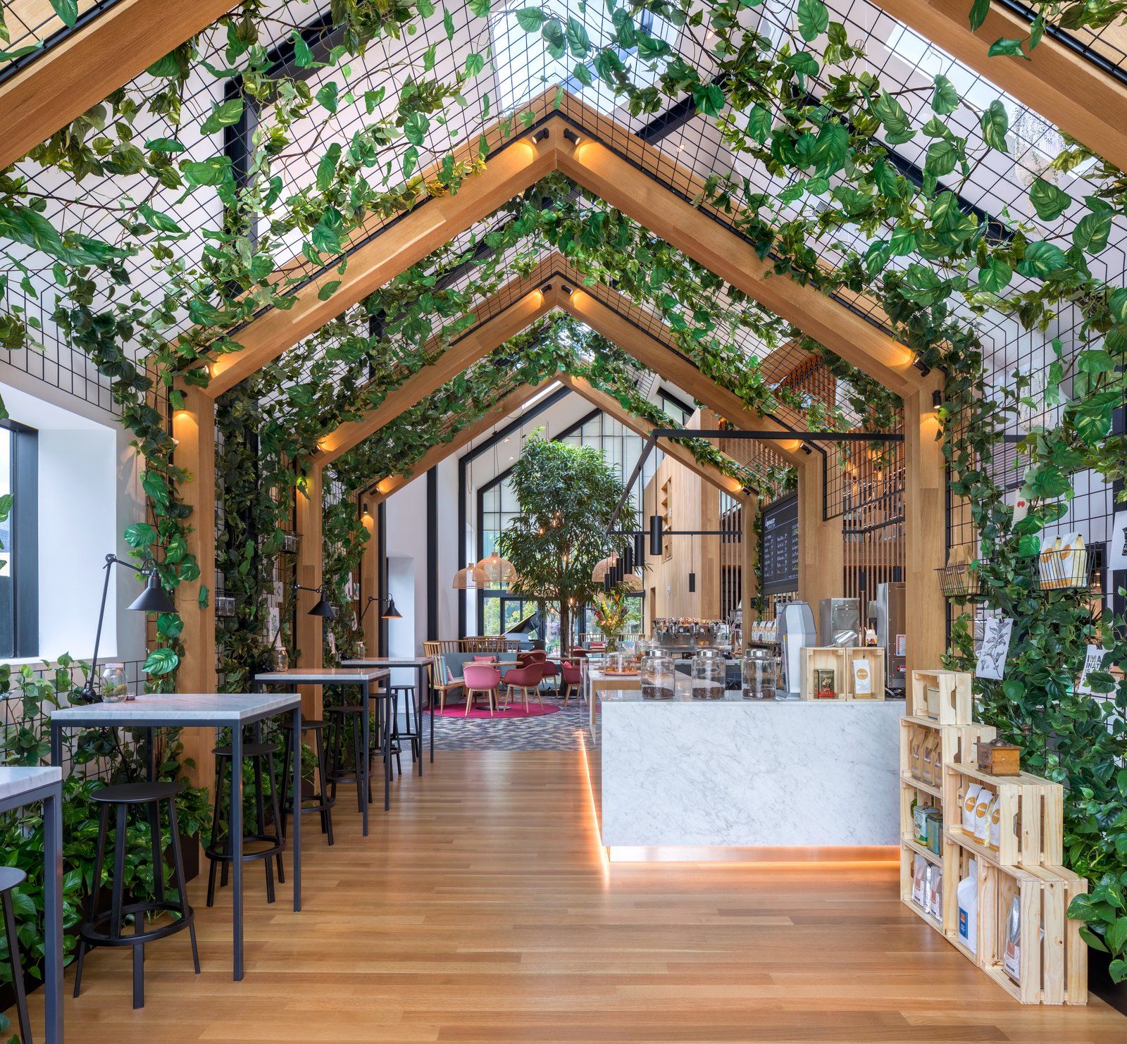 Pionowe listwy w połączeniu z liśćmi, które osłaniają specjalną konstrukcję, odgradzają ciężki podświetlany, marmurowy bar. Mozaika na podłodze tworzy wizualną granicę przestrzenie, a odpowiednio dopracowane oświetlenie tworzy przytulną atmosferę we wnętrzu kawiarni. Akcentem, który różnicuje przestrzeń na wewnętrzną i zewnętrzną jest też oryginalny, dwupiętrowy „domek na drzewie”, który powstał we wnętrzu. Konstrukcja została wykonana z drewna i zamknięta została ścianą z grubego sznurka, a w środku powstała przytulna przestrzeń z wygodnymi fotelami, w której urządzono niewielką bibliotekę przy kominku.