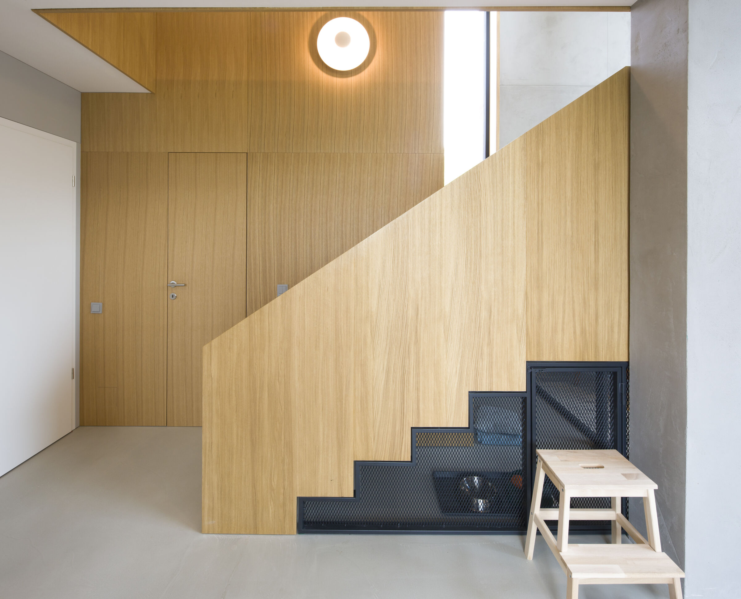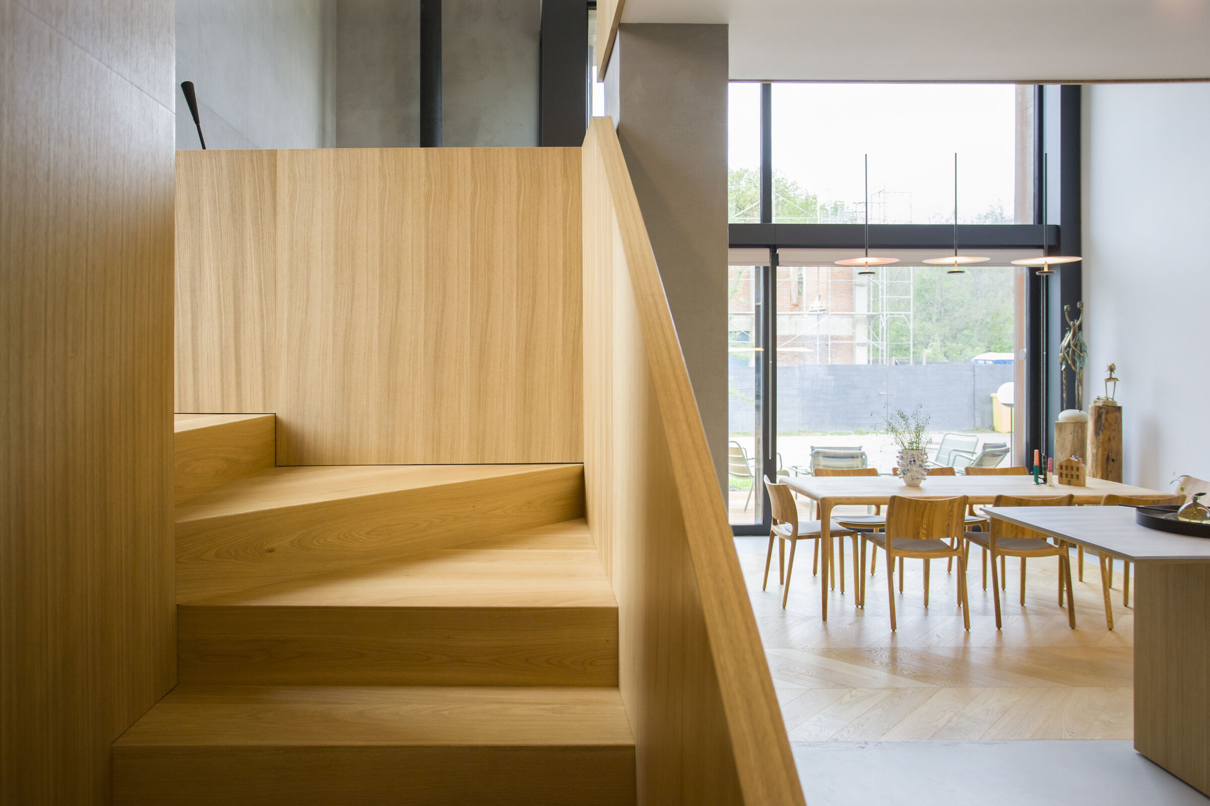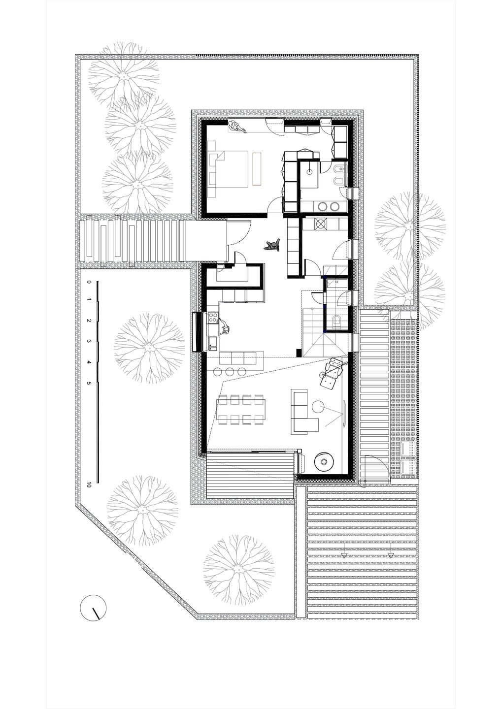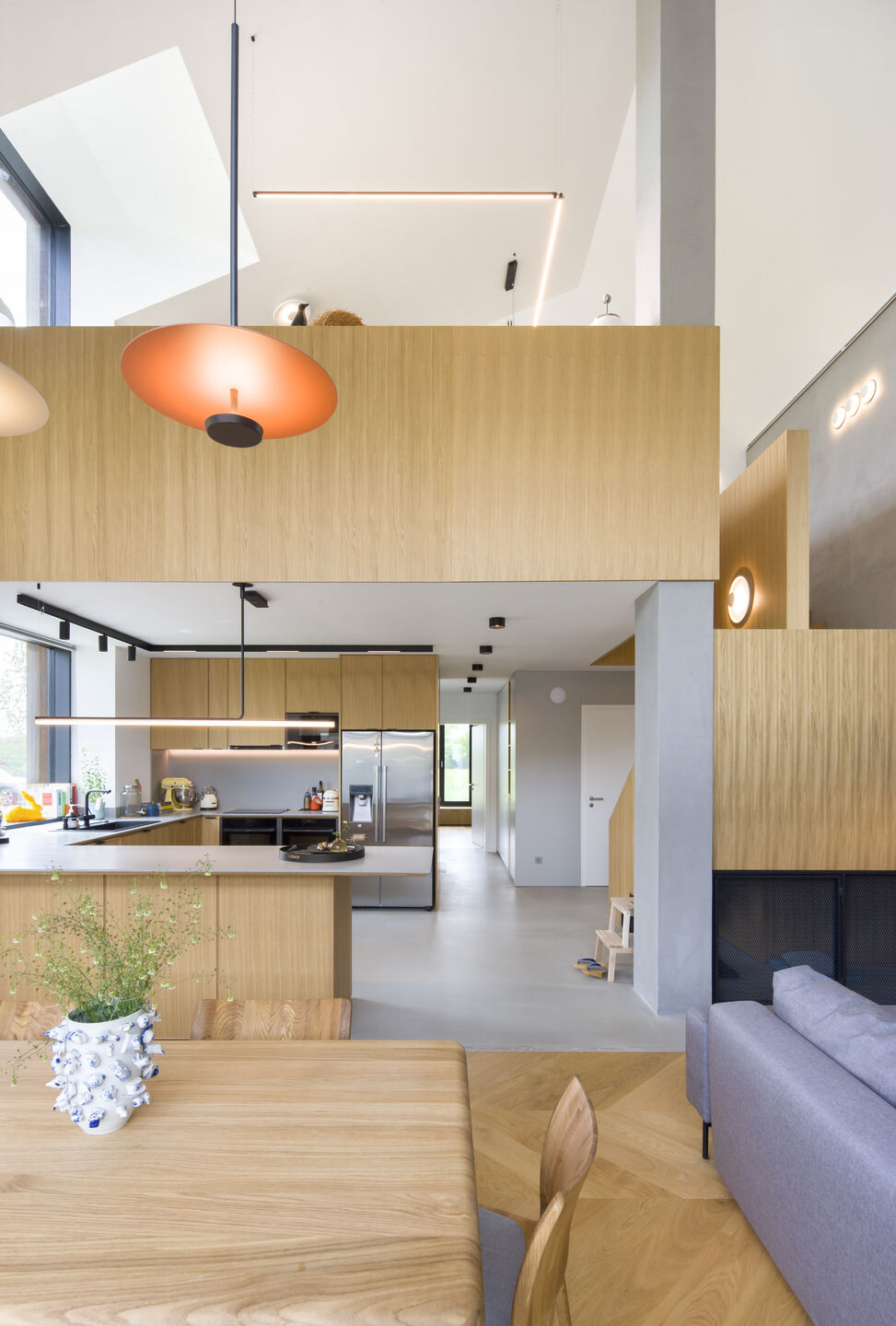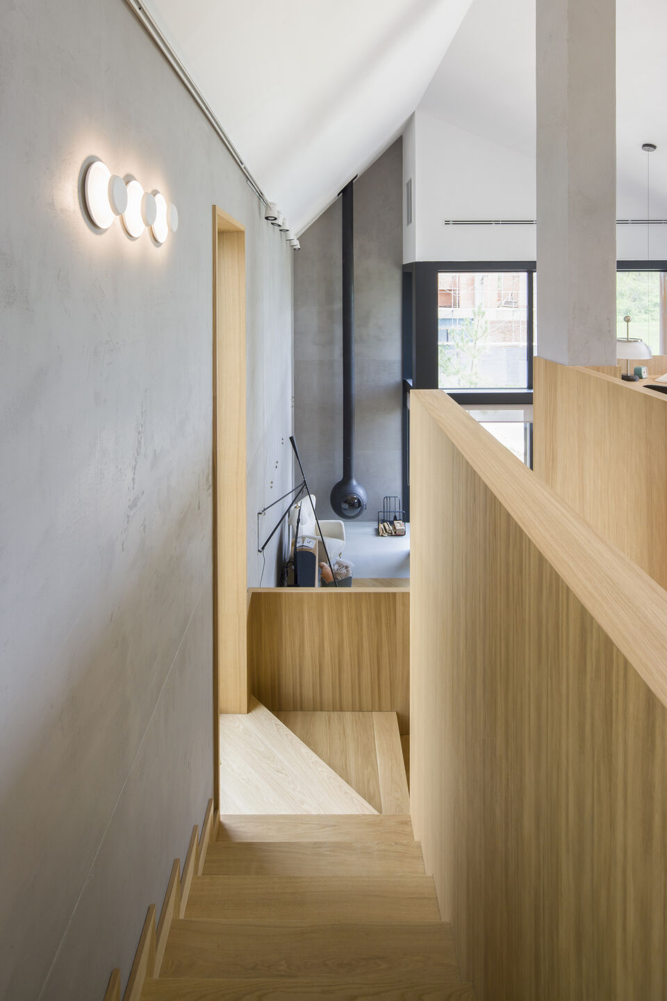Dom posiada wyraźnie rozgraniczonąstrefę dzienną i nocną. Forma parteru zapewnia przejrzystość jednej fasady na drugą i wyznacza oddzielenie głównych funkcji mieszkalnych od reszty. Te ostatnie są umieszczone w tylnej/bocznej stronie elewacji. Pionowe połączenie domu charakteryzuje się zarówno żywą i ciepłą materialnością schodów i balustrad. Ściany i podłogi pozostawiają miejsce na wyobraźnię i kolor, który z powodzeniem wkracza później w wystrój i dekorację domu. Na górze klatka schodowa otwiera się na cichszą część dzienną, w której mieści się gabinet i biblioteka.