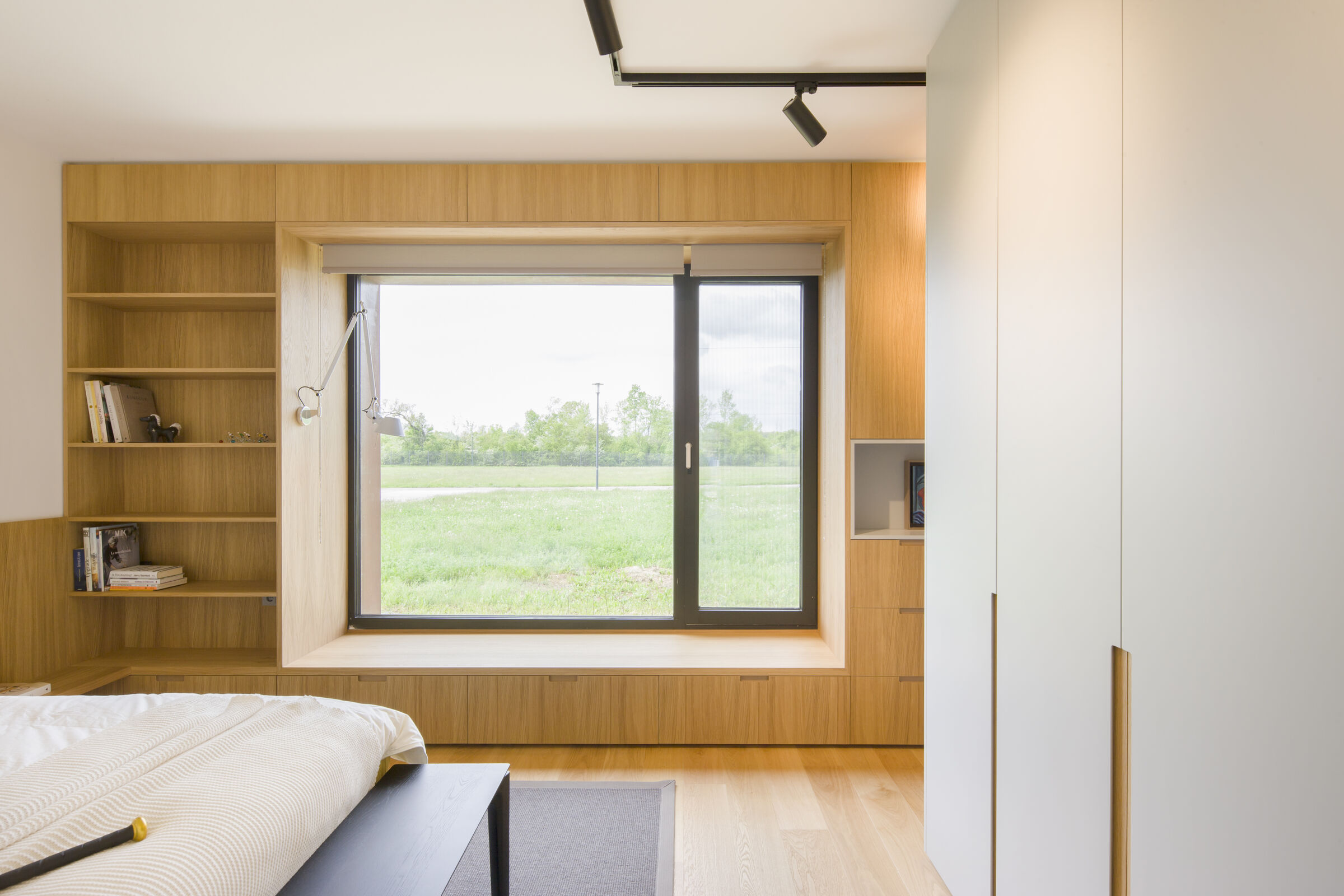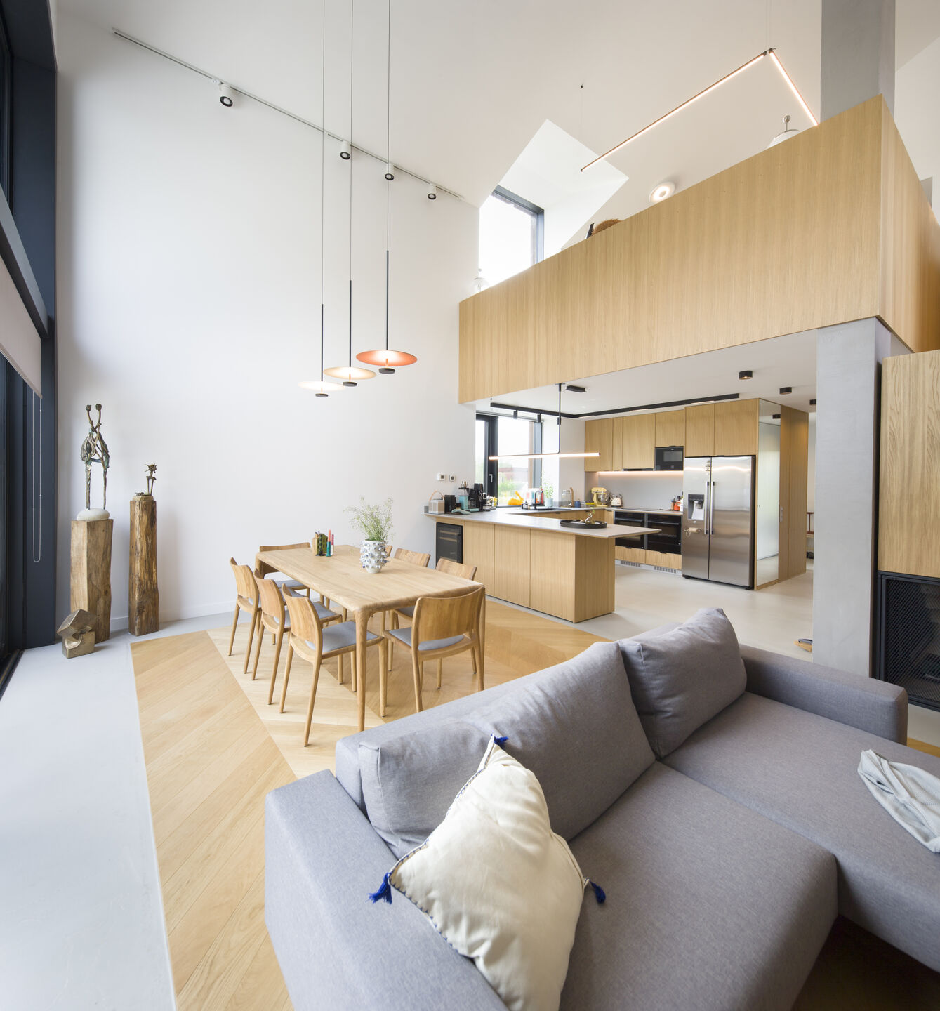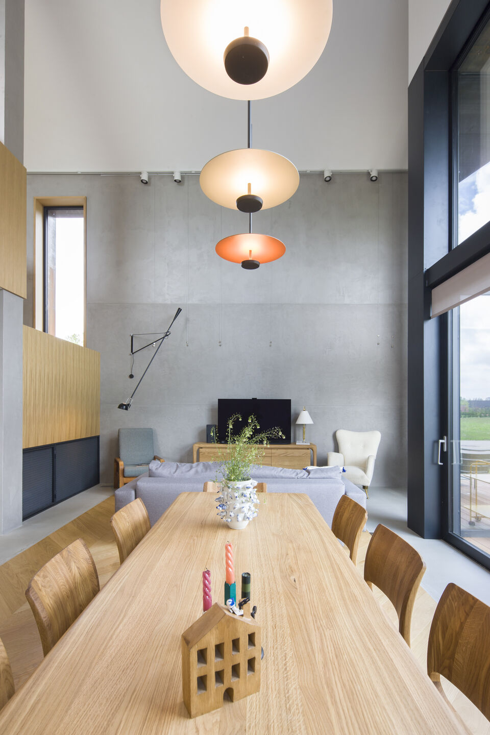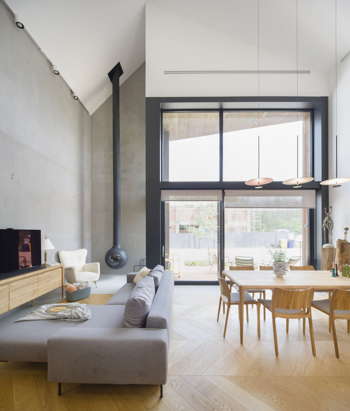 Dom posiada wyraźnie rozgraniczonąstrefę dzienną i nocną. Forma parteru zapewnia przejrzystość jednej fasady na drugą i wyznacza oddzielenie głównych funkcji mieszkalnych od reszty. Te ostatnie są umieszczone w tylnej/bocznej stronie elewacji. Pionowe połączenie domu charakteryzuje się zarówno żywą i ciepłą materialnością schodów i balustrad. Ściany i podłogi pozostawiają miejsce na wyobraźnię i kolor, który z powodzeniem wkracza później w wystrój i dekorację domu. Na górze klatka schodowa otwiera się na cichszą część dzienną, w której mieści się gabinet i biblioteka.