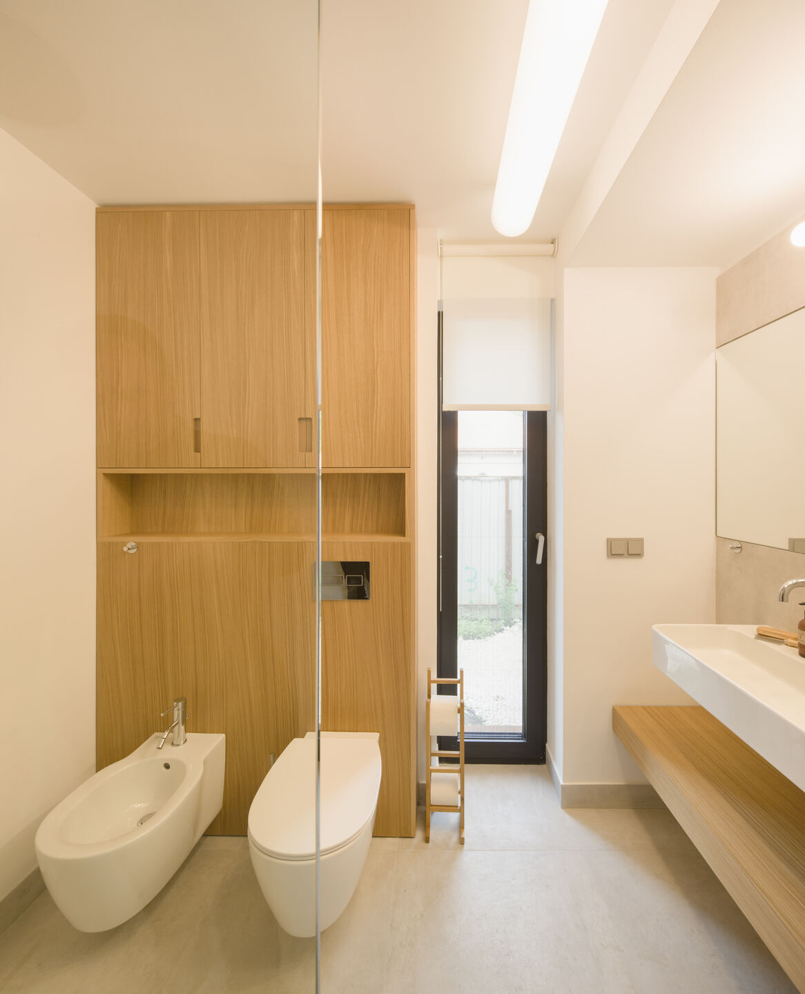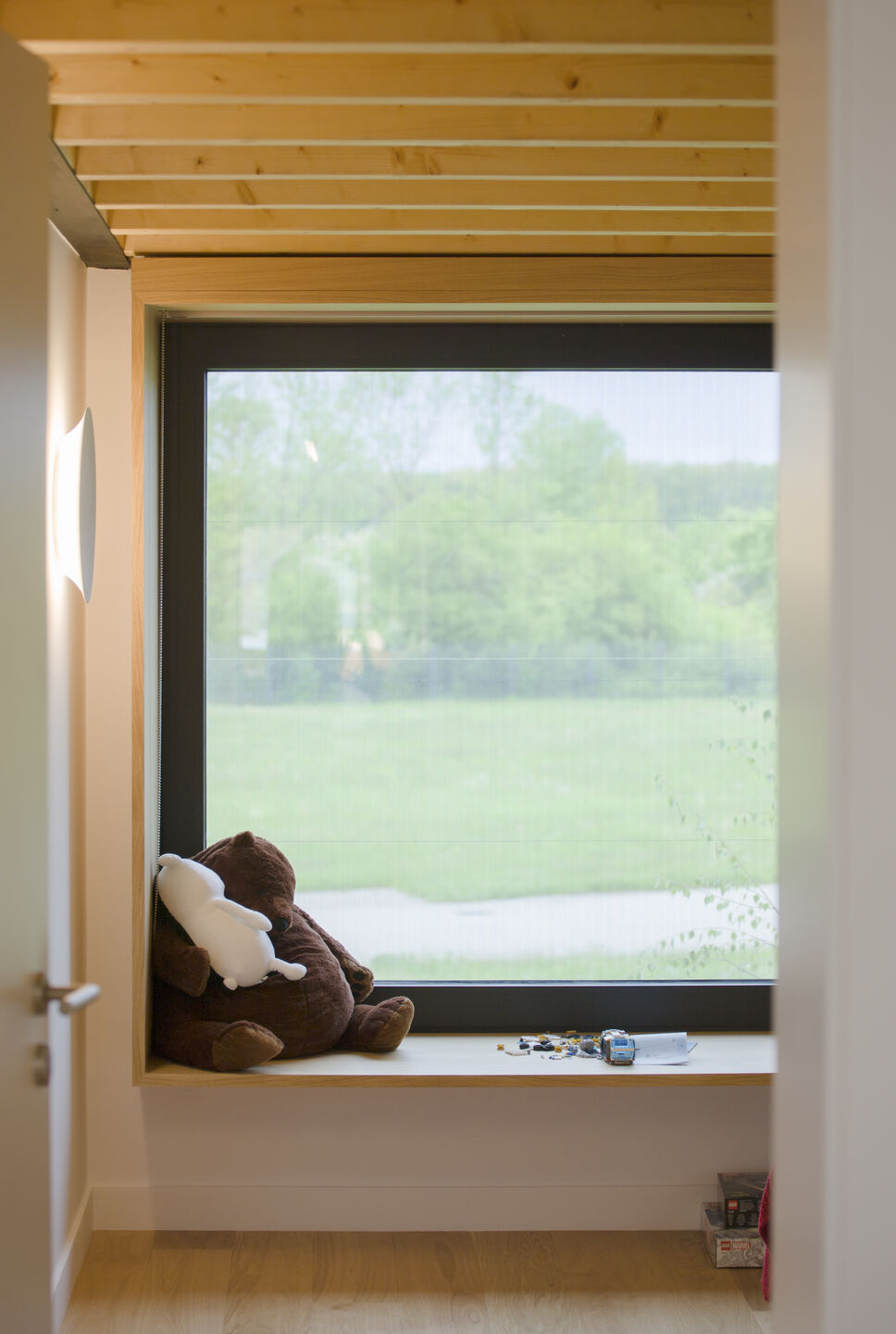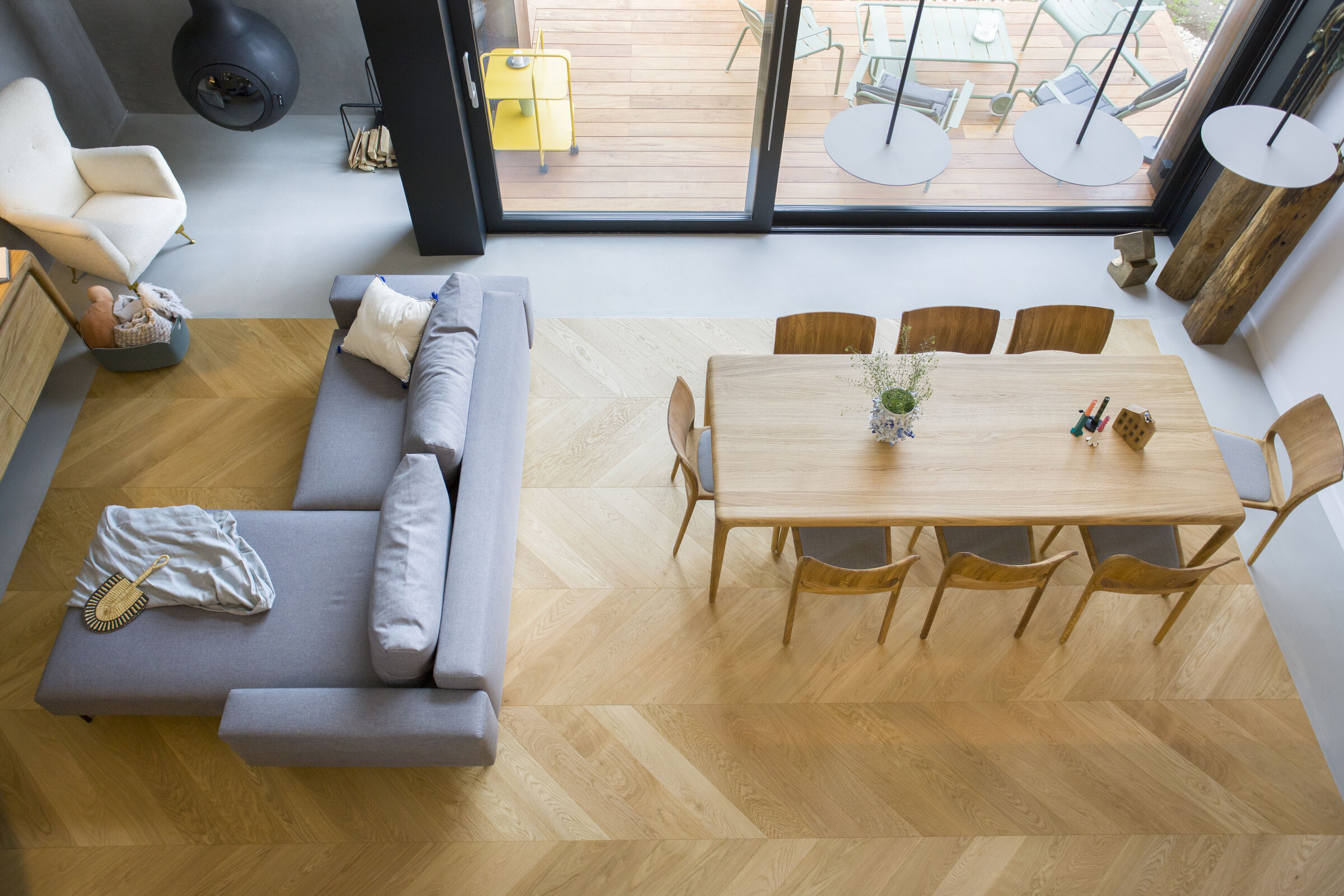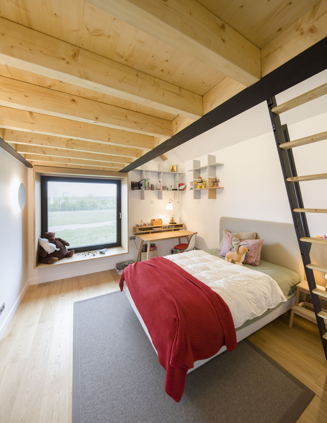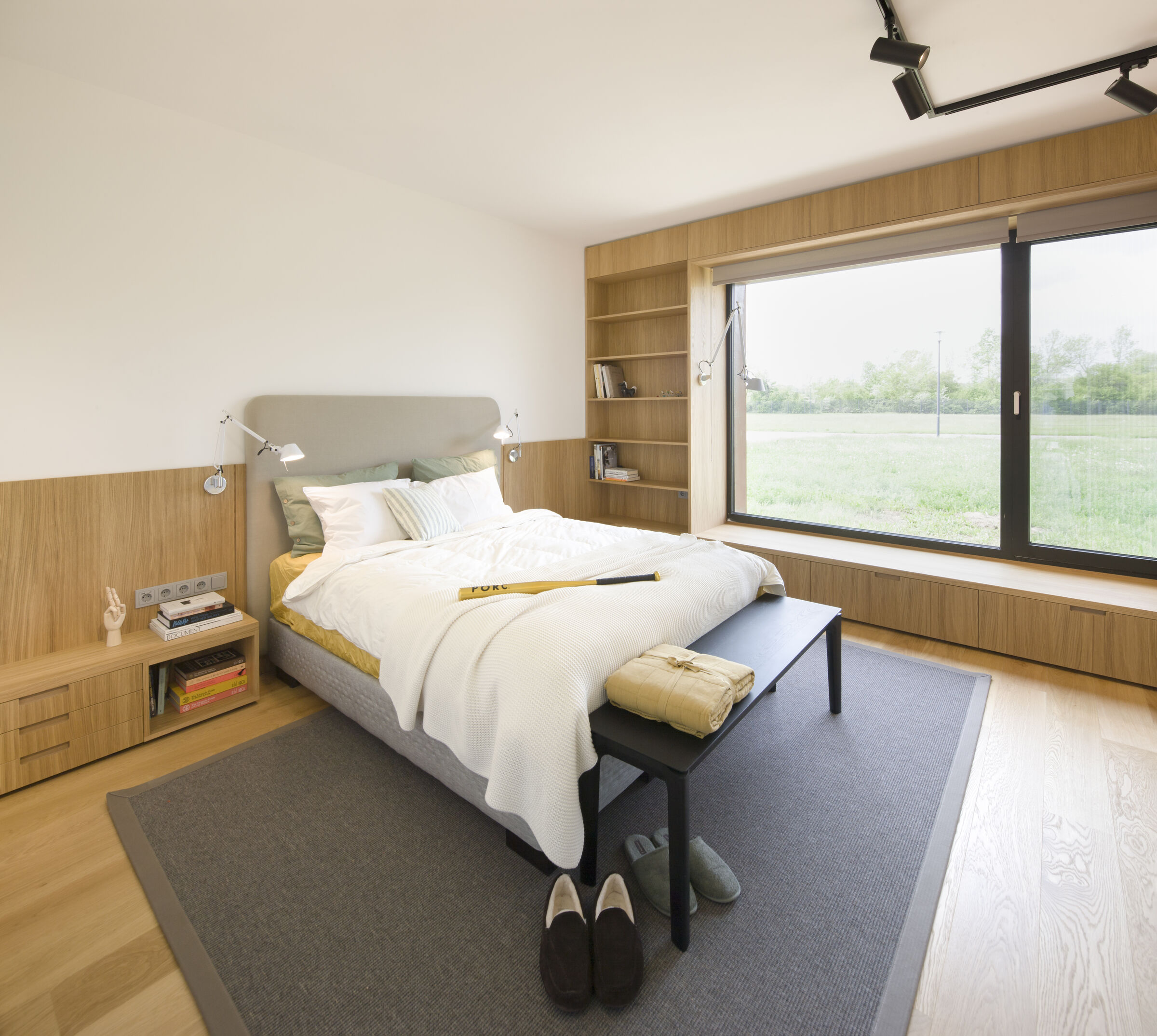 Dom posiada wyraźnie rozgraniczonąstrefę dzienną i nocną. Forma parteru zapewnia przejrzystość jednej fasady na drugą i wyznacza oddzielenie głównych funkcji mieszkalnych od reszty. Te ostatnie są umieszczone w tylnej/bocznej stronie elewacji. Pionowe połączenie domu charakteryzuje się zarówno żywą i ciepłą materialnością schodów i balustrad. Ściany i podłogi pozostawiają miejsce na wyobraźnię i kolor, który z powodzeniem wkracza później w wystrój i dekorację domu. Na górze klatka schodowa otwiera się na cichszą część dzienną, w której mieści się gabinet i biblioteka.