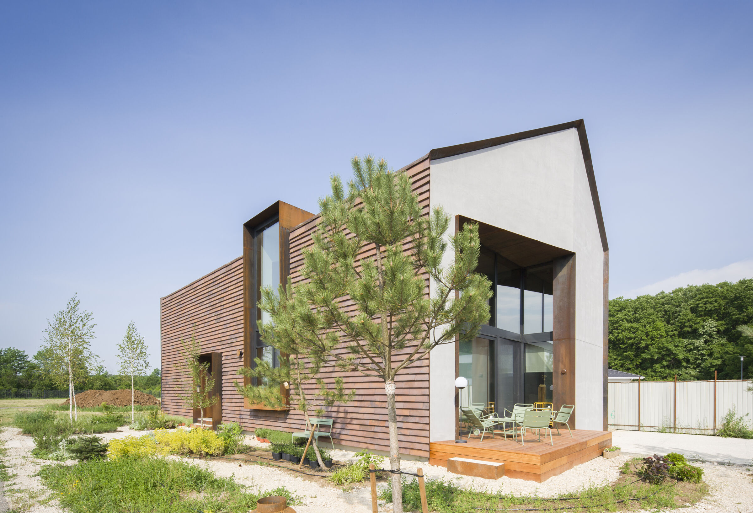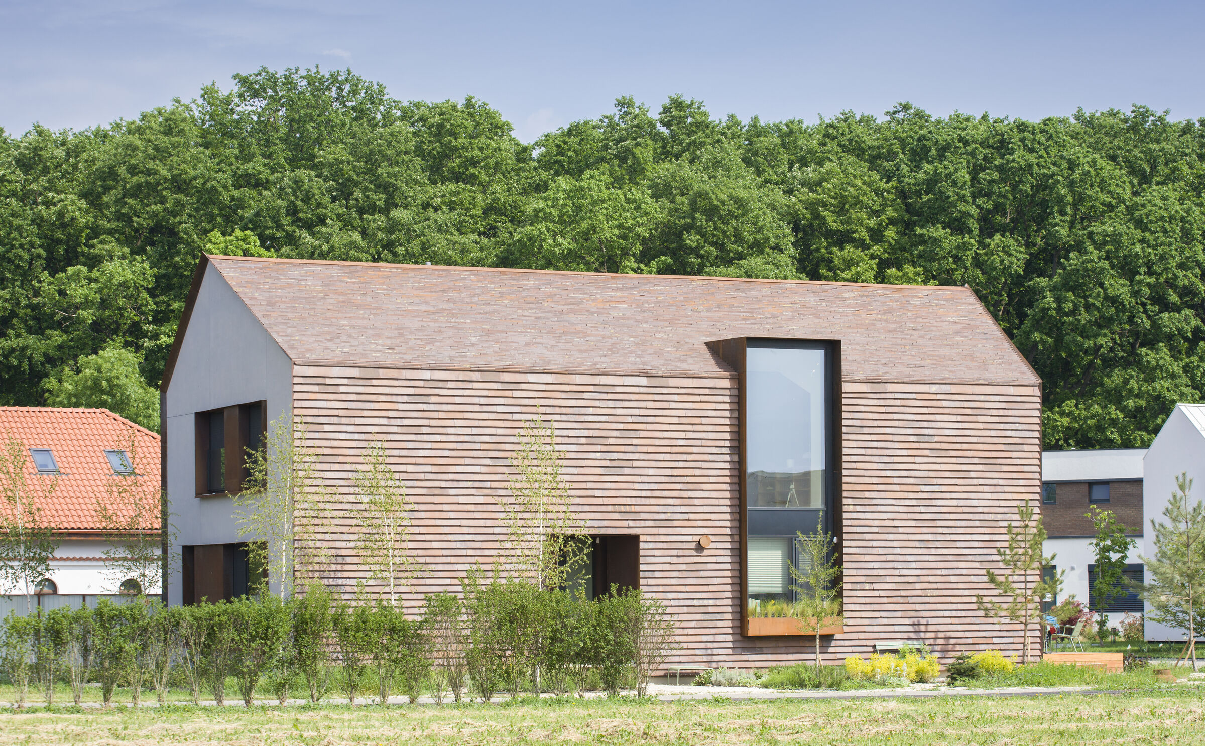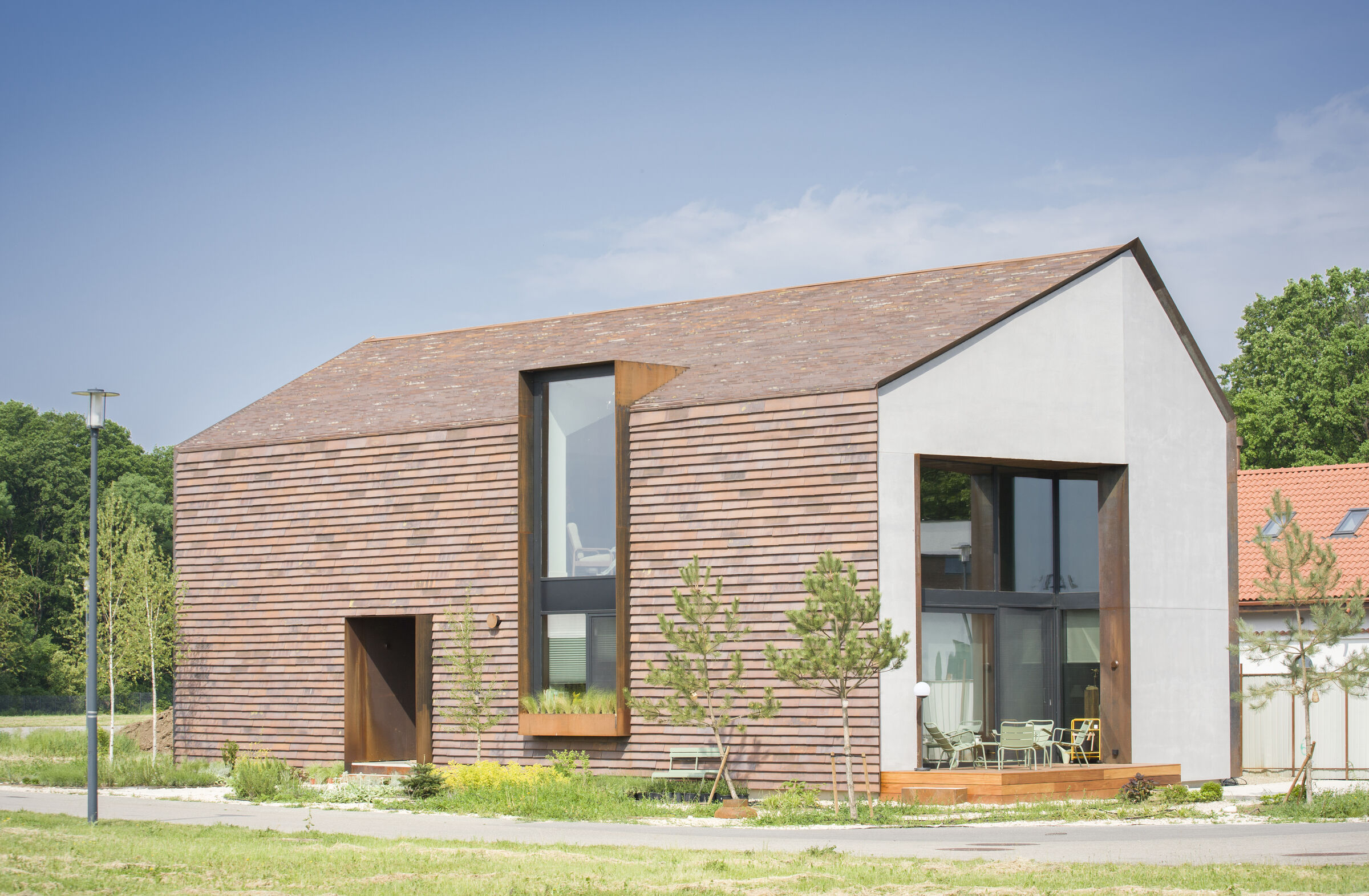 Podejściem architekta przy tworzeniu tego projektu było myślenie o prostych, zwięzłych i funkcjonalnych bryłach. Tak powstała Casa FUS z elewacjami i dachem wykonanymi z ceglanego gontu.