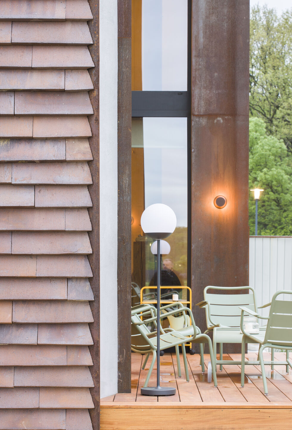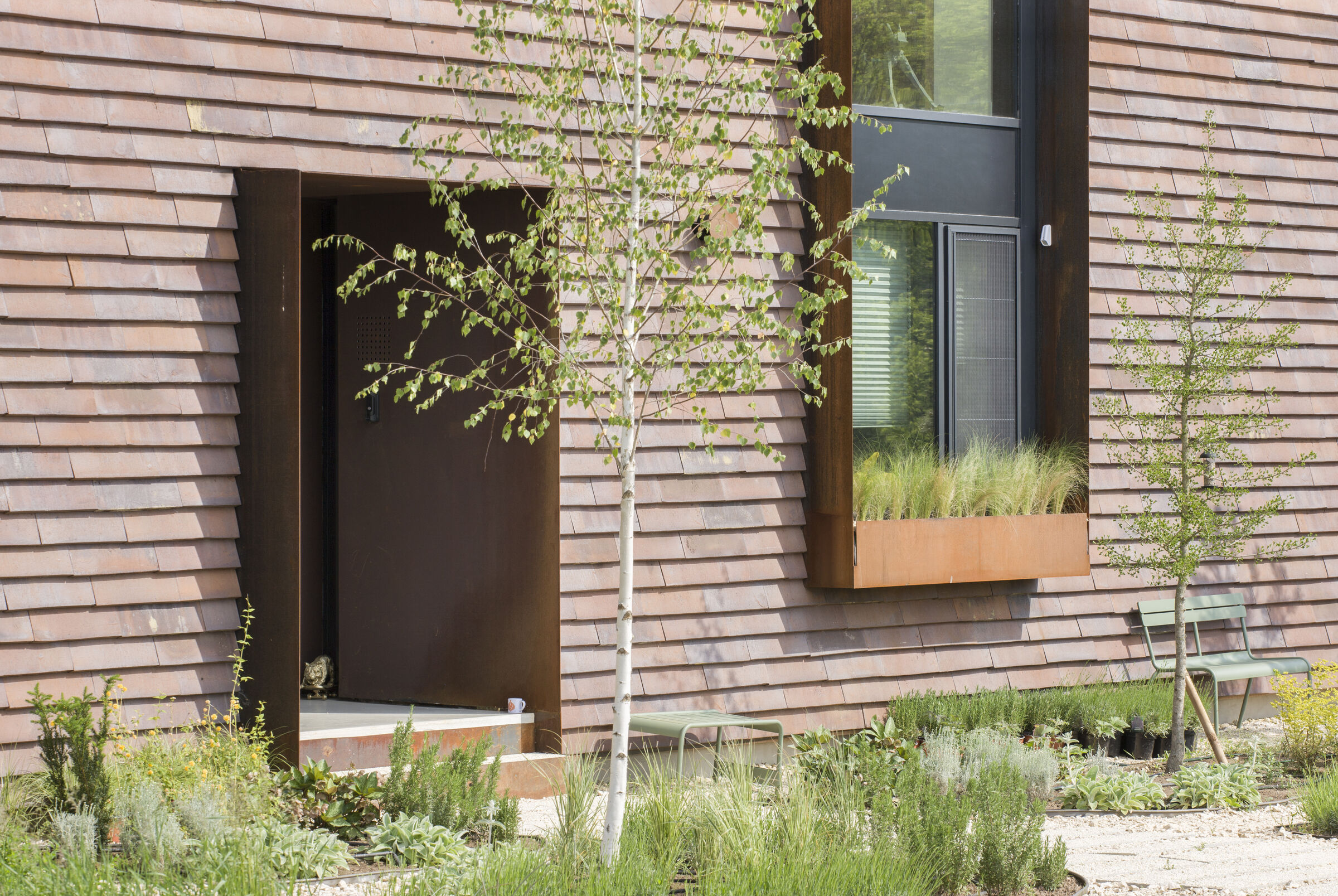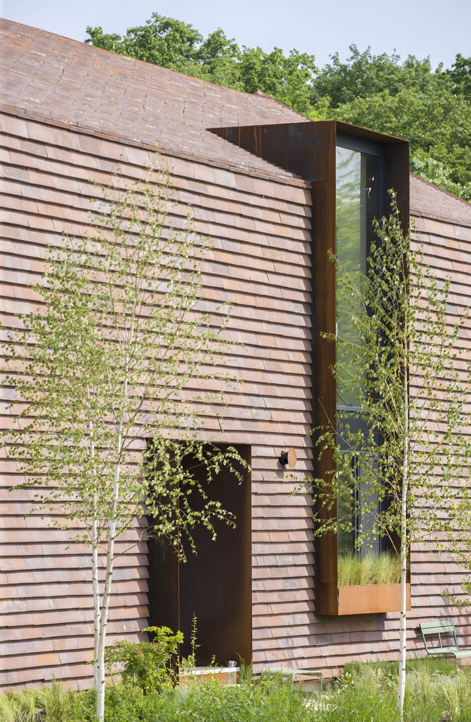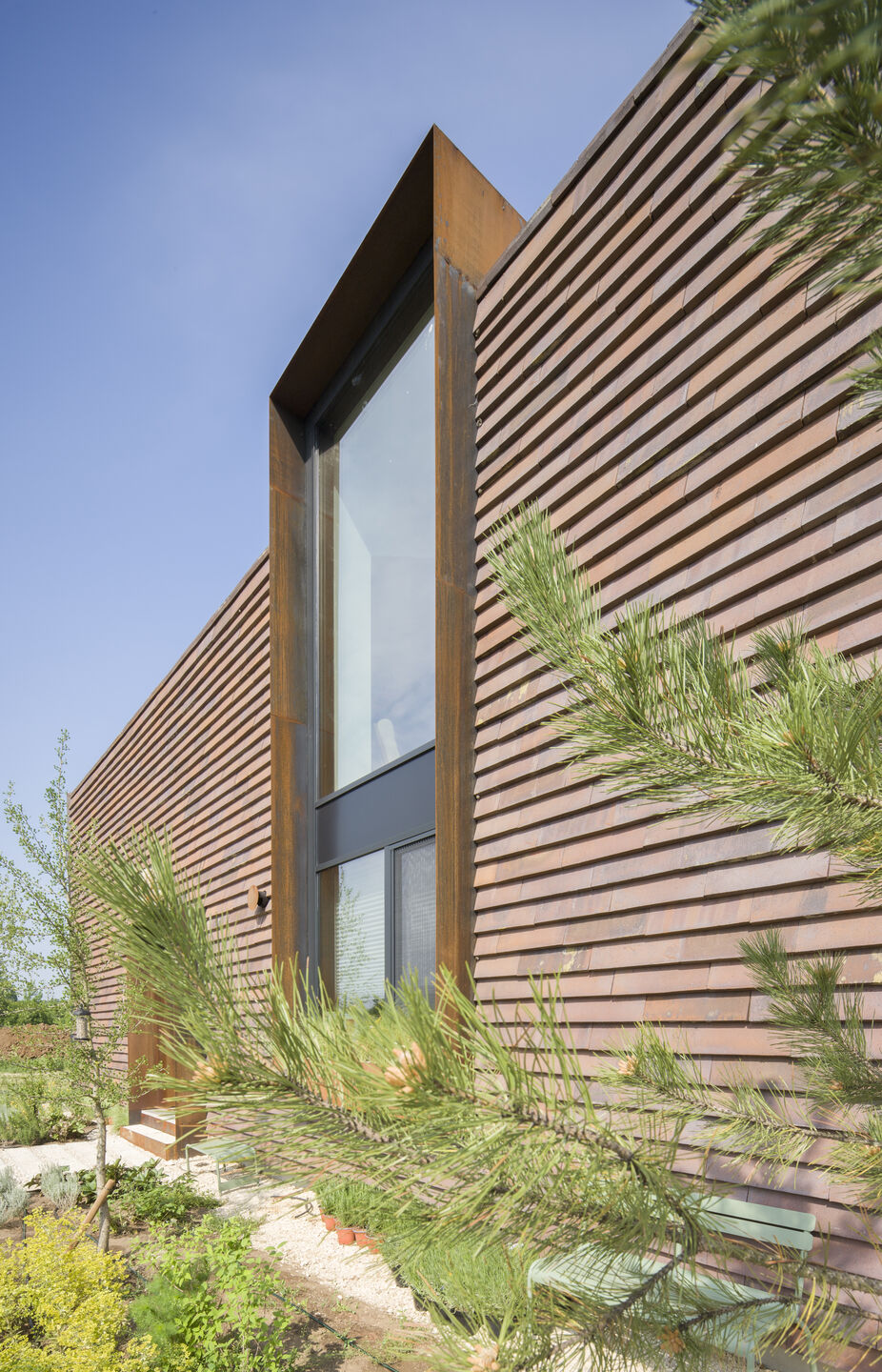 Podejściem architekta przy tworzeniu tego projektu było myślenie o prostych, zwięzłych i funkcjonalnych bryłach. Tak powstała Casa FUS z elewacjami i dachem wykonanymi z ceglanego gontu.