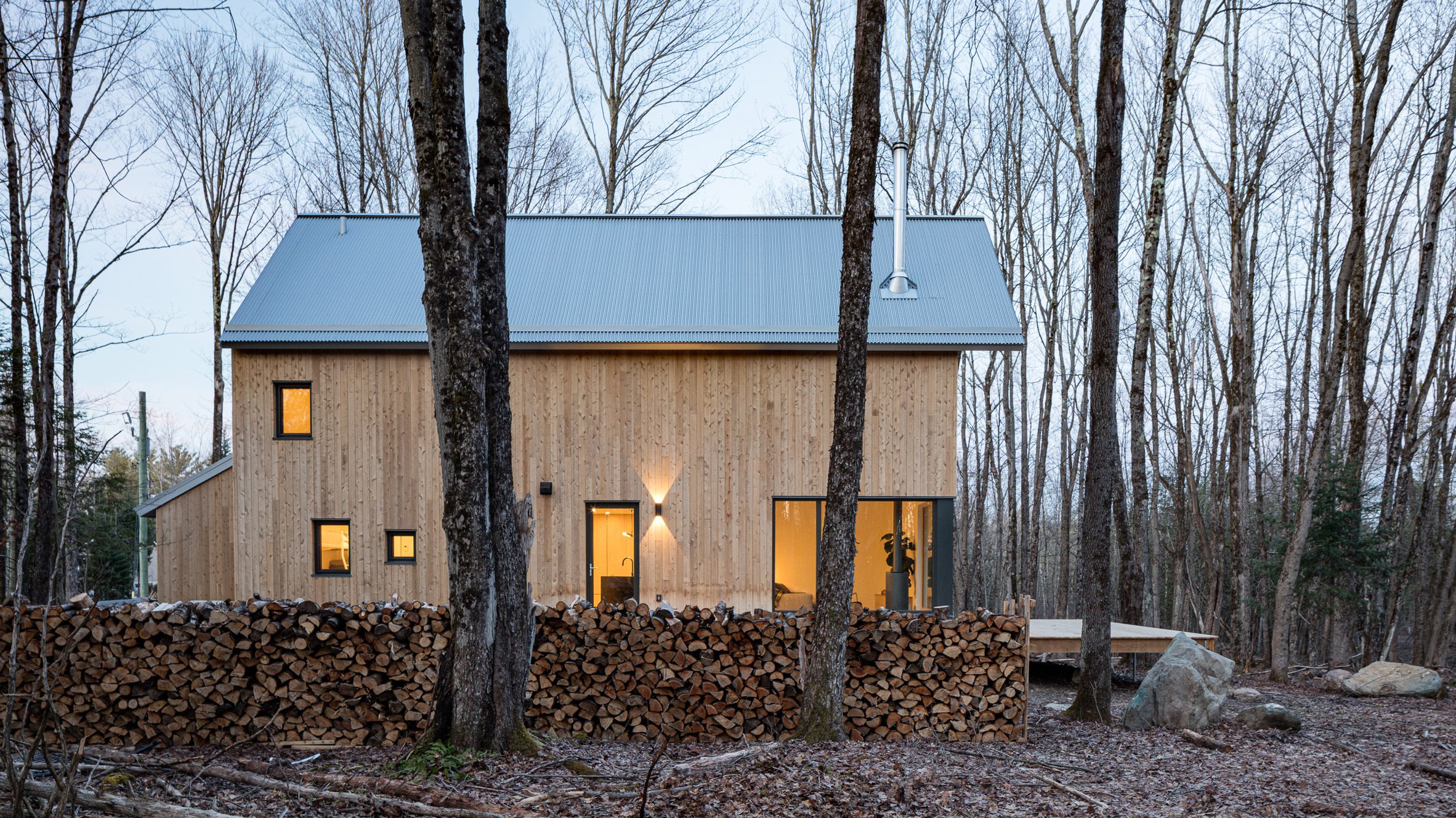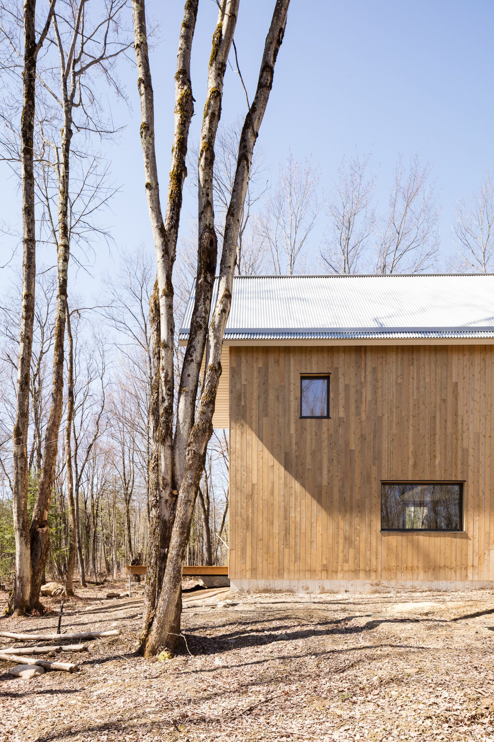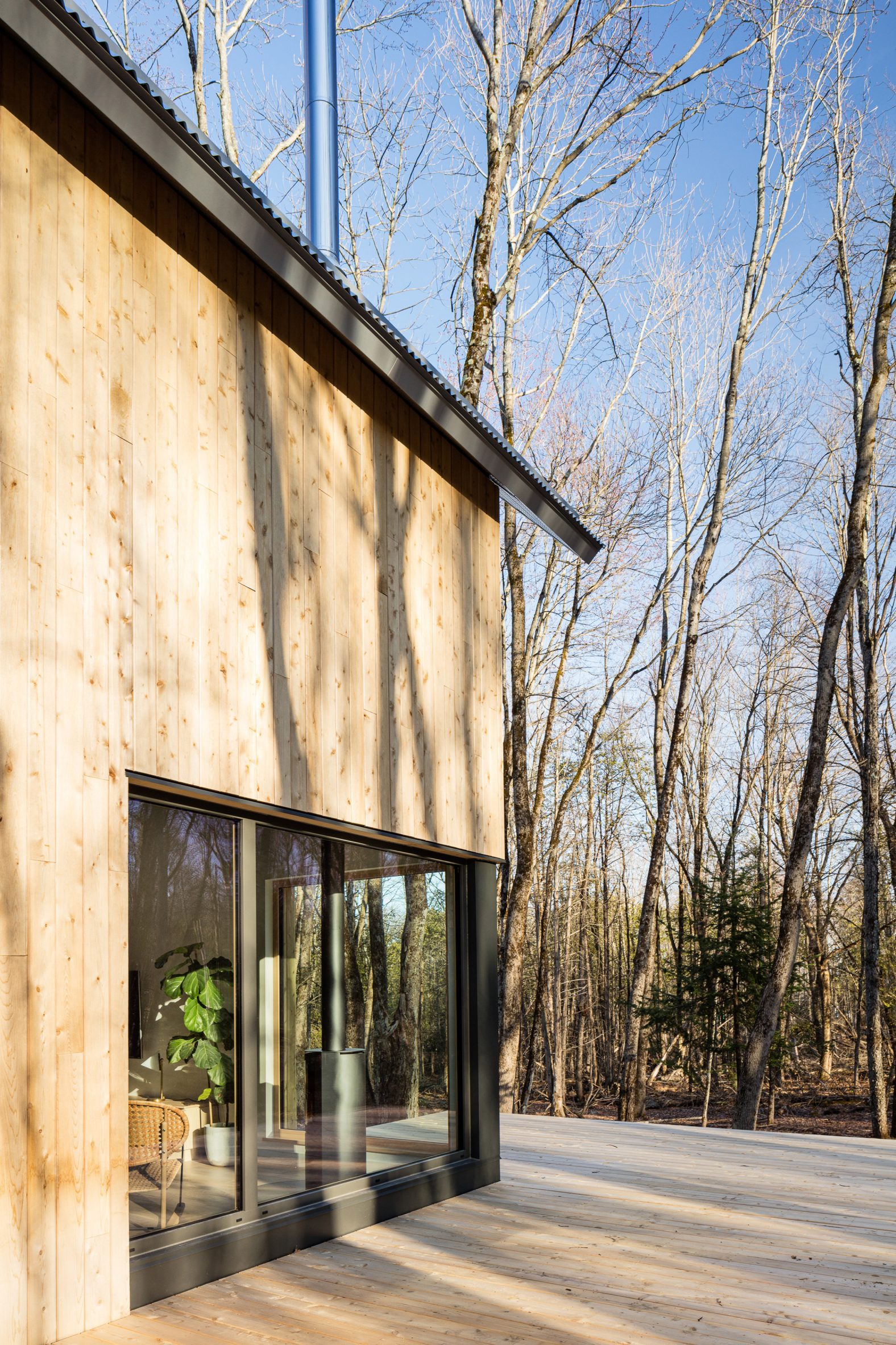 Pomimo swojej wielkości, architekt umieścił w domu trzy sypialnie, dwie łazienki… a nawet saunę! Nazwany Chalet Pic-Bois (Woodpecker Cottage) obiekt położony jest w pobliżu jeziora Brome, popularnego miejsca do uprawiania narciarstwa i wędrówek poza Montrealem. Wejście do pokrytej cedrem nowoczesnej STODOŁY znajduje się od strony północnej, gdzie zadaszony portyk chroni szklane drzwi pełnej wysokości.
