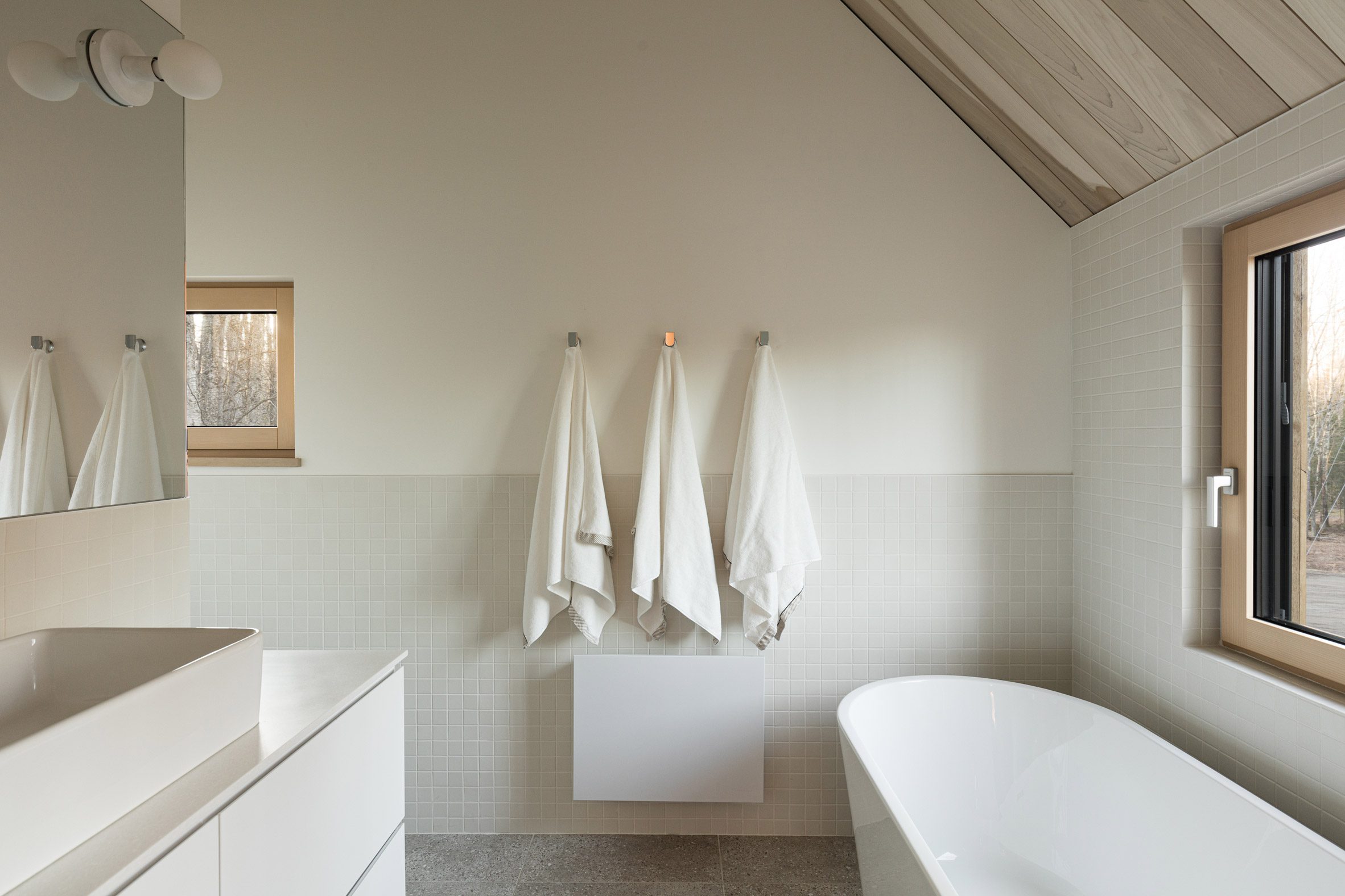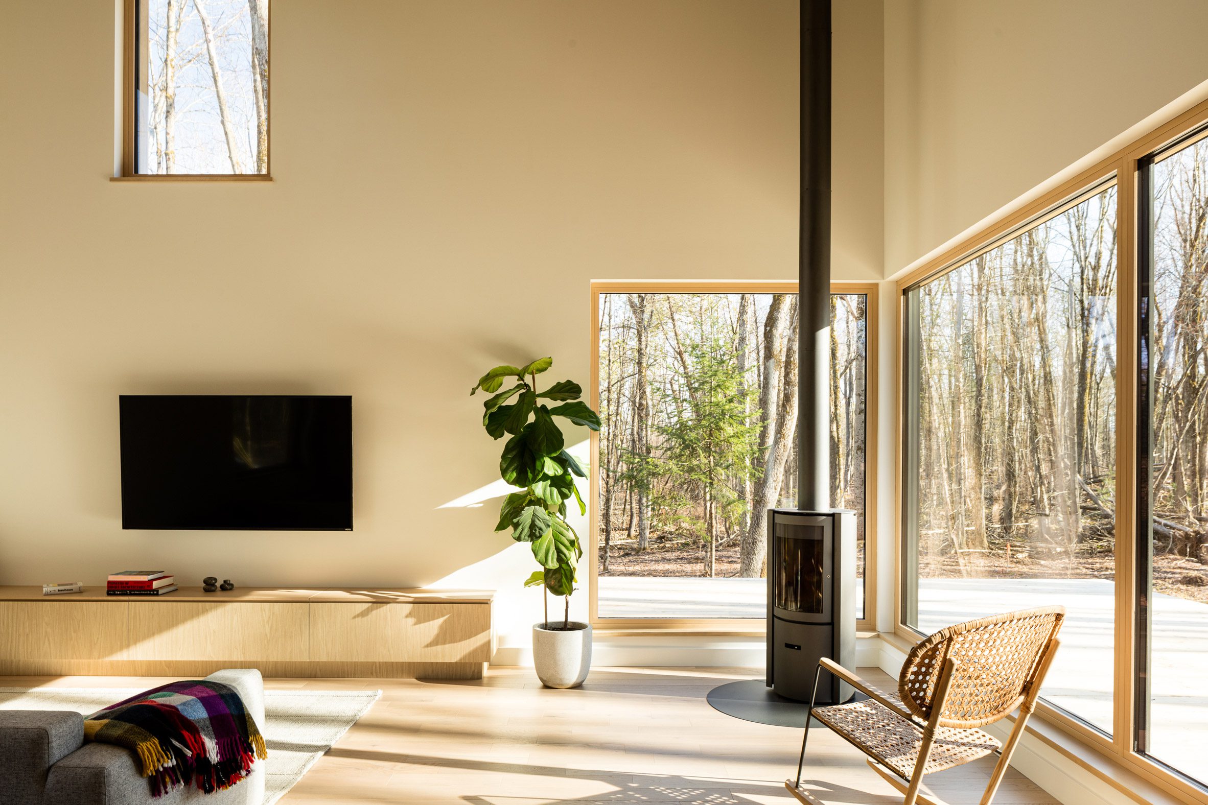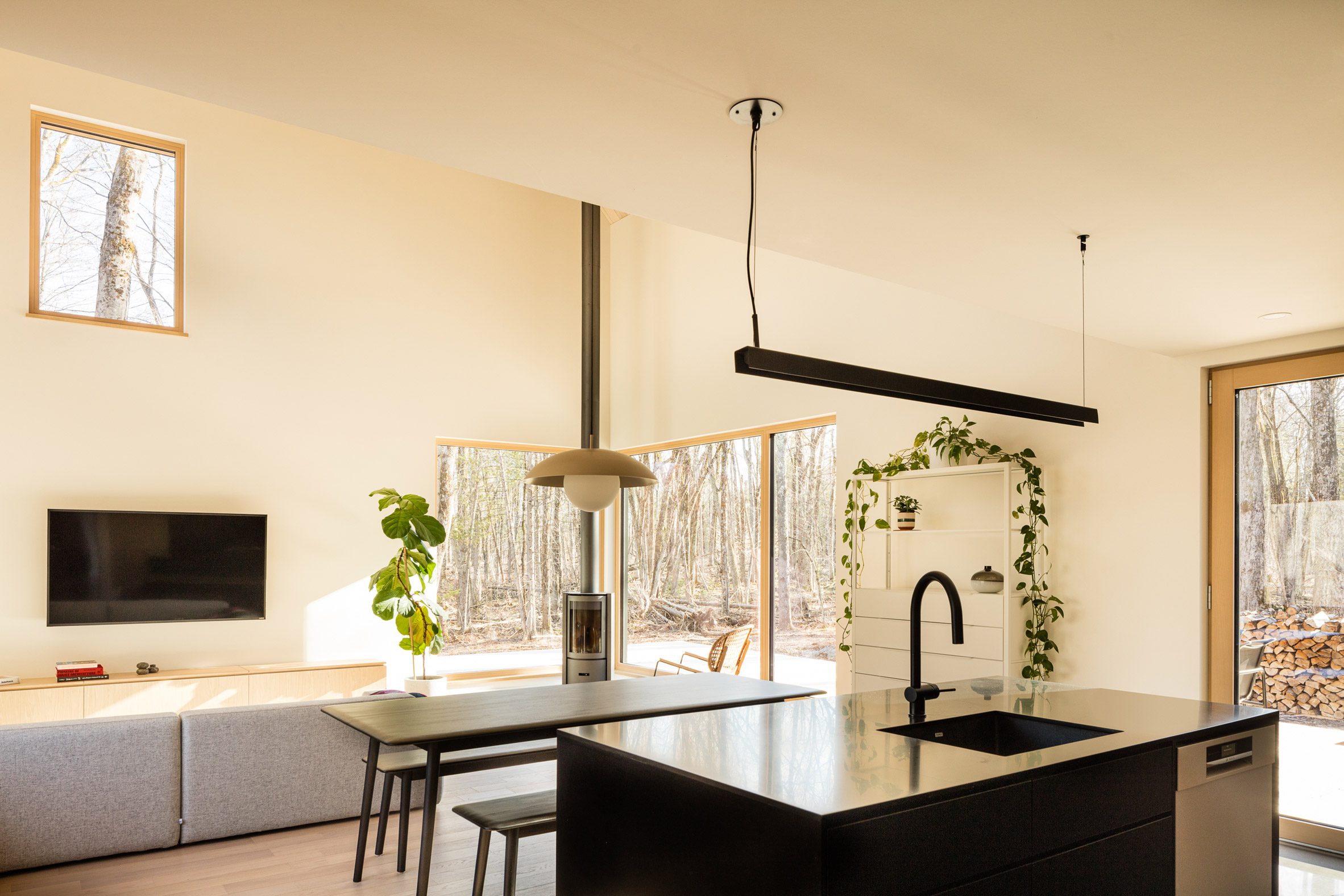 Paleta wnętrz obejmuje drewno, neutralne i czarne odcienie. Prosta paleta odcieni jasnego drewna i monochromatyczne akcenty dopełniają projekt, tworząc spokojną atmosferę w tym odosobnionym miejscu. „Deski topolowe pokrywające strop katedry są widoczne w każdym pomieszczeniu na piętrze” – powiedział Handa. „Stwarza to związek między pokojami, jednocześnie sprawiając, że wydają się większe”. W salonie przeszklony narożnik tworzy ciągłość między wnętrzem a zewnętrzem. Przeszklenia oferują obramowane widoki na czerwone klony i drżące osiki otaczające dom.