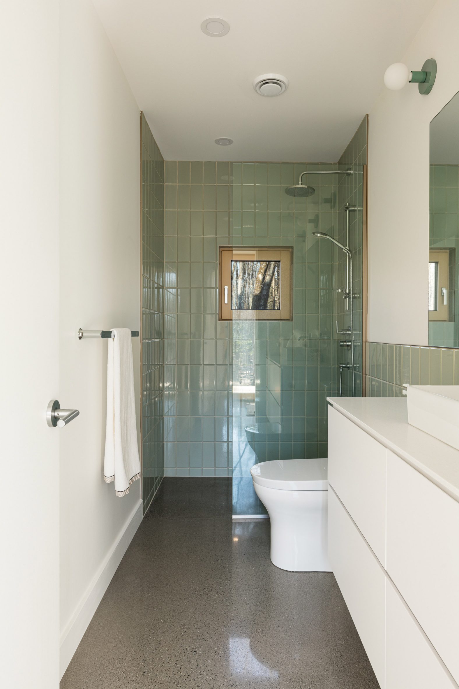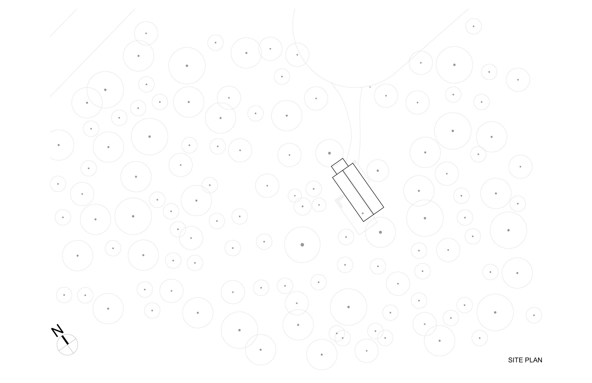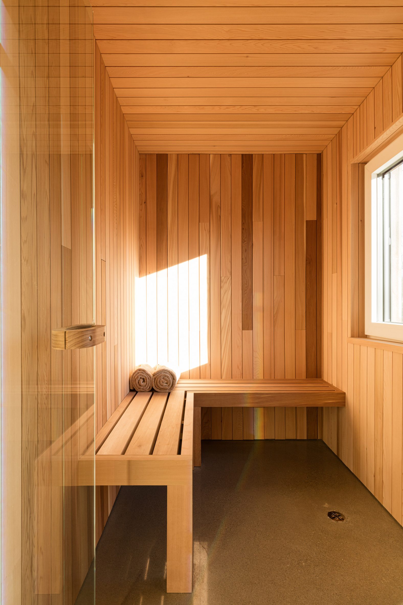 Paleta wnętrz obejmuje drewno, neutralne i czarne odcienie. Prosta paleta odcieni jasnego drewna i monochromatyczne akcenty dopełniają projekt, tworząc spokojną atmosferę w tym odosobnionym miejscu. „Deski topolowe pokrywające strop katedry są widoczne w każdym pomieszczeniu na piętrze” – powiedział Handa. „Stwarza to związek między pokojami, jednocześnie sprawiając, że wydają się większe”. W salonie przeszklony narożnik tworzy ciągłość między wnętrzem a zewnętrzem. Przeszklenia oferują obramowane widoki na czerwone klony i drżące osiki otaczające dom.