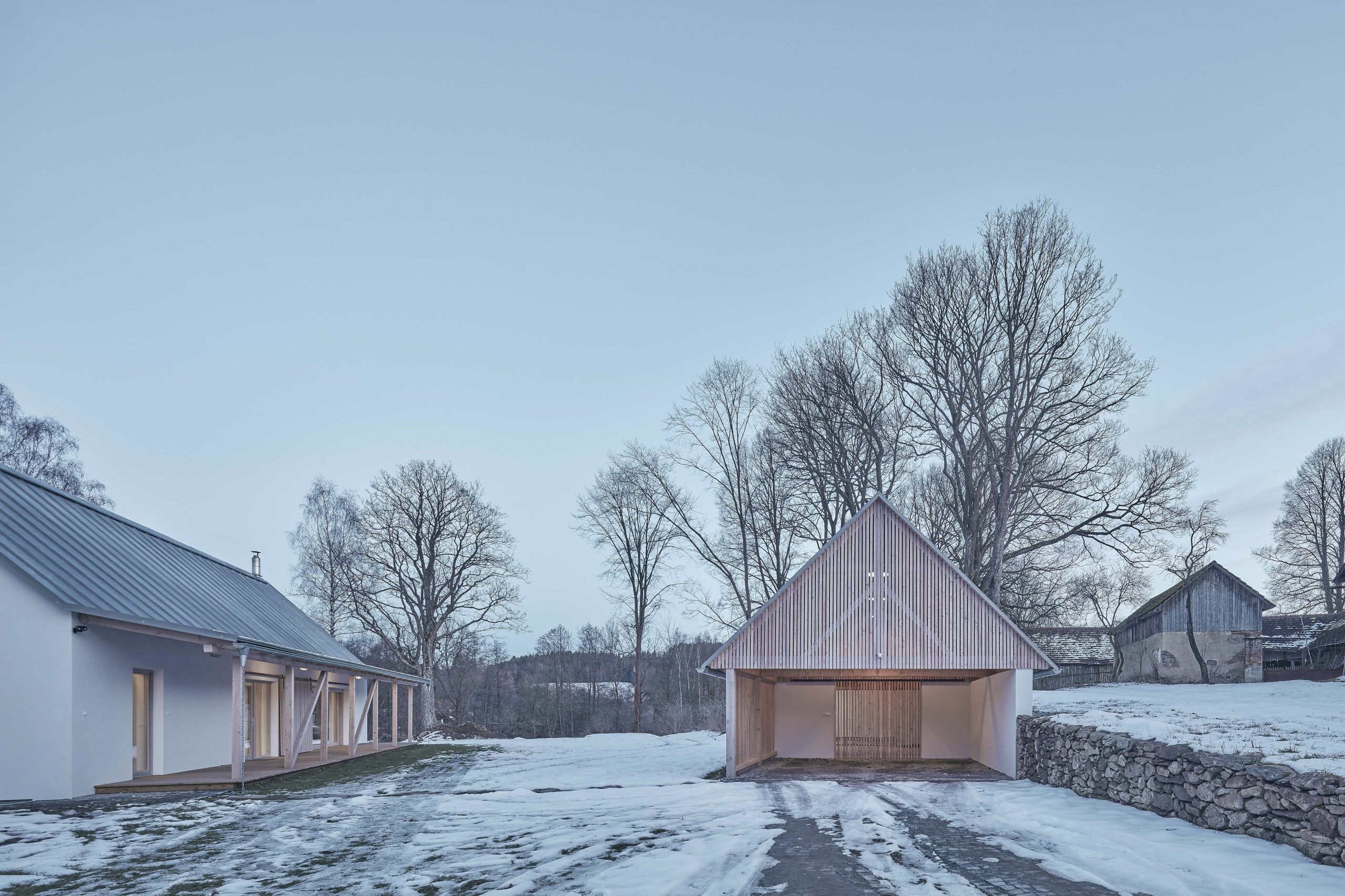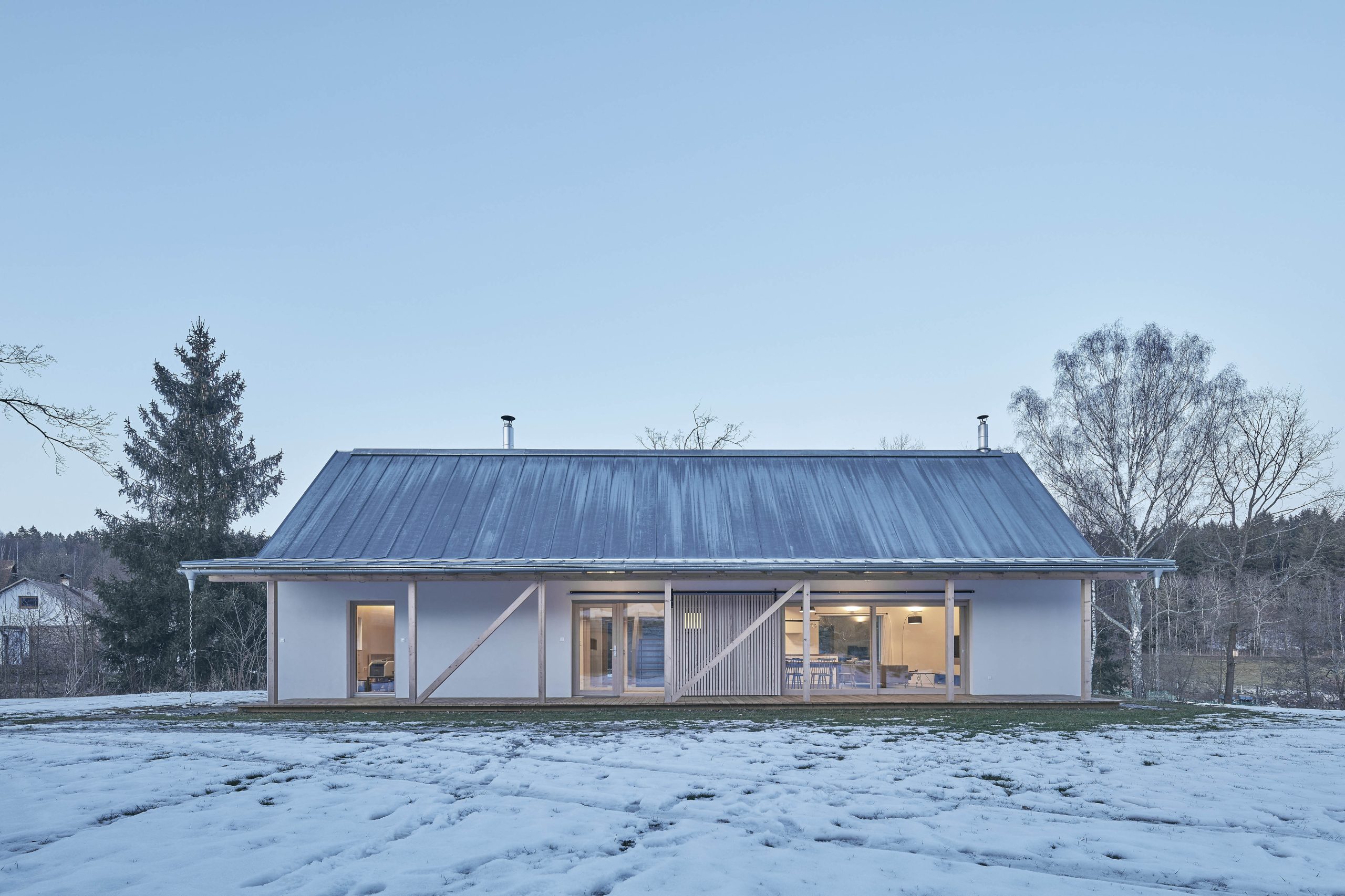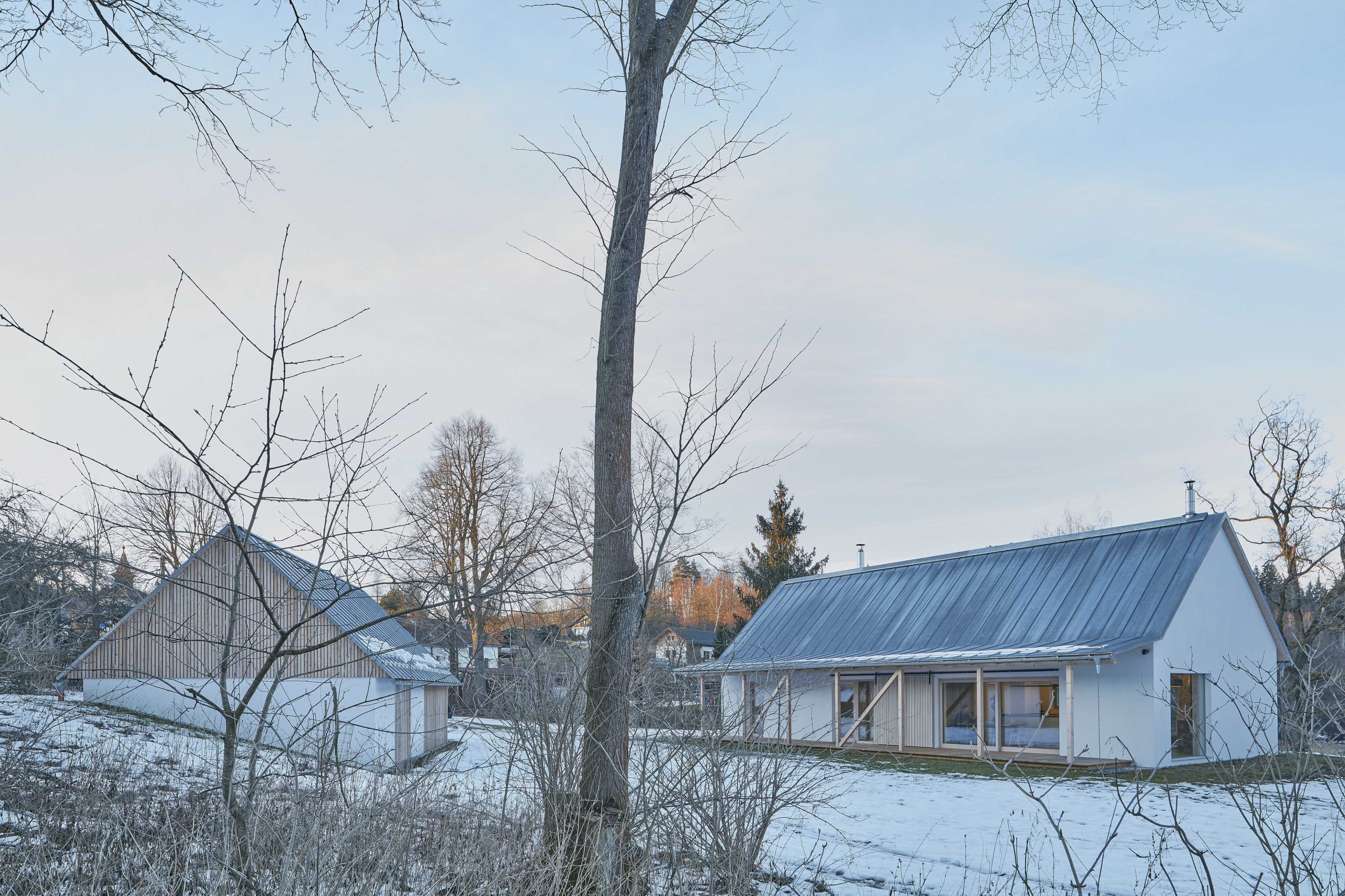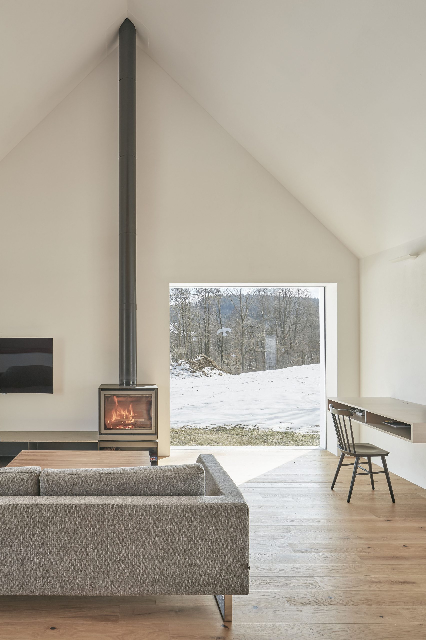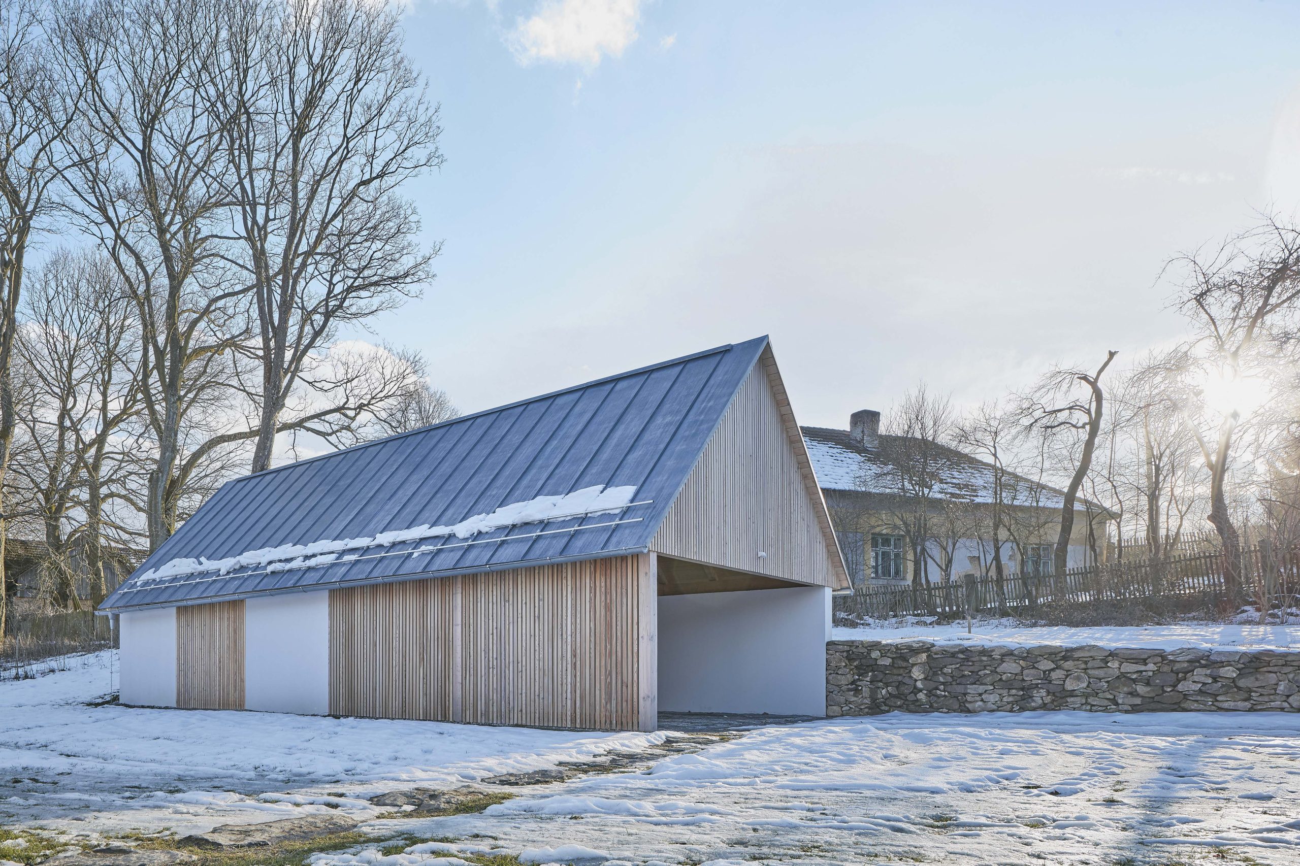 Dodatkowo, bardziej „skromny” budynek gospodarczy pełni funkcję garażu oraz podręcznego magazynu. We wnętrzu, jak i na zewnątrz, architekci połączyli biały tynk z drewnem modrzewiowym i dębowym. „Wizualny spokój nie konkuruje z krajobrazem” – wyjaśniają.
