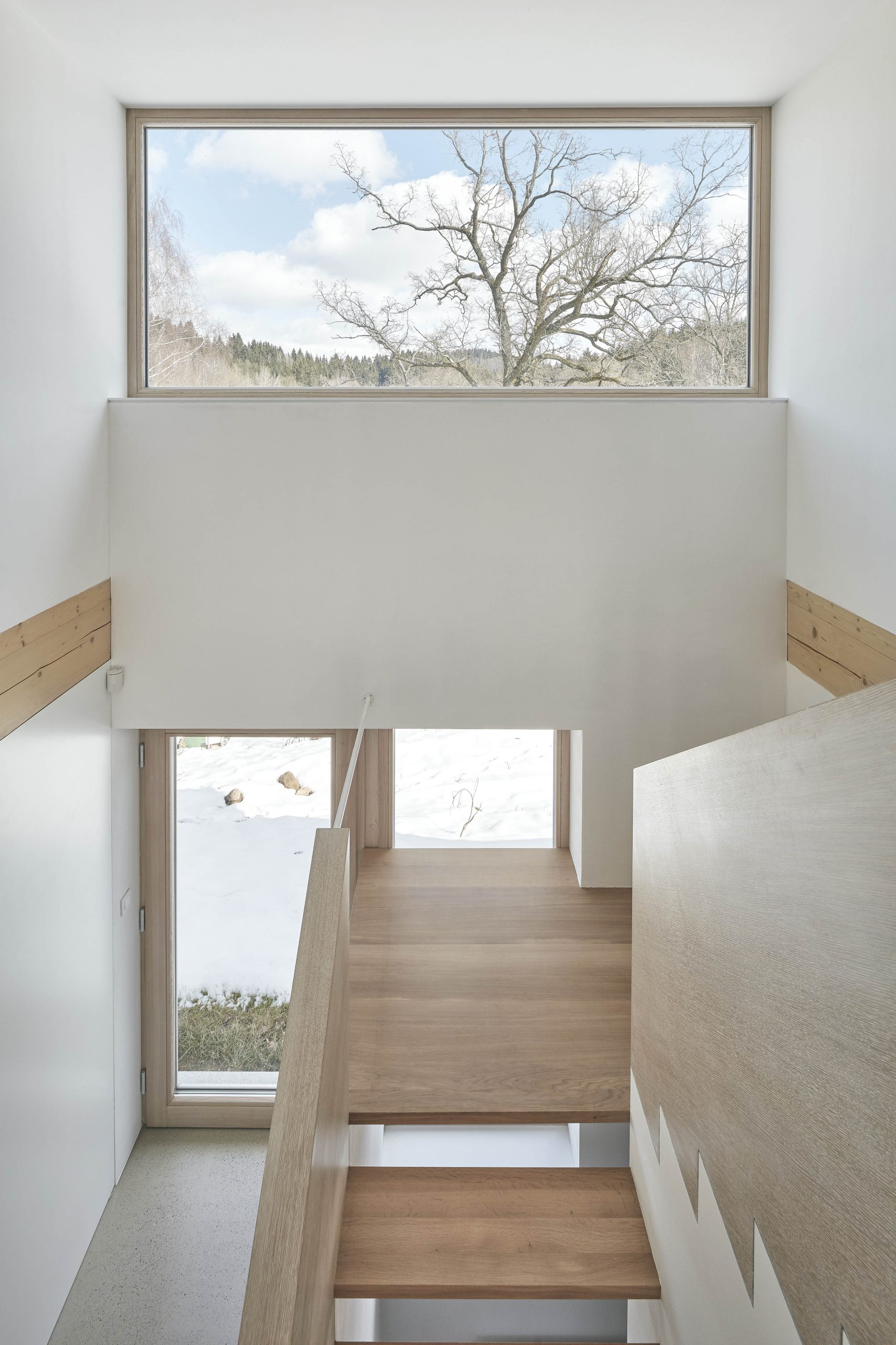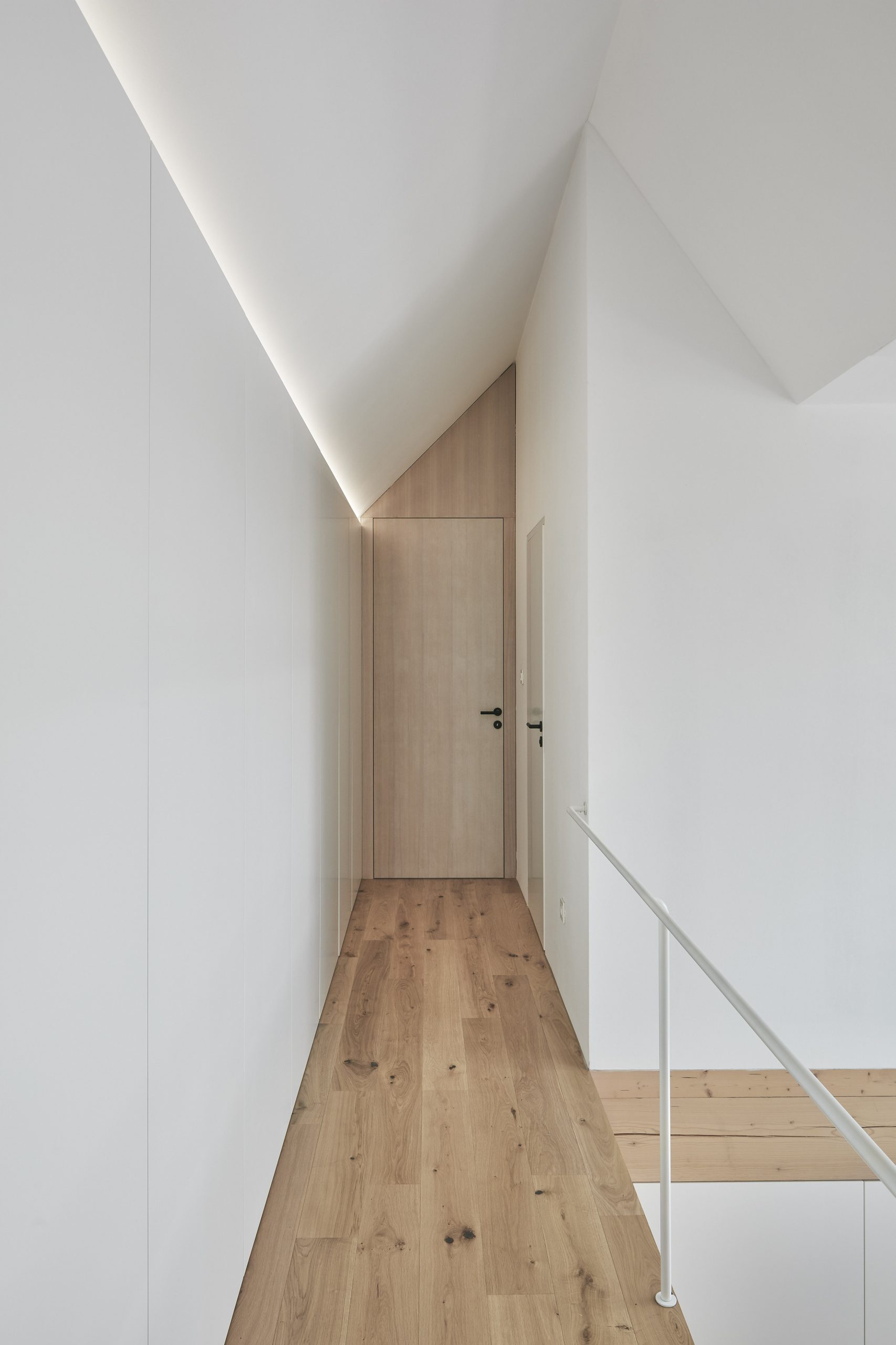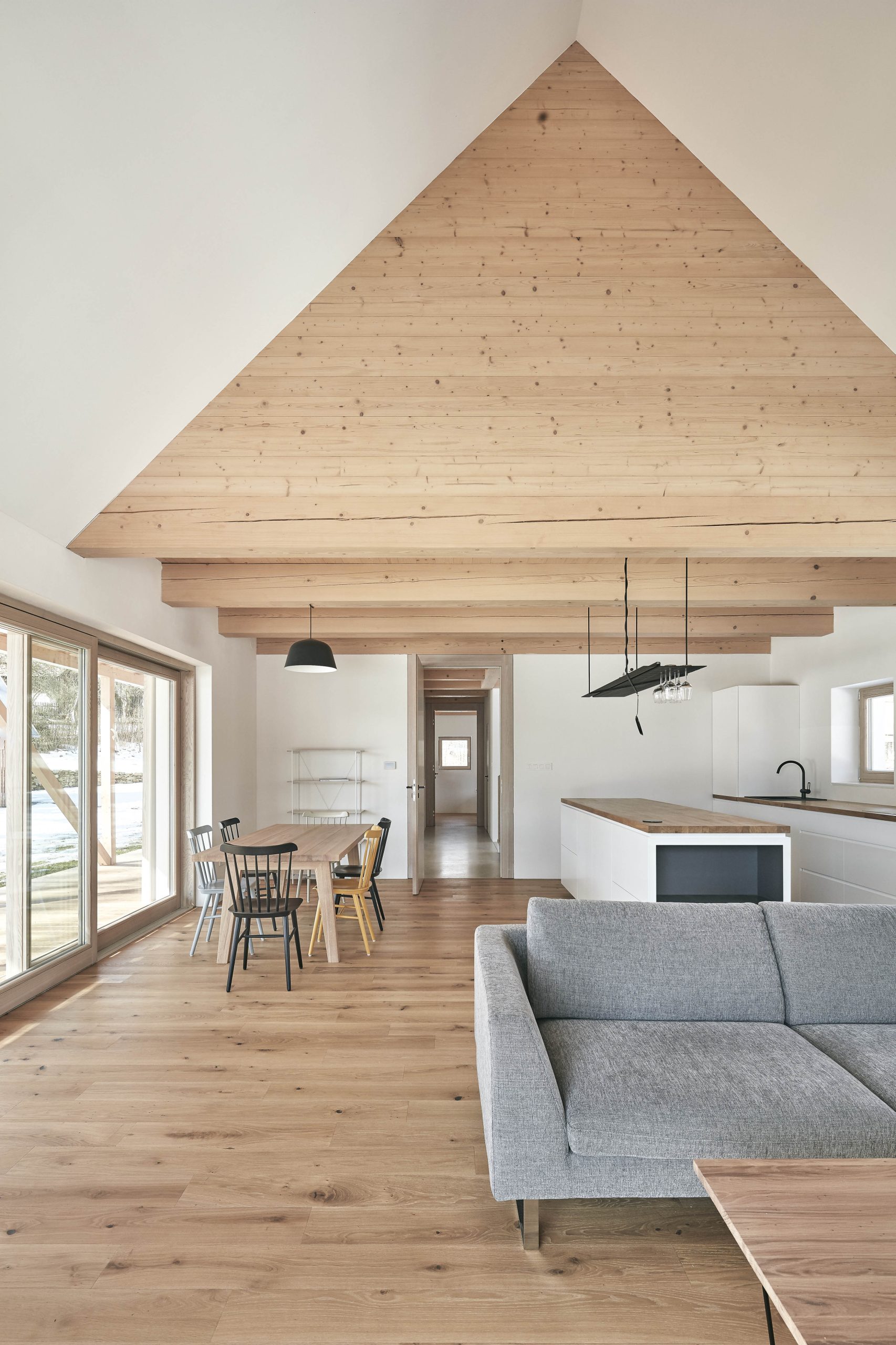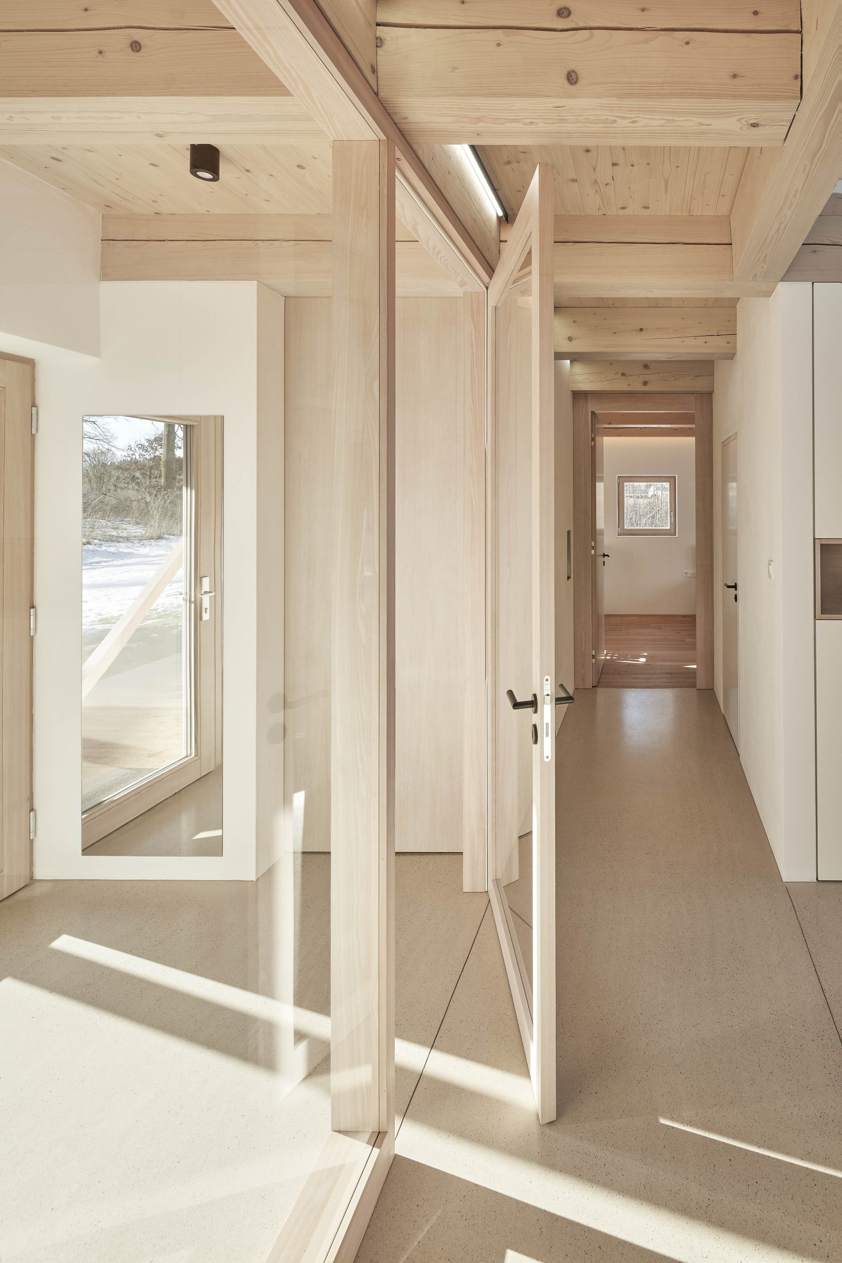 Dodatkowo, bardziej „skromny” budynek gospodarczy pełni funkcję garażu oraz podręcznego magazynu. We wnętrzu, jak i na zewnątrz, architekci połączyli biały tynk z drewnem modrzewiowym i dębowym. „Wizualny spokój nie konkuruje z krajobrazem” – wyjaśniają.