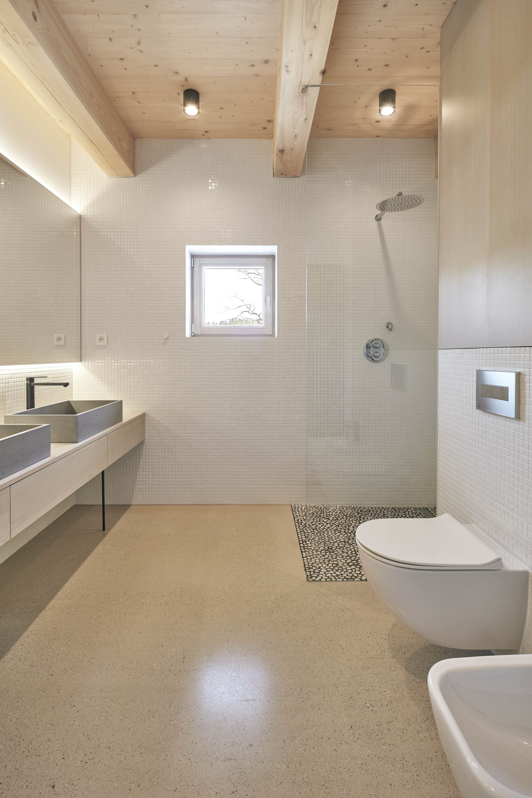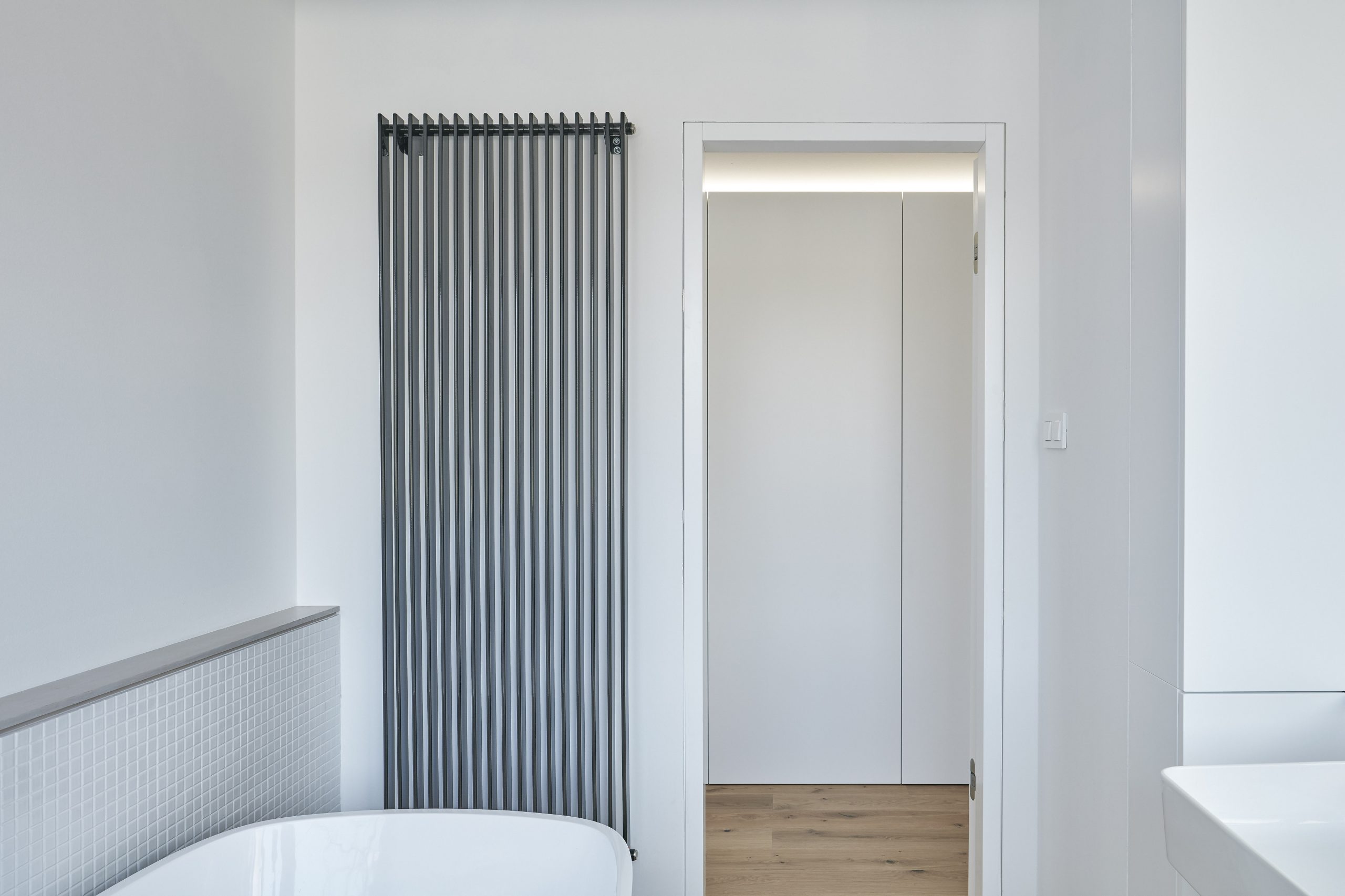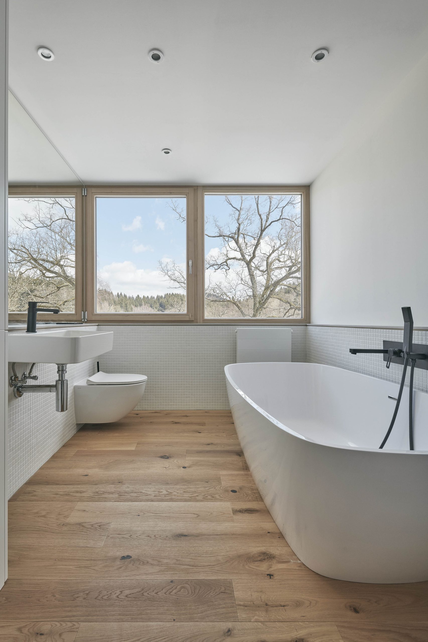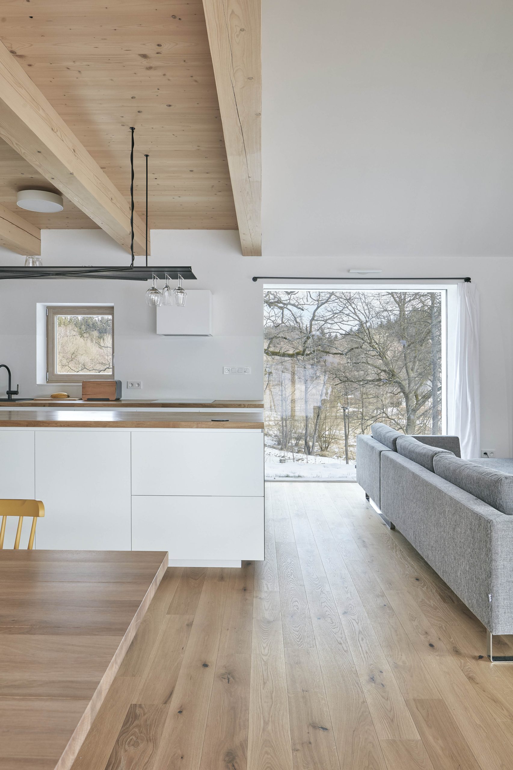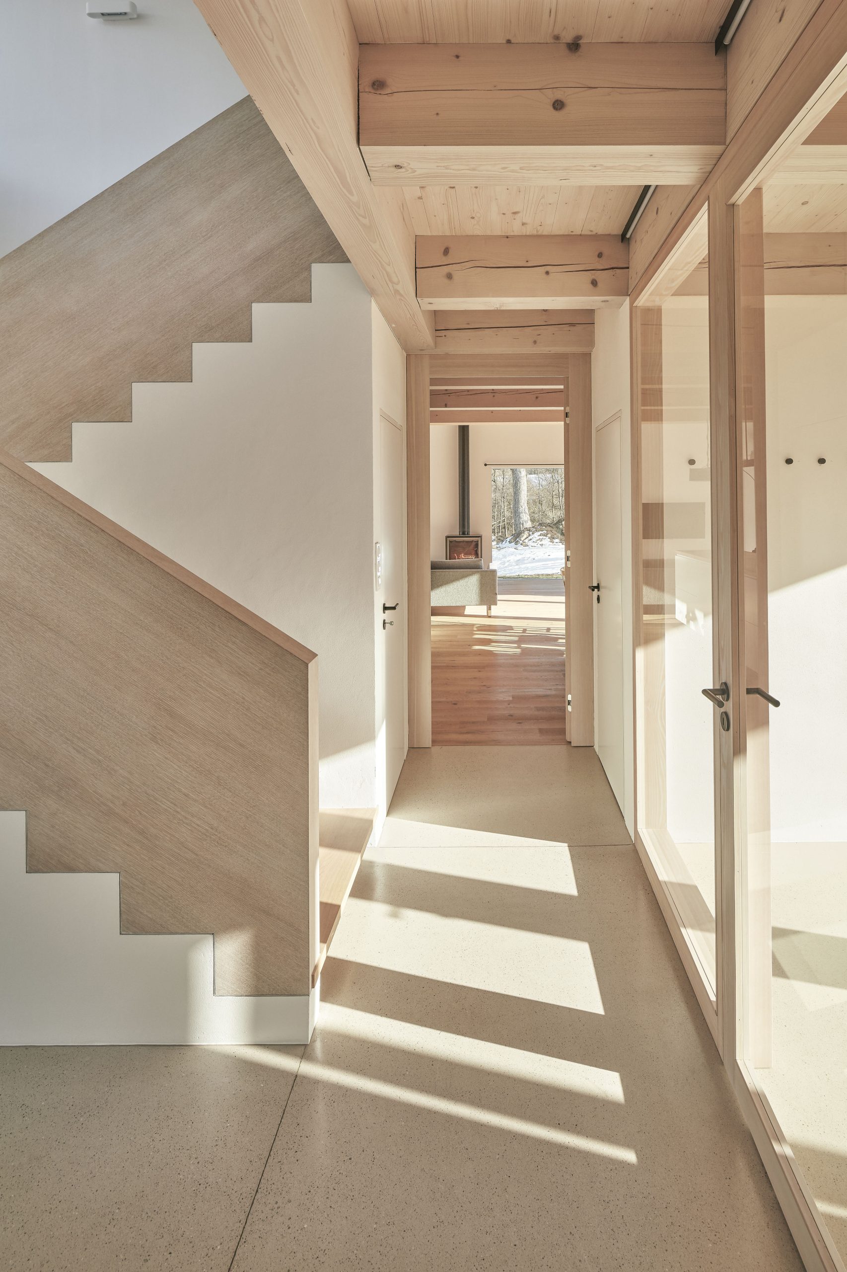 Dodatkowo, bardziej „skromny” budynek gospodarczy pełni funkcję garażu oraz podręcznego magazynu. We wnętrzu, jak i na zewnątrz, architekci połączyli biały tynk z drewnem modrzewiowym i dębowym. „Wizualny spokój nie konkuruje z krajobrazem” – wyjaśniają.