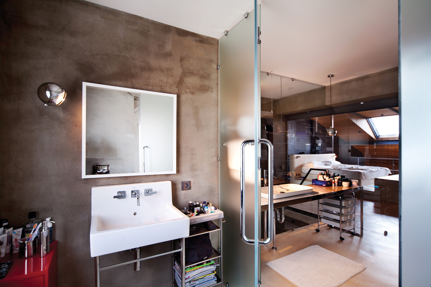 Z kolei antresola ma nieco inny charakter. Jak informują projektanci, wszystkie powierzchnie wykończone są materiałem na bazie cementu, który daje miłe wrażenie, jeśli chodzi się po nim boso. Materiał ten znajduje się nie tylko na podłogach, w tym pod prysznicem, ale także jest wykończeniem bloków, które mieszczą wannę lub łóżko.