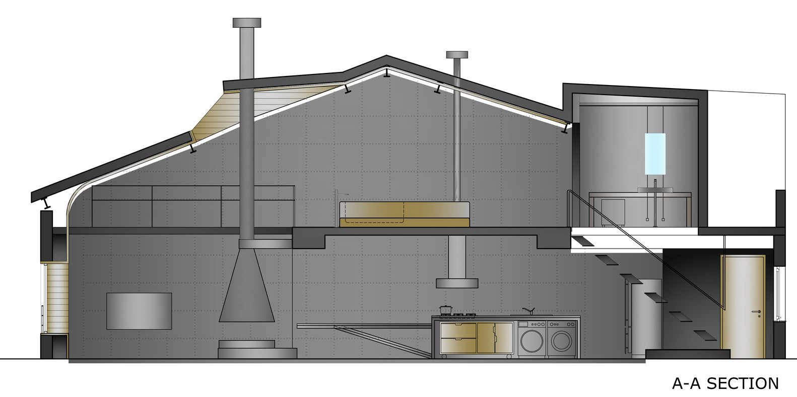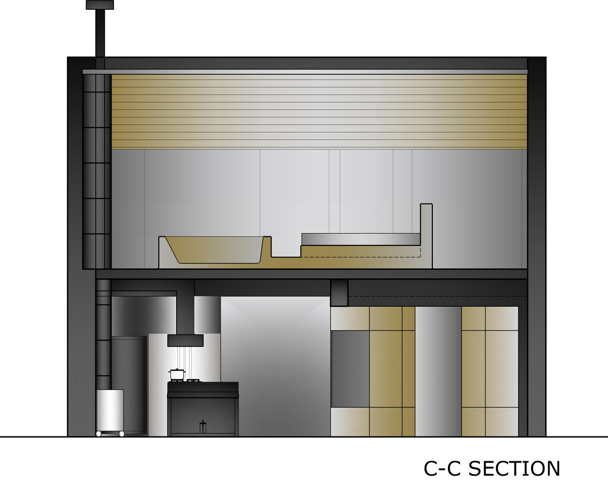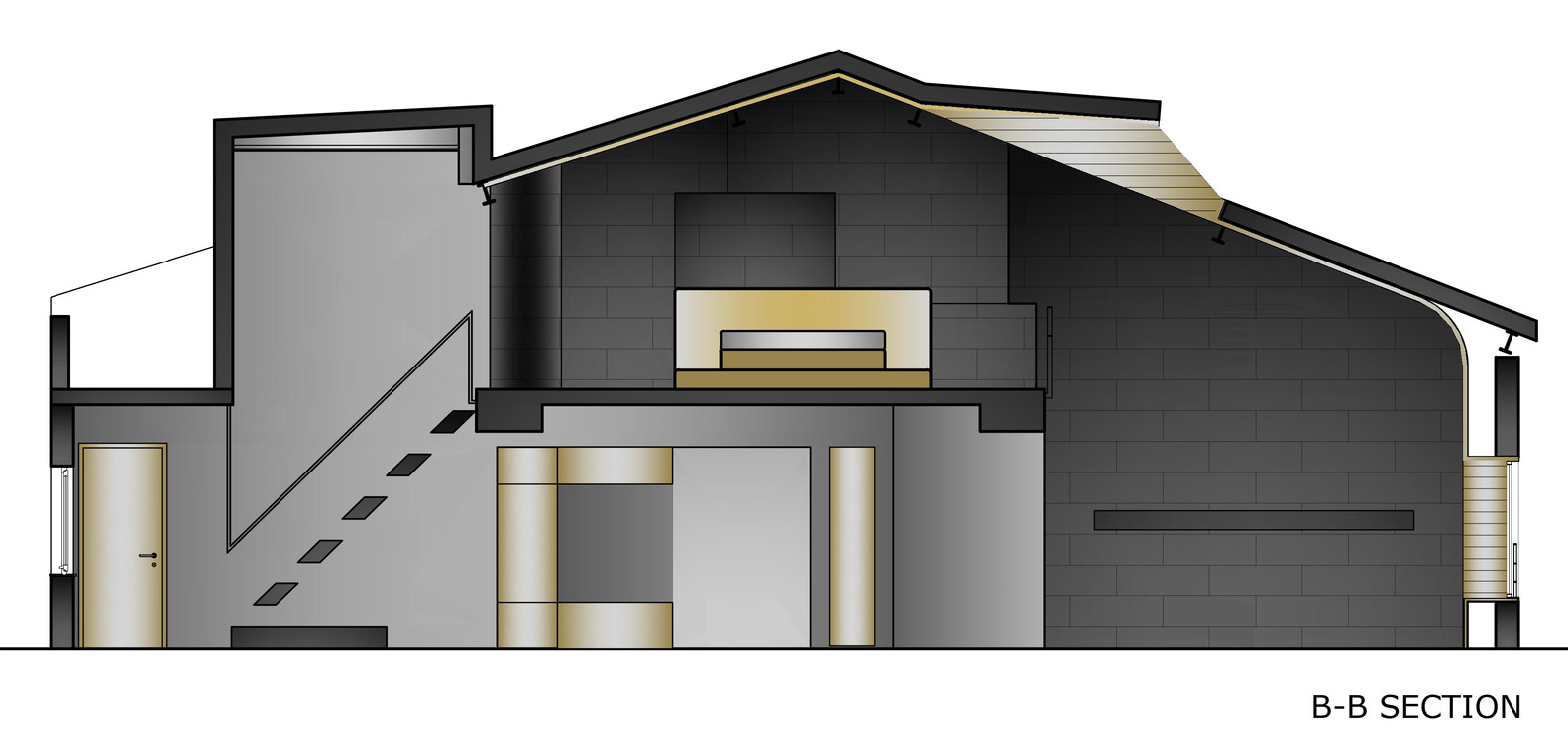 Pod względem konstrukcyjnym twórcy projektu postanowili wprowadzić takie zmiany, które sprawią, że wnętrze stanie się bardziej otwarte i będzie miało więcej naturalnego światła oraz widoków. Małe okna na fasadzie frontowej zostały powiększone, a nowe, składane ramy okien przesuwają się na szerokość budynku, przekształcając salon w balkon, którego w mieszkaniu brakuje. W wyższej części dachu umieszczono z kolei duży, prostokątny świettlik, aby zapewnić światło i widok z antresoli.