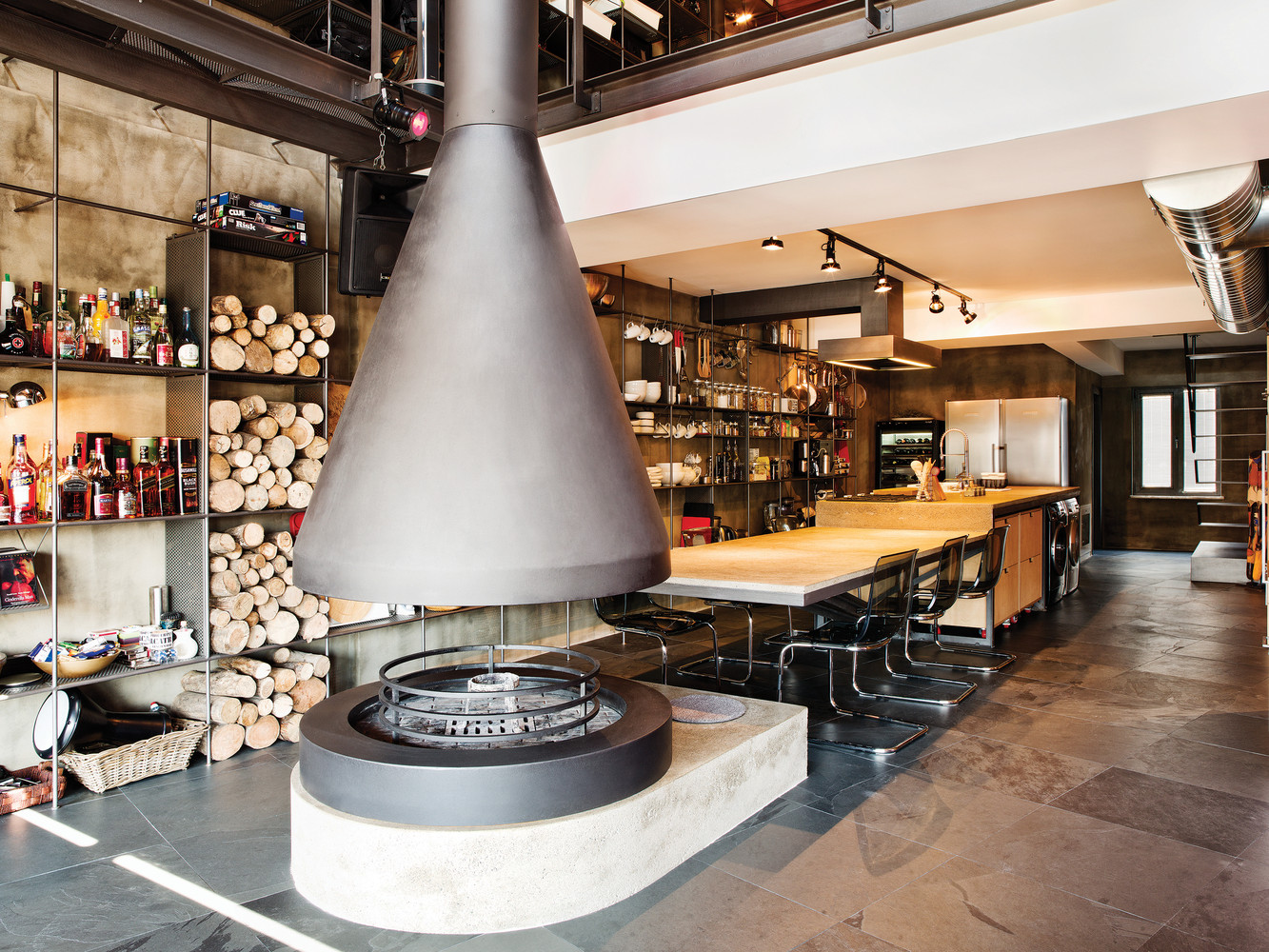 Kolejne oryginalne rozwiązanie to odlewany z betonu blat kuchenny oprawiony w żelazną konstrukcję, który schodzi w dół i tworzy betonowy stół jadalny, a kończy się dopiero jako krótki cokół paleniska, tworząc również dodatkowe miejsca siedzące wokół stołu.