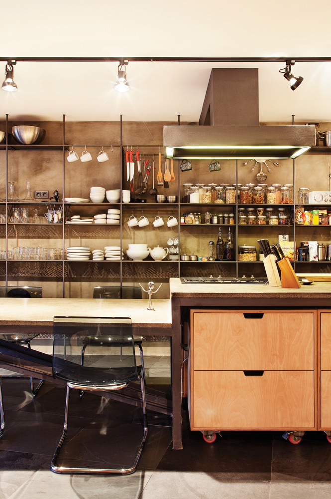 W projekcie nie brakuje jednak wielu ciekawych rozwiązań, czego przykładem jest jedna z podłużnych ścian, która w tym domu została zamieniona w miejsce do przechowywania. Zaprojektowano bardzo prosty system z żelaznymi prętami, sięgającymi na dwa piętra i biegnącymi wzdłuż całej długości mieszkania, bez kategoryzowania na poszczególne przestrzenie, takie jak salon, kuchnia, biblioteka czy sypialnia. Żelazne pręty tworzą siatkę o wymiarach 60 x 60 cm na powierzchni całej ściany. Do tego systemu zaprojektowano różne regały i akcesoria, takie jak półki pojedyncze, półki dwu- lub trzypiętrowe, przegrody pionowe lub moduły wiszące.