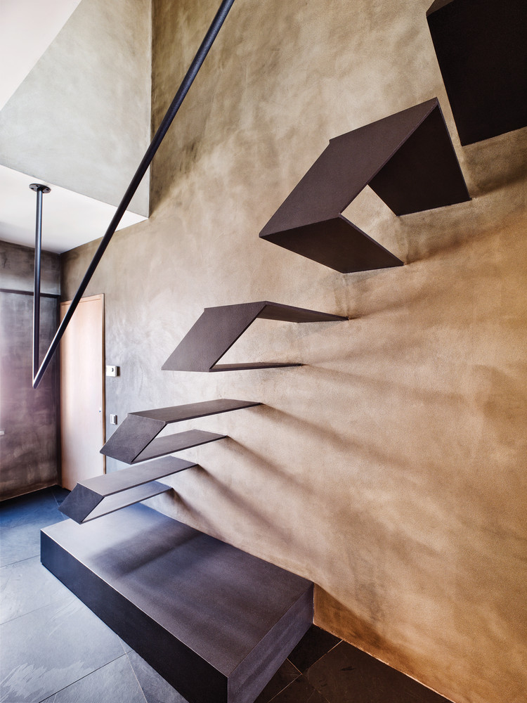 Druga podłużna ściana w mieszkaniu, zwrócona w stronę tego zmiennego systemu przechowywania, została zaprojektowana na zasadzie kontrastu, by zapewnić jak najmniejszy ruch i wizualny spokój. W całości została pokryta naturalnym kamieniem w różnych rozmiarach i zaczyna się w salonie, a ciągnie się aż do sypialni, która znajduje się na poziomie wyższym. Także podłoga na parterze została wykończona ciemnym, naturalnym kamieniem o wymiarach 60x60cm, który jednak został położony pod pewnym kątem, wprowadzając do wnętrza mniej zobowiązujący charakter. Jedynie w sypialni gościnnej, zwróconej w kierunku północnym, kamień na podłodze zastąpiono drewnem.