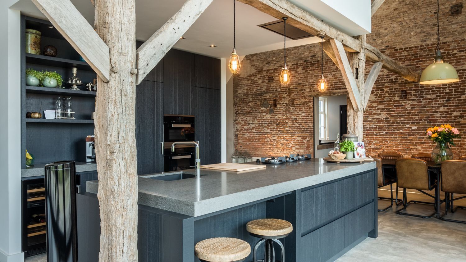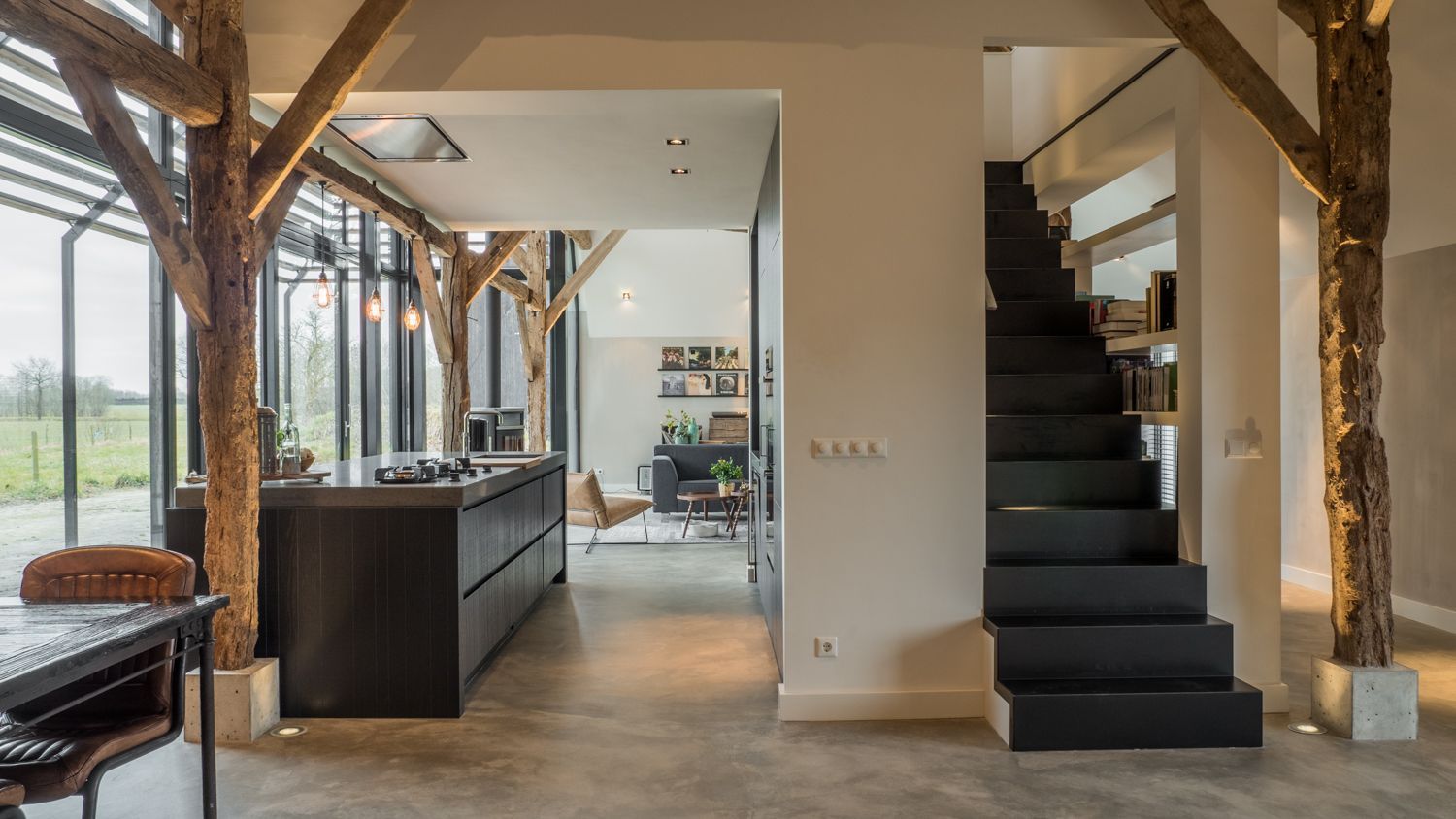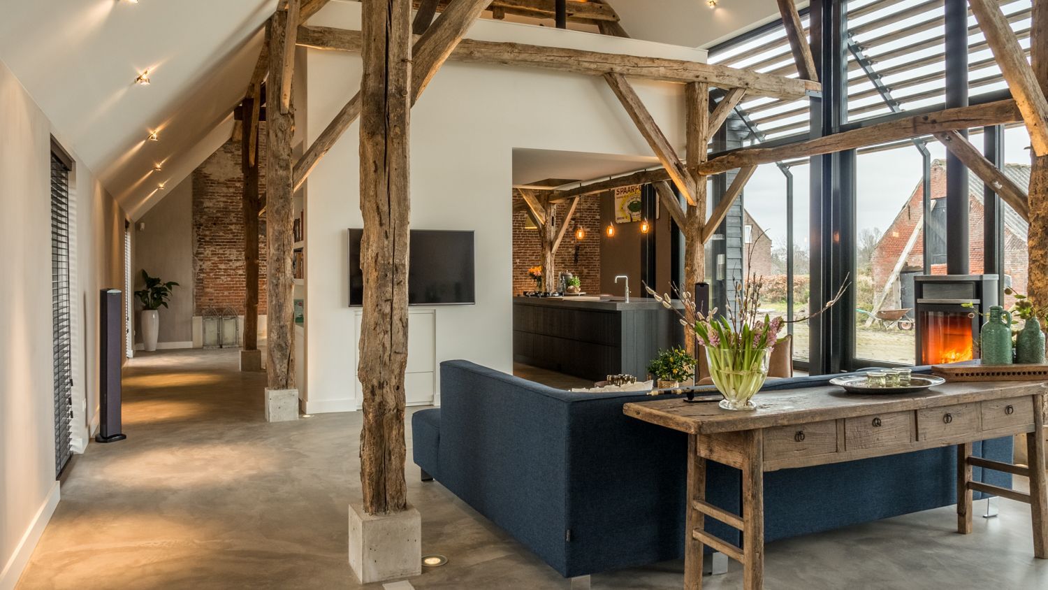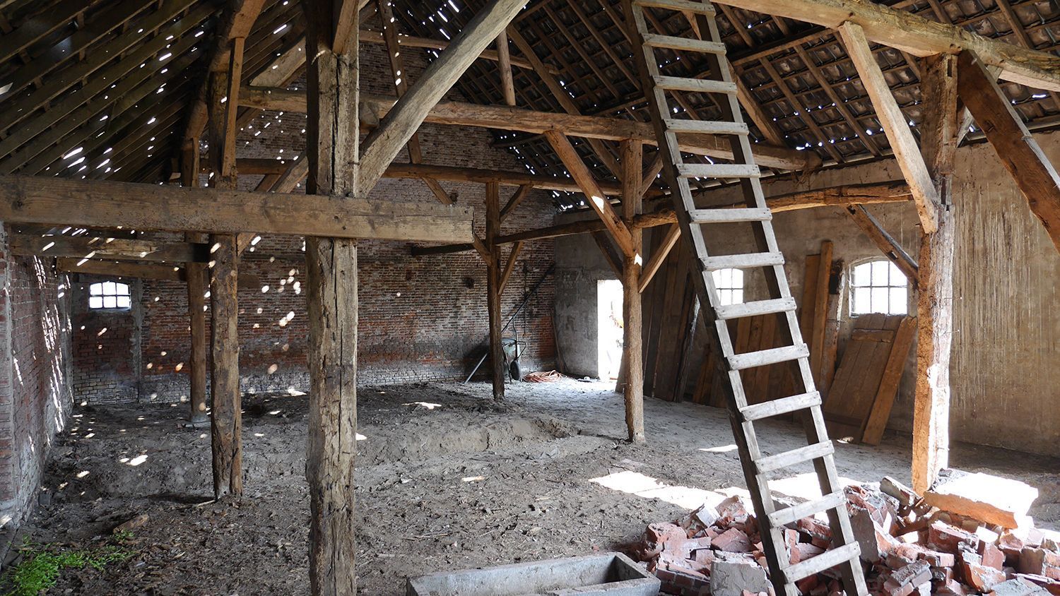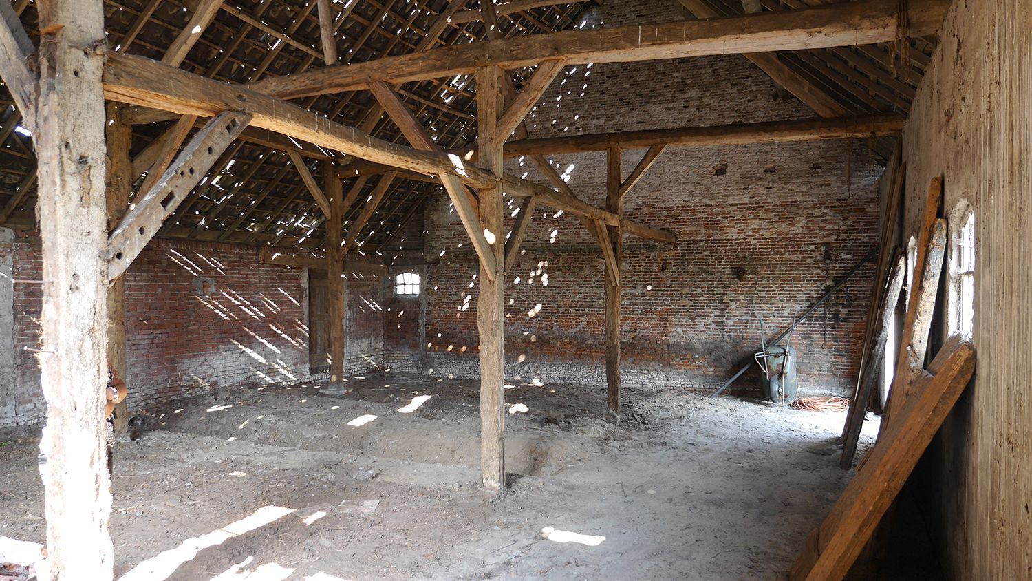 W wyniku działań architektów i budowniczych w miejscu starej stajni powstał salon z otwartą kuchnią, regałami oraz wielofunkcyjną powierzchnią użytkową na górze. Dzięki wstawieniu dużego przeszklenia uzyskano przepiękny widok na okolicę. Zachowanie starych drewnianych kratownic pozwoliło przemycić wiejski klimat w tym eleganckim wnętrzu. Kontrastowa biel połączona z cegłą z odzysku oraz betonem na podłodze i widokiem na kilometry pól uprawnych. Odnowiono cały dach kryty dachówką, odrestaurowano ściany zewnętrzne, podobnie jak parter wewnątrz i drewnianą okładzinę na zewnątrz.