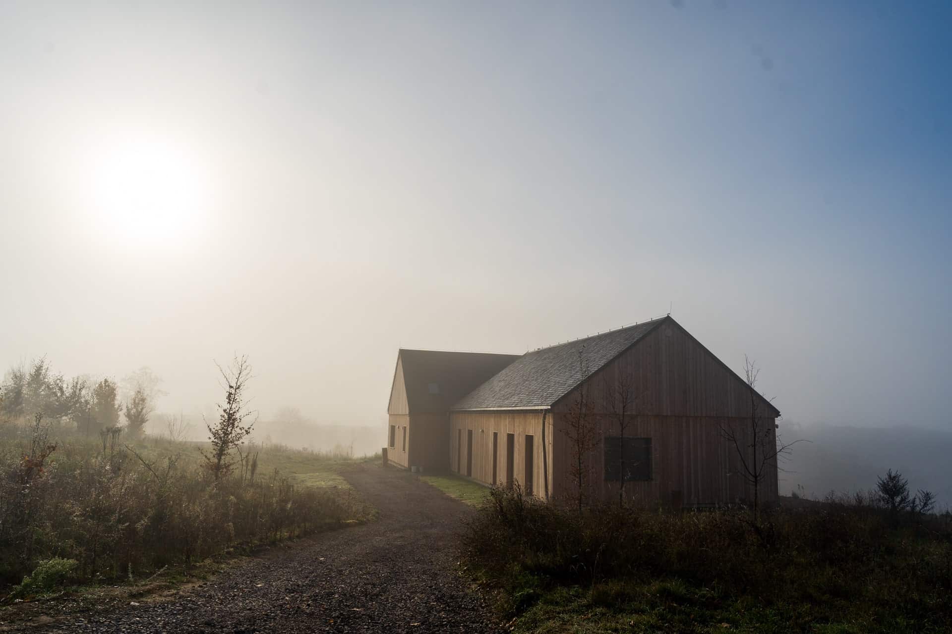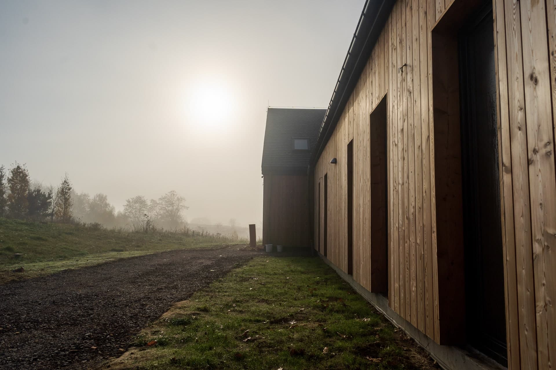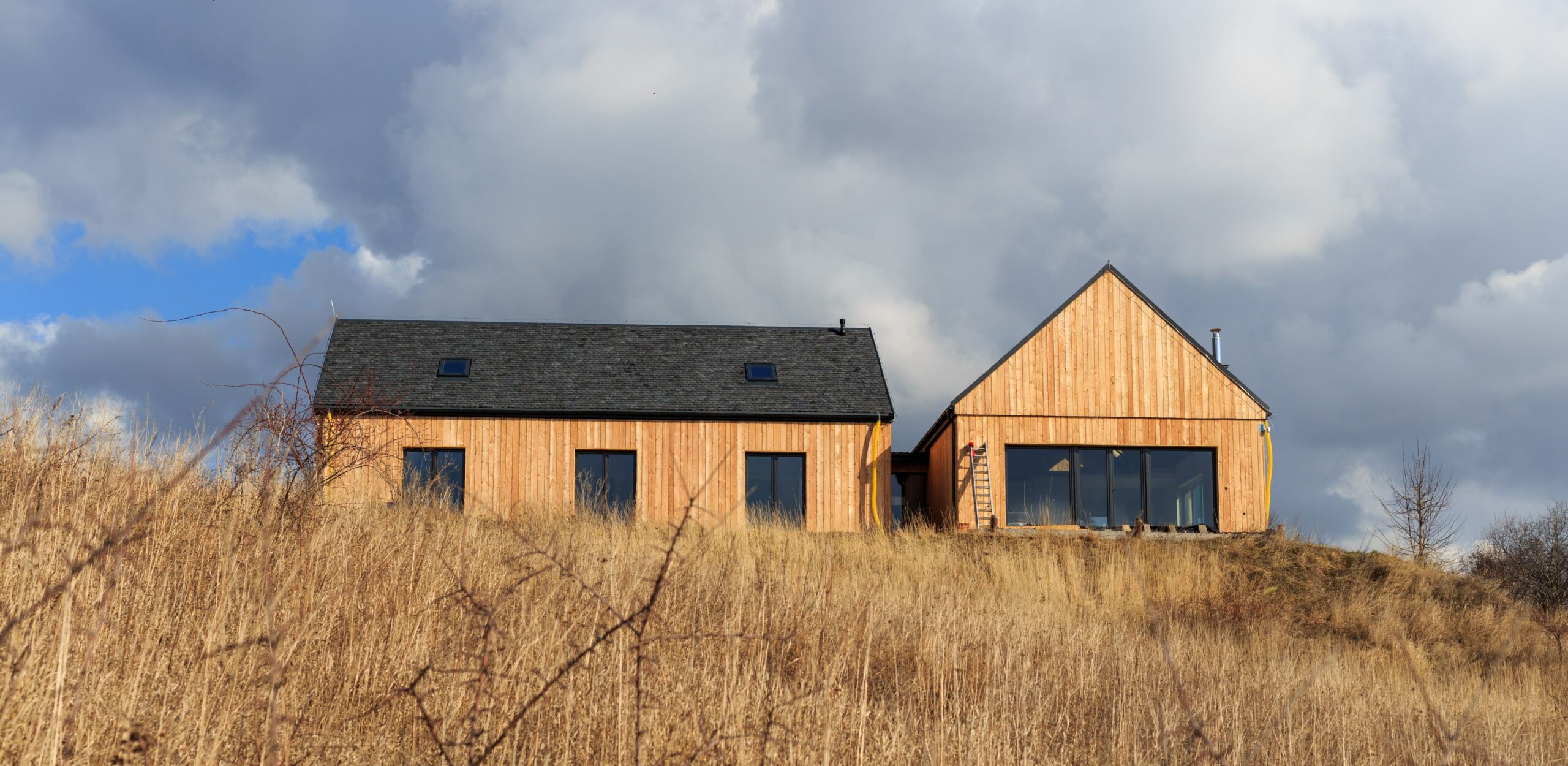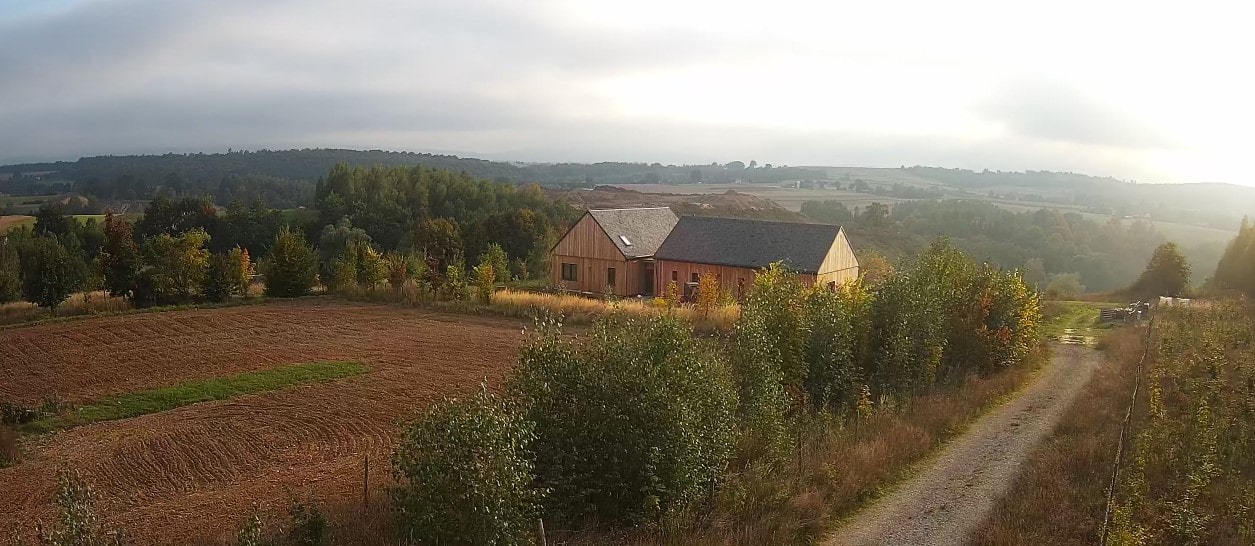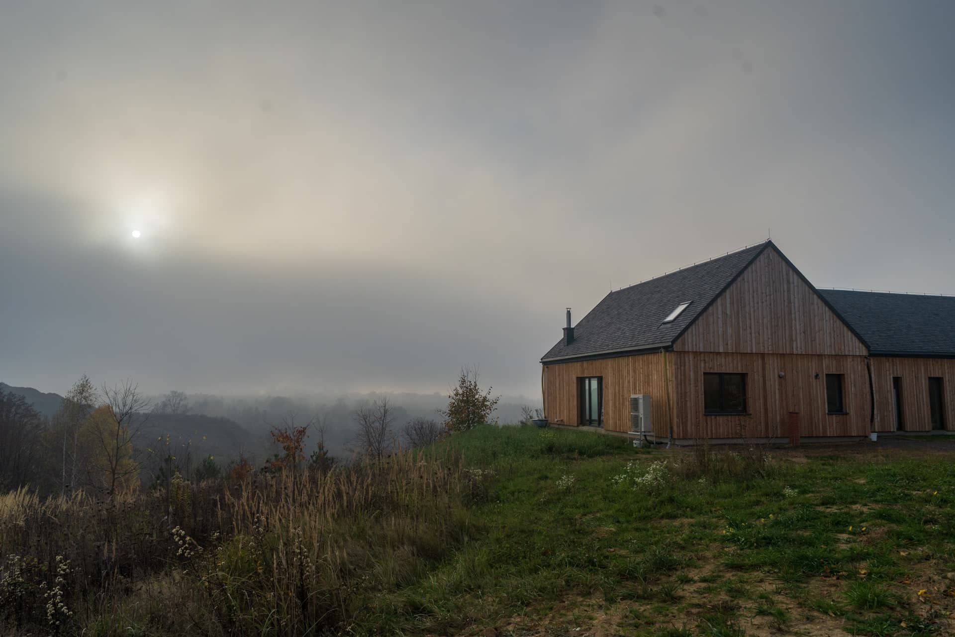 Stworzoną przestrzeń obecnie aranżuje rodzina, która będzie używać jej na co dzień. Budynek: dwie bryły, część dzienna (zorientowana na południowy zachód – z głównym kierunkowym otwarciem widokowym i kuchenna z oknem na wschód) oraz nocna (gwarantująca piękne zachody słońca każdego dnia) połączone zostały łącznikiem wejściowym. Samo lokalizacja budynku, na wzgórzu zapewnia niczym niezaburzone widoki każdego dnia, a „niesprzyjająca” aura pogodowa (mgła, deszcz, itp.) całemu obrazowi dodaje tylko uroku i tajemniczości. Zadaniem architekta nie było stworzenie architektury wyróżniającej się, a architektury współgrającej i nie zaburzającej otoczenia. Sami oceńcie efekty.