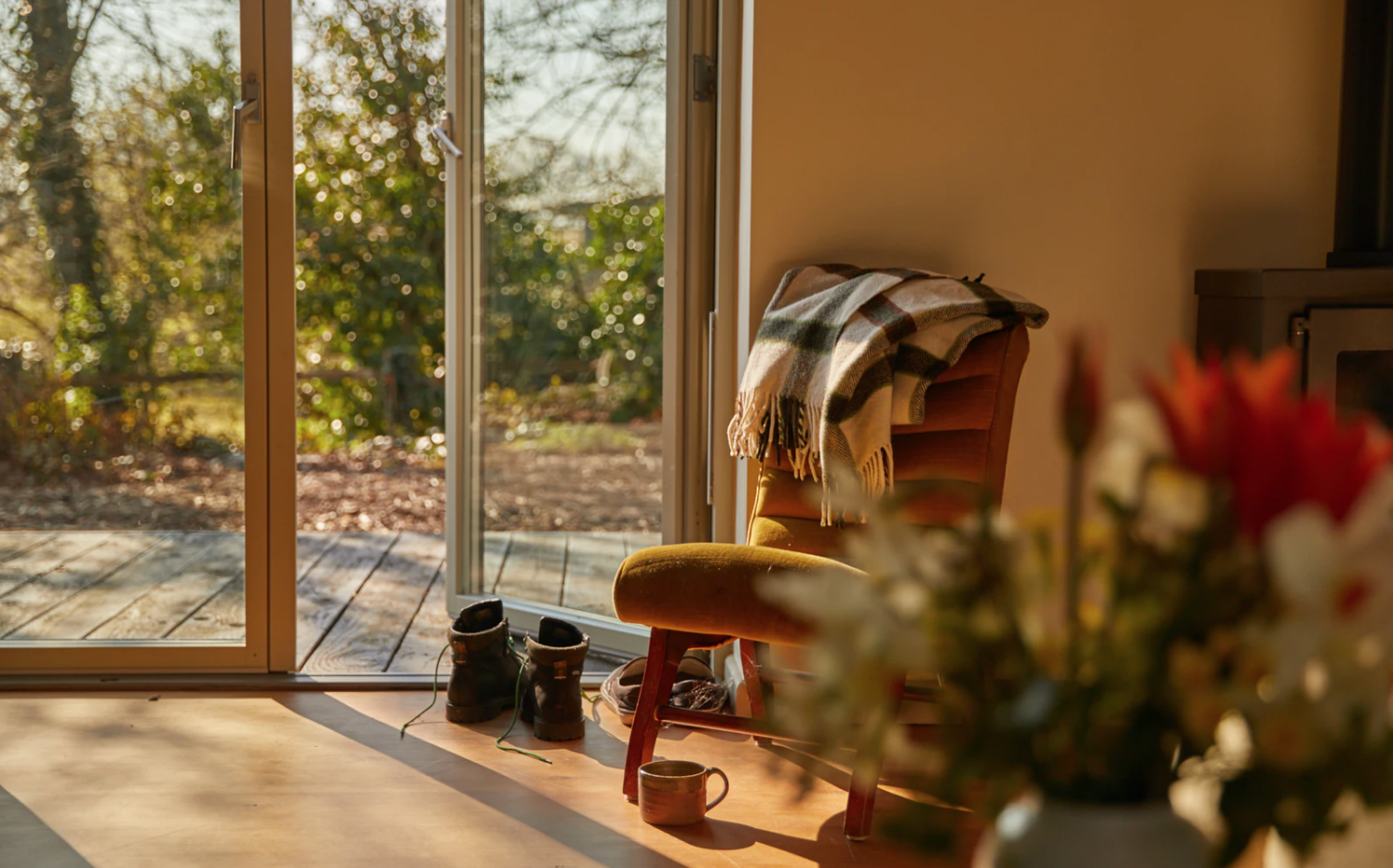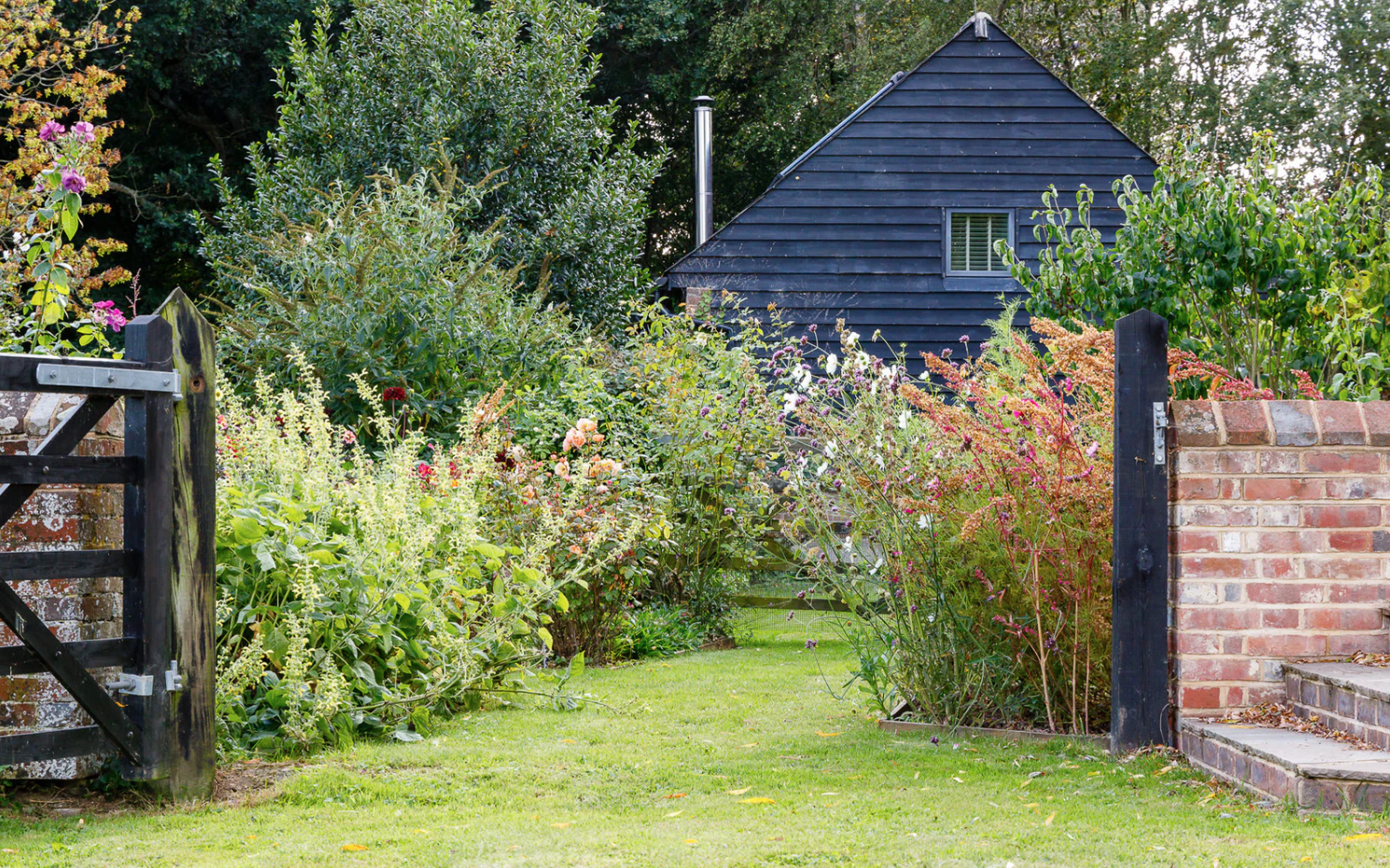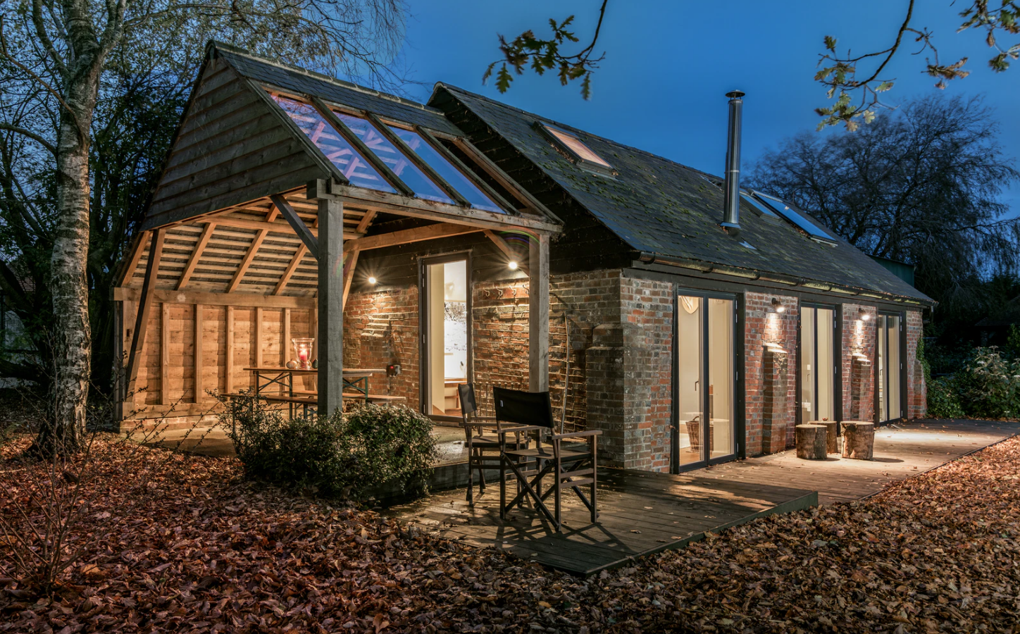 Mimo, że z zewnątrz domek tego nie zapowiada, wnętrze jest dość nowoczesne. W przestrzeni Tack Barn dominuje przestronny salon z aneksem kuchennym i dużymi przeszkleniami otwierającymi się na skąpany w słońcu taras. W salonie znalazło się także miejsce na kominek opalany drewnem.