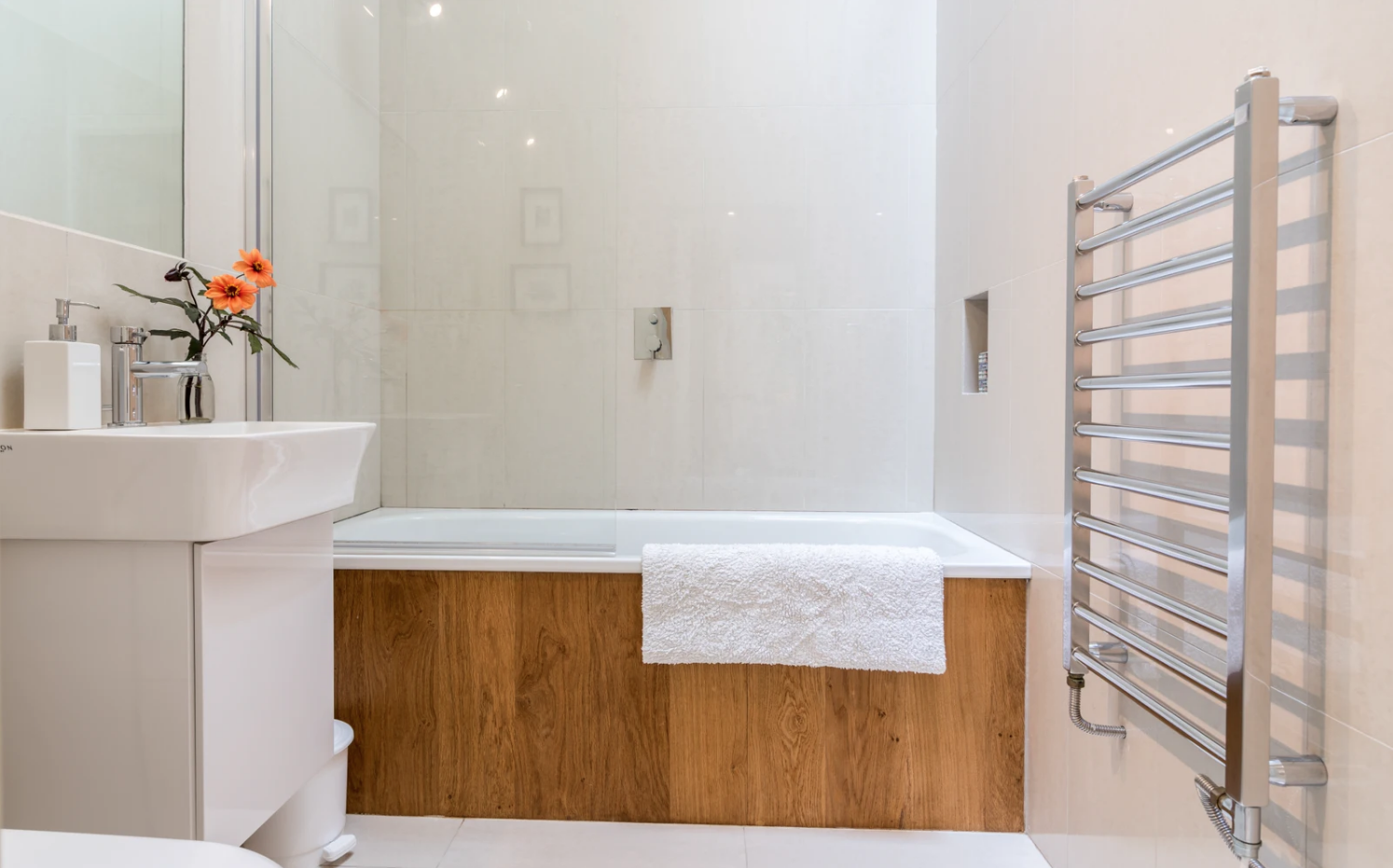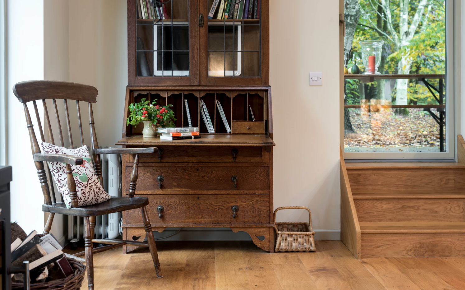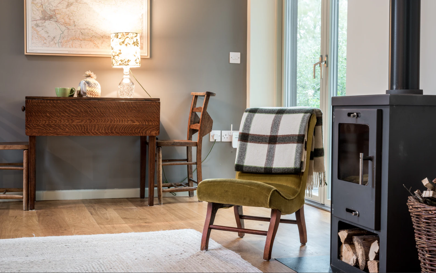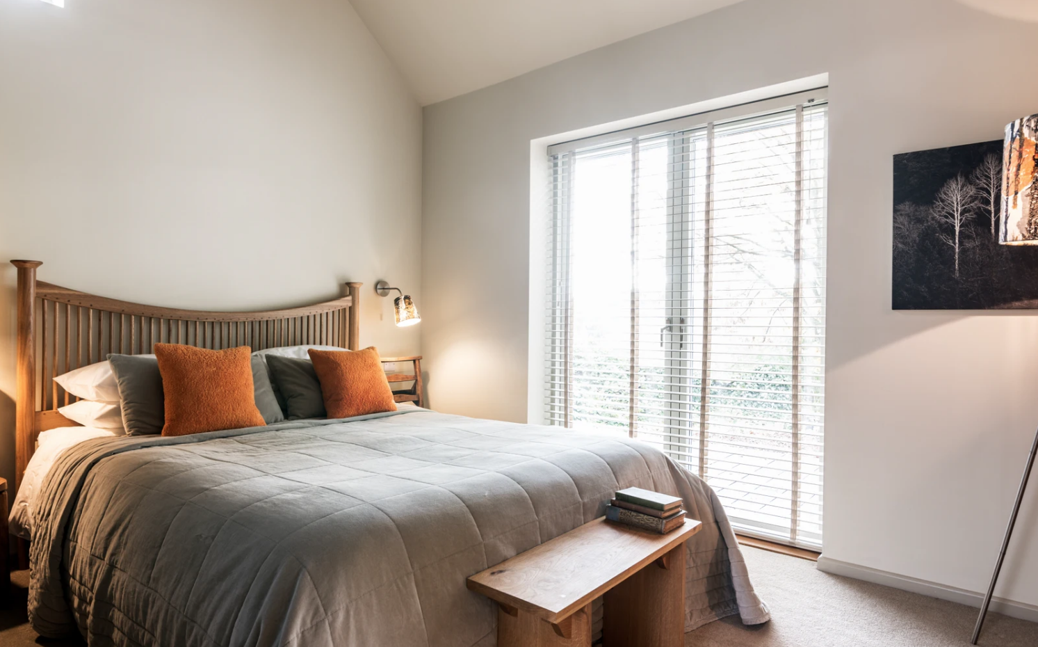 Mimo, że z zewnątrz domek tego nie zapowiada, wnętrze jest dość nowoczesne. W przestrzeni Tack Barn dominuje przestronny salon z aneksem kuchennym i dużymi przeszkleniami otwierającymi się na skąpany w słońcu taras. W salonie znalazło się także miejsce na kominek opalany drewnem.