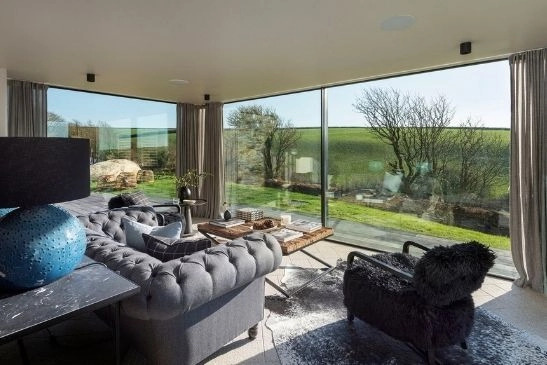 W tym wyjątkowym domu w Bodmin w Kornwalii zastosowano przeszklone systemy bezramowe. nowoczesna STODOŁA położona jest na trawiastym zboczu z widokiem na wybrzeże Kornwalii i wykorzystuje naturalne, uzupełniające materiały, które integrują się z otaczającą Kornwalią okolicą.