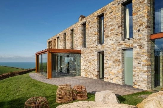 Jedna część domu jest pokryta łupkiem kornwalijskim, podczas gdy druga zawiera drewno pochodzące ze zrównoważonych źródeł, aby stworzyć piękną rustykalną estetykę. Minimalnie przeszklone połączenie wypełnia lukę między dwoma budynkami, które są wyposażone w duże stałe aluminiowe okna bez ram i przesuwane szklane drzwi , aby uchwycić wspaniałe widoki na otaczające wybrzeże i morze.