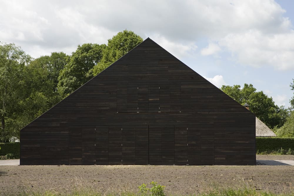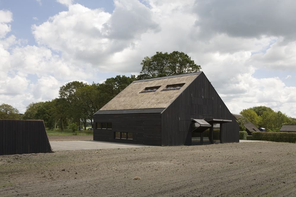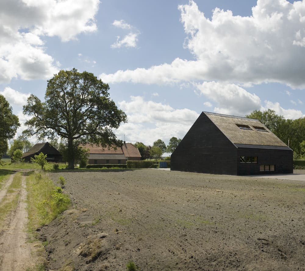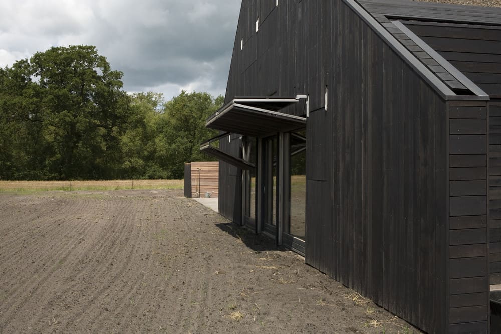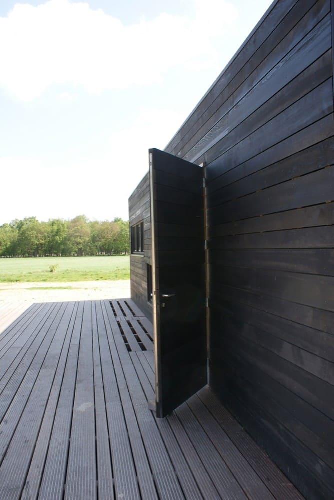 „Dom wejściowy – projekt pilotażowy – zlokalizowano na końcu sąsiedniej wioski Anerveen. Ta lokalizacja nie jest przypadkowa – mieszkanie wraz z „De Eindhoeve”, naprzeciwko farmy, stanowi bramę do posiadłości. Czarny, drewniany dom ma ostre kontury i przypomina prostą STODOŁĘ łączącą go z domem wiejskim po przeciwnej stronie drogi. Dach otwiera się na krajobraz, stając się prywatną przestrzenią zewnętrzną. Drewniany taras znajduje się tuż nad krajobrazem ze względu na niewielką różnicę wysokości, przez co wytyczenie prywatnej przestrzeni jest zbędne. Dom nie jest otoczony krajobrazem, ale jest w nim osadzony.