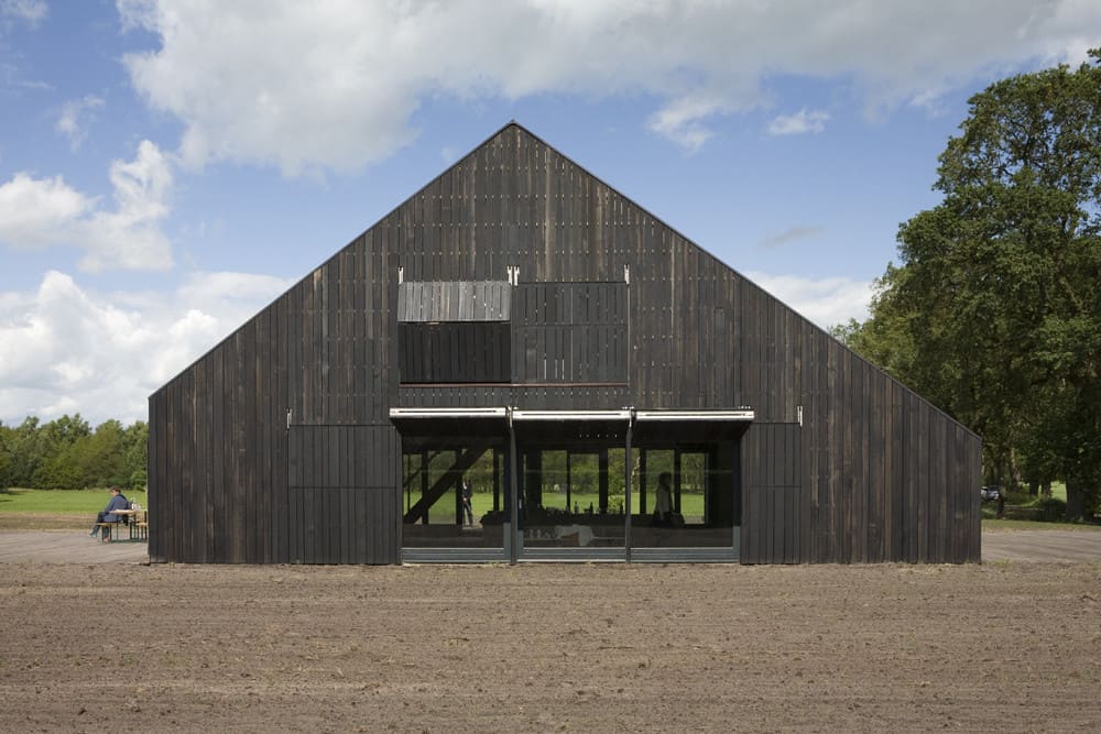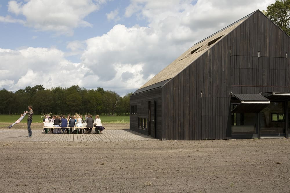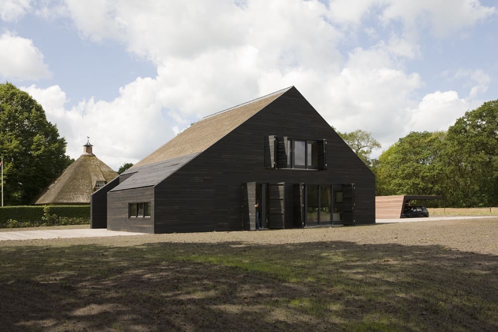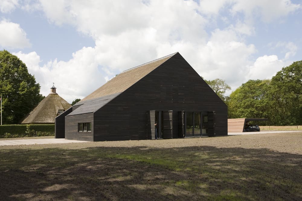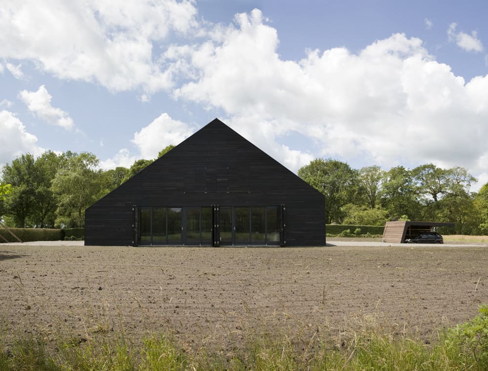 „Dom wejściowy – projekt pilotażowy – zlokalizowano na końcu sąsiedniej wioski Anerveen. Ta lokalizacja nie jest przypadkowa – mieszkanie wraz z „De Eindhoeve”, naprzeciwko farmy, stanowi bramę do posiadłości. Czarny, drewniany dom ma ostre kontury i przypomina prostą STODOŁĘ łączącą go z domem wiejskim po przeciwnej stronie drogi. Dach otwiera się na krajobraz, stając się prywatną przestrzenią zewnętrzną. Drewniany taras znajduje się tuż nad krajobrazem ze względu na niewielką różnicę wysokości, przez co wytyczenie prywatnej przestrzeni jest zbędne. Dom nie jest otoczony krajobrazem, ale jest w nim osadzony.