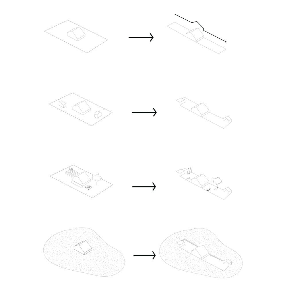 Lokalizację mieszkań wybrano z myślą o najbardziej unikalnych lokalizacjach. Tematyka willi trzcinowej, willi polowej, willi powodziowej, lasu, potoku, alei, stawu, granicy i willi wejściowej tworzy silną spójność. Na przykład „Creek Villa” stoi pomiędzy dwoma lasami, a strumień przepływający przez środek dzieli dom na dwie części. Dach staje się wówczas tarasem i działa jak most przez potok. Zaproponowana typologia mieszkaniowa sugeruje różne sposoby zamieszkania, np. dom, w którym to dzieci opiekują się rodzicami.