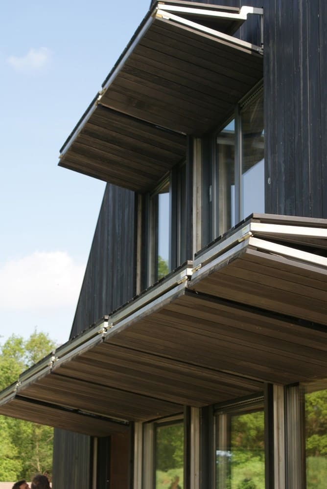 Fasada składa się z szeregu okiennic, które odgrywają zasadniczą rolę w wyglądzie mieszkania. Tam, gdzie duże pionowe żaluzje z boku wpuszczają światło, otwarte latem, działają również jako rolety przeciwsłoneczne. Żaluzje poziome po przeciwnej stronie są mniejsze i węższe, przypominające szczeliny w elewacji zagrody. Zamiast nakładających się gontów, panele lekko uchylone wprowadzają światło przez okiennice. Dachy kontrastują z oryginalnymi zagrodami, gdzie ściany zewnętrzne są pokryte strzechą. Kryty strzechą dach „domu wejściowego” został wpuszczony głęboko w jego drewnianą bryłę budynku, tworząc pas, w którym dach i grunt dosłownie zachodzą na siebie, usuwając rozgraniczenie między architekturą a krajobrazem oraz między publicznym i prywatnym jako całość.