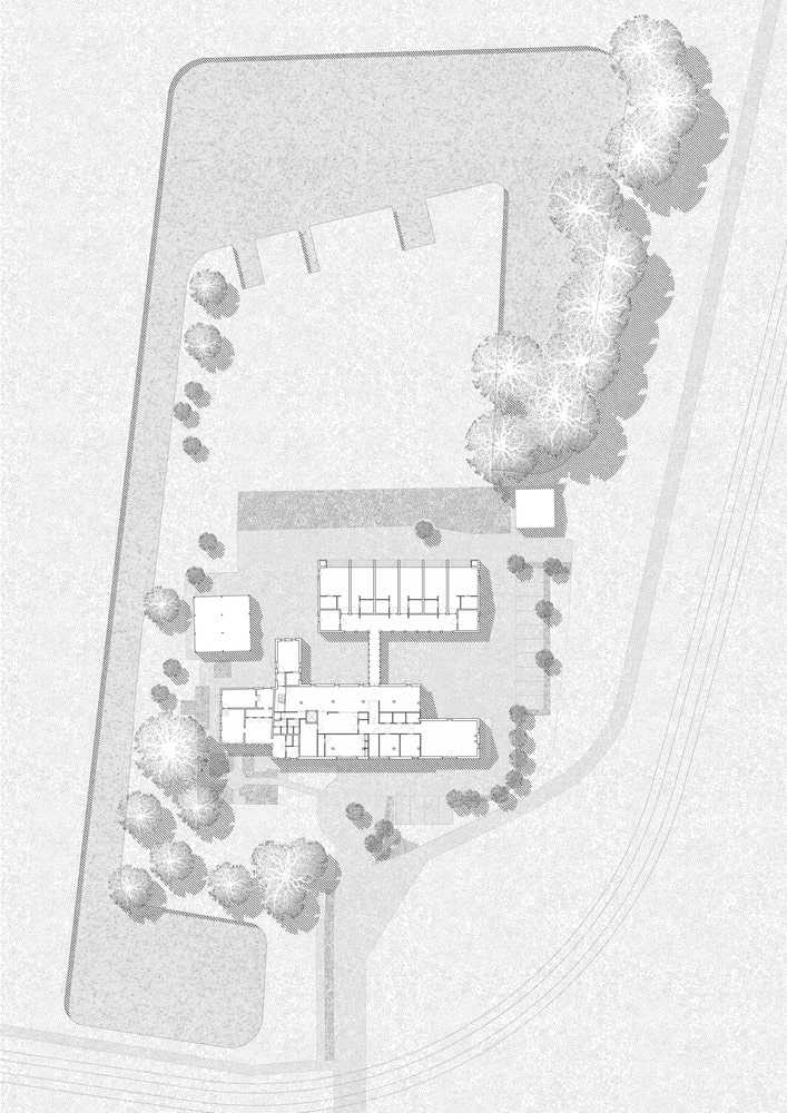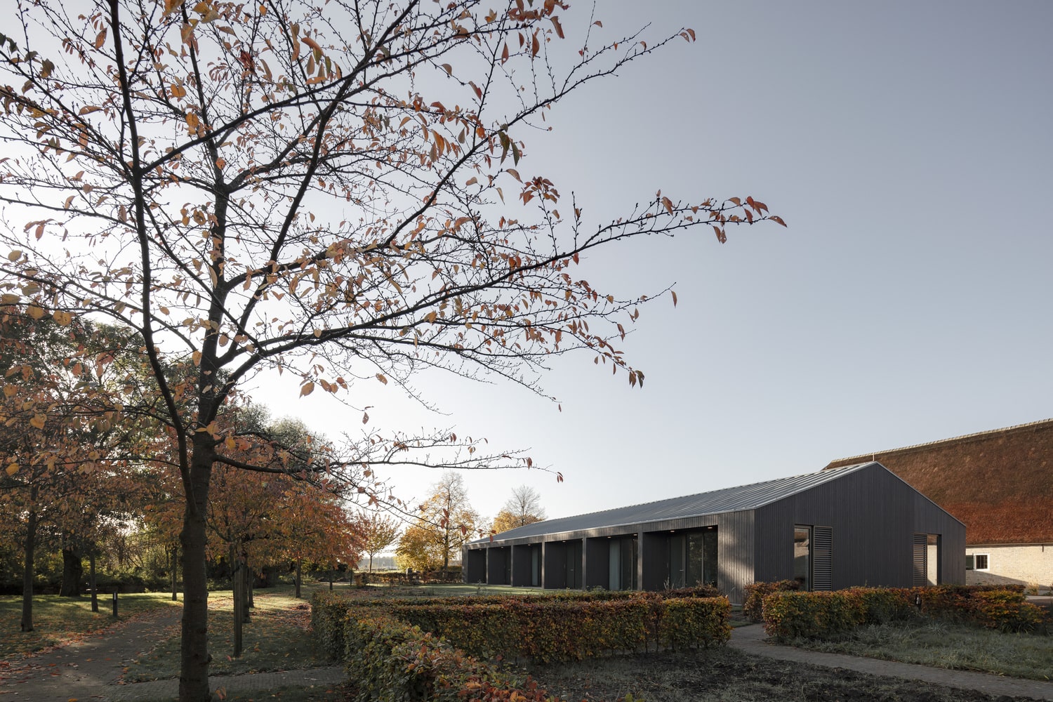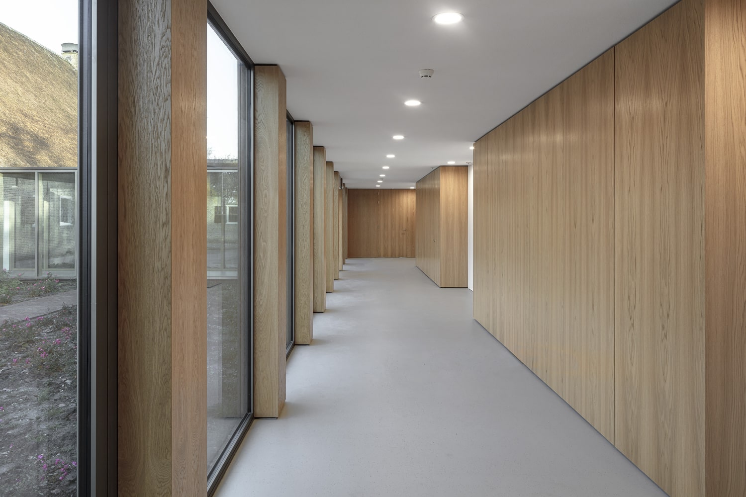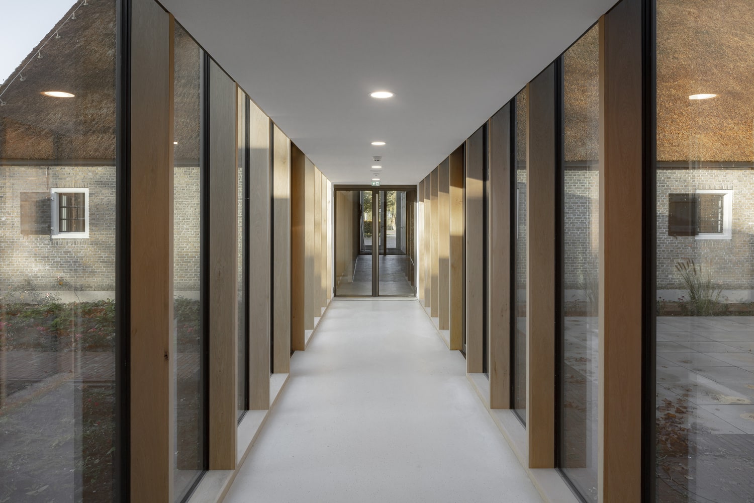 Przeszklony korytarz biegnie od części wspólnych w gospodarstwie do nowego budynku z pokojami mieszkalnymi. Doświadczenie zieleni, natury i światła jest tutaj najważniejsze. Dlatego galeria wokół ogrodzonego ogrodu jest przeszklona. Drewniane kolumny, drewniane ściany i szafki nadają pomieszczeniu wyraźny rytm. W celu przekształcenia gospodarstwa w hospicjum sześć pokoi umieszczono poza starym gospodarstwem.