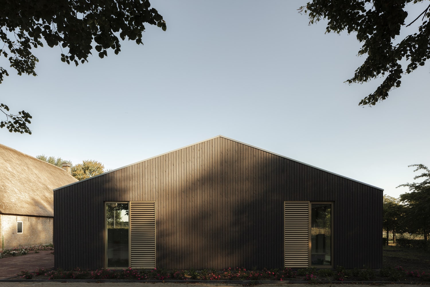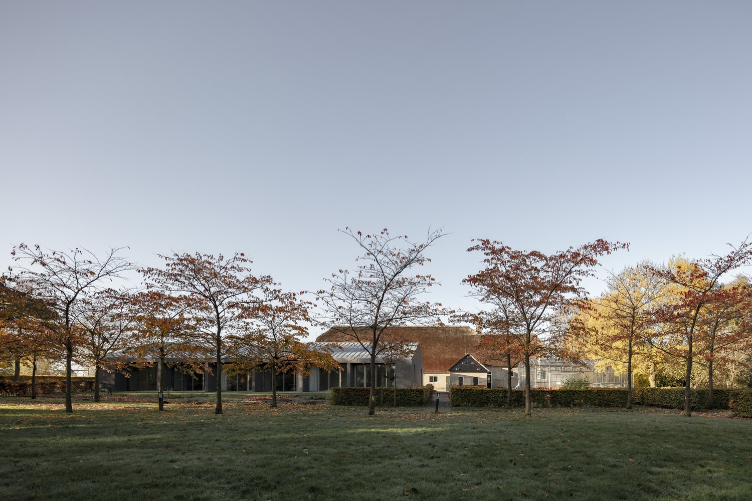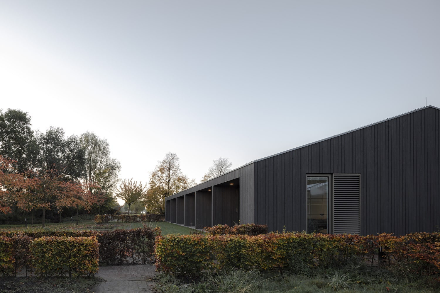 Wymagania dotyczące dobrych powierzchni mieszkaniowych dla schorowanych lokatorów (dźwięk, światło dzienne, wentylacja i izolacja) są trudne do spełnienia bez wpływu na zabytkowe walory gospodarstwa. Dzięki temu nowy budynek został wyposażony w gruntową pompę ciepła, ogniwa słoneczne oraz wentylację z odzyskiem ciepła. Architekturę dobudówki zainspirowano ciemnymi drewutniami znajdującymi się w wielu tego typu gospodarstwach. Dzięki temu Hospicjum de Liefde wraz ze skromną dobudówką tworzy harmonijną i naturalną całość w krajobrazie. W przeciwieństwie do tradycyjnej szopy, nowy budynek ma nowoczesny design z ramami w kolorze brązu i cynkowym dachem ze zintegrowanymi ogniwami słonecznymi. Konstrukcja nośna, jak i okładzina elewacji oraz duża część wykończenia wnętrz wykonana jest z drewna. Do pokoi gościnnych można dostać się z korytarza wzdłuż dziedzińca.