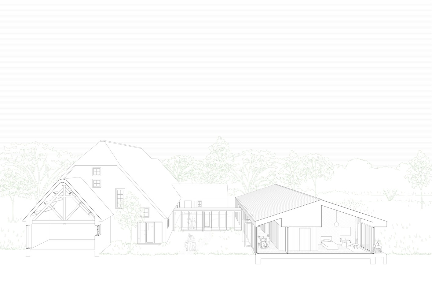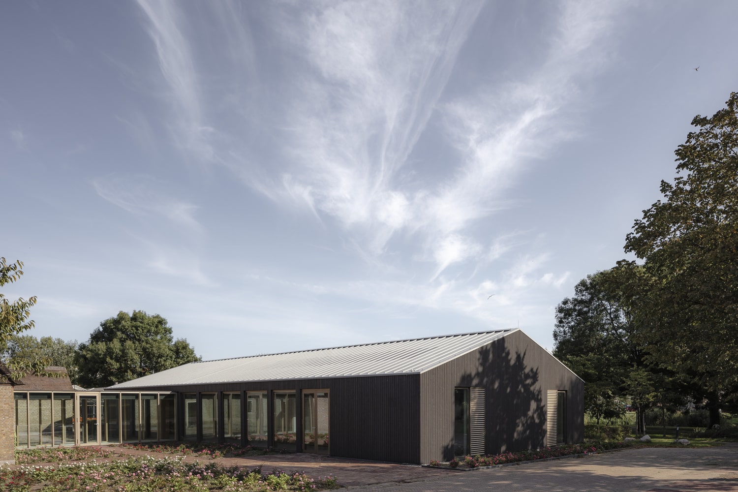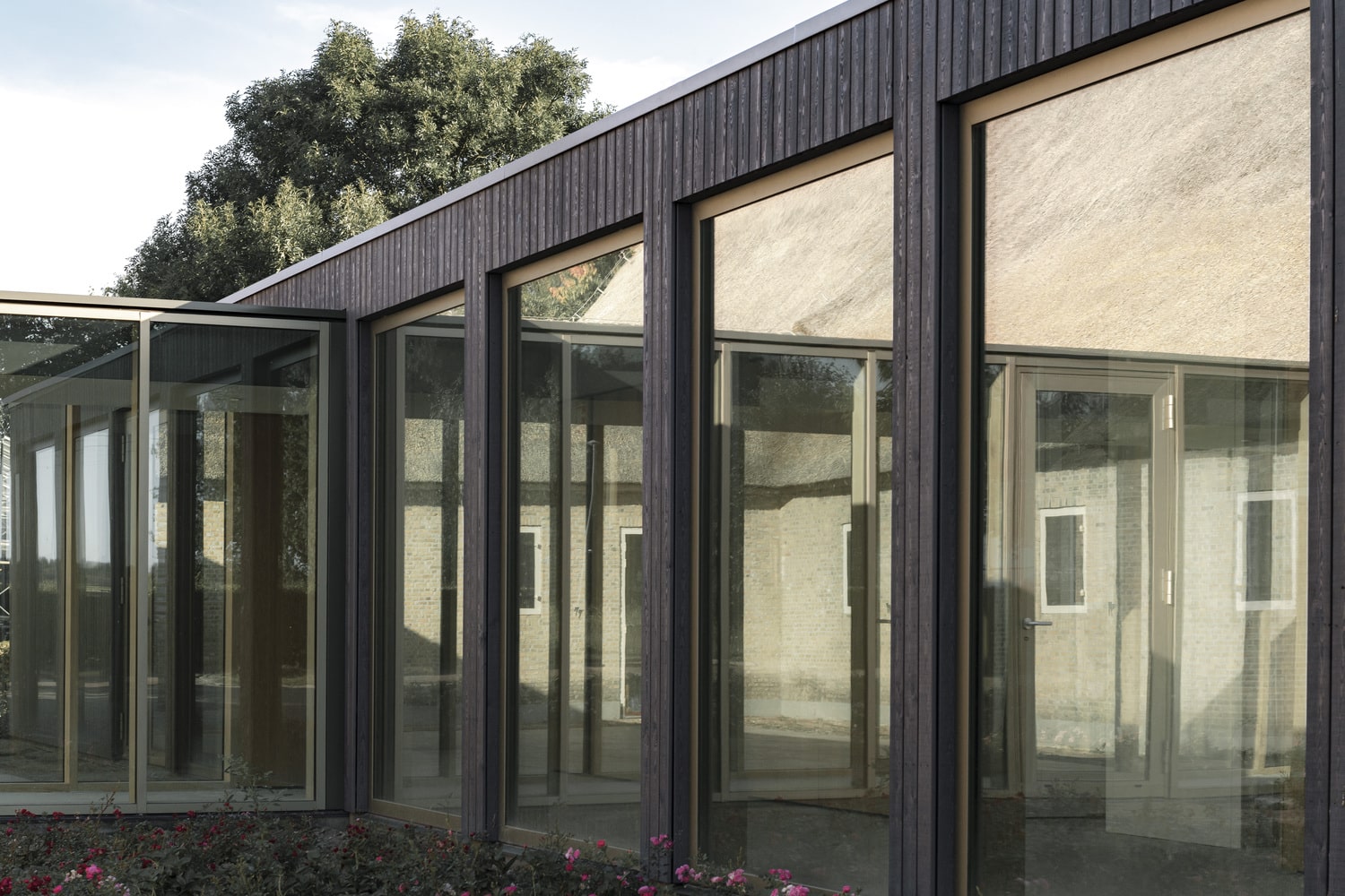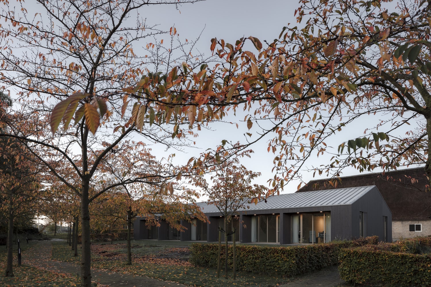 Wymagania dotyczące dobrych powierzchni mieszkaniowych dla schorowanych lokatorów (dźwięk, światło dzienne, wentylacja i izolacja) są trudne do spełnienia bez wpływu na zabytkowe walory gospodarstwa. Dzięki temu nowy budynek został wyposażony w gruntową pompę ciepła, ogniwa słoneczne oraz wentylację z odzyskiem ciepła. Architekturę dobudówki zainspirowano ciemnymi drewutniami znajdującymi się w wielu tego typu gospodarstwach. Dzięki temu Hospicjum de Liefde wraz ze skromną dobudówką tworzy harmonijną i naturalną całość w krajobrazie. W przeciwieństwie do tradycyjnej szopy, nowy budynek ma nowoczesny design z ramami w kolorze brązu i cynkowym dachem ze zintegrowanymi ogniwami słonecznymi. Konstrukcja nośna, jak i okładzina elewacji oraz duża część wykończenia wnętrz wykonana jest z drewna. Do pokoi gościnnych można dostać się z korytarza wzdłuż dziedzińca.