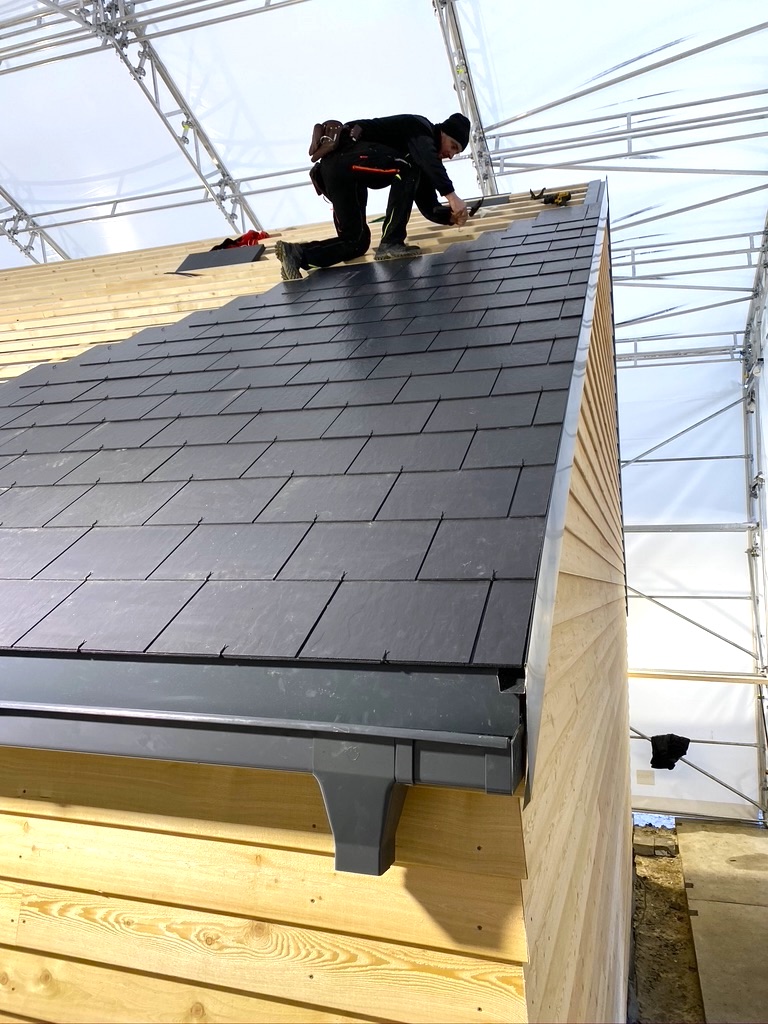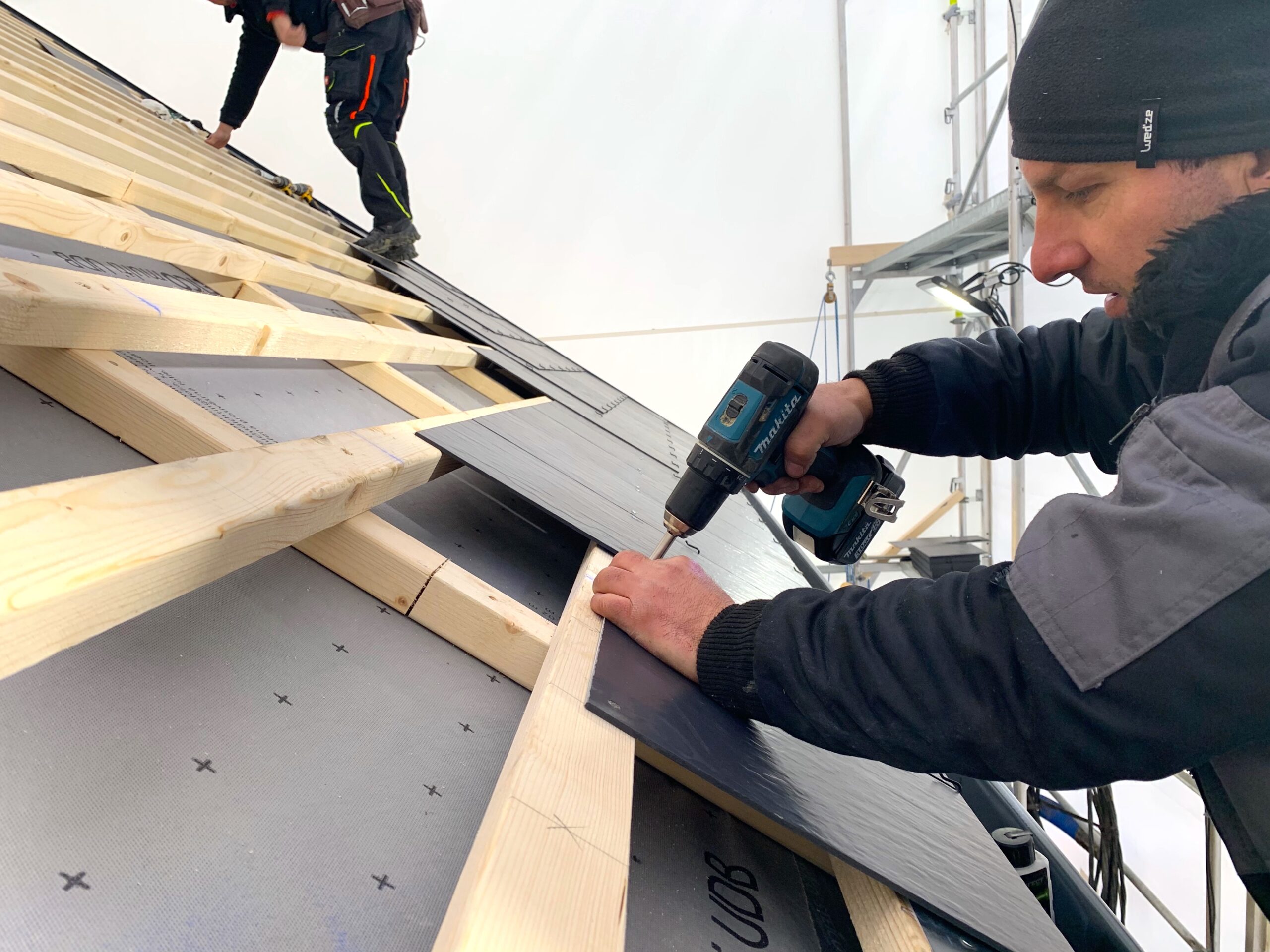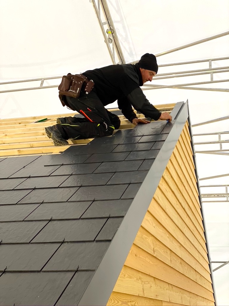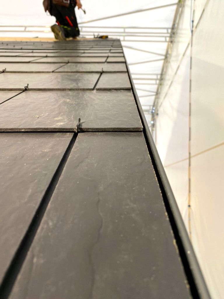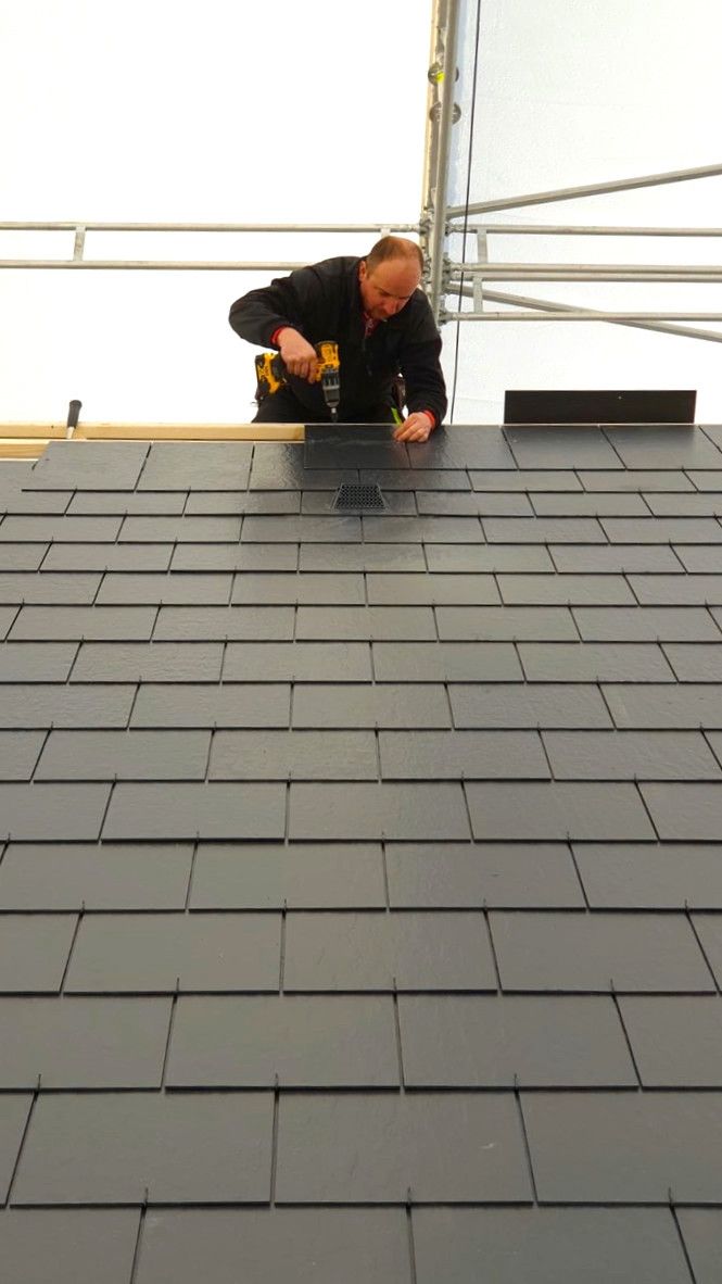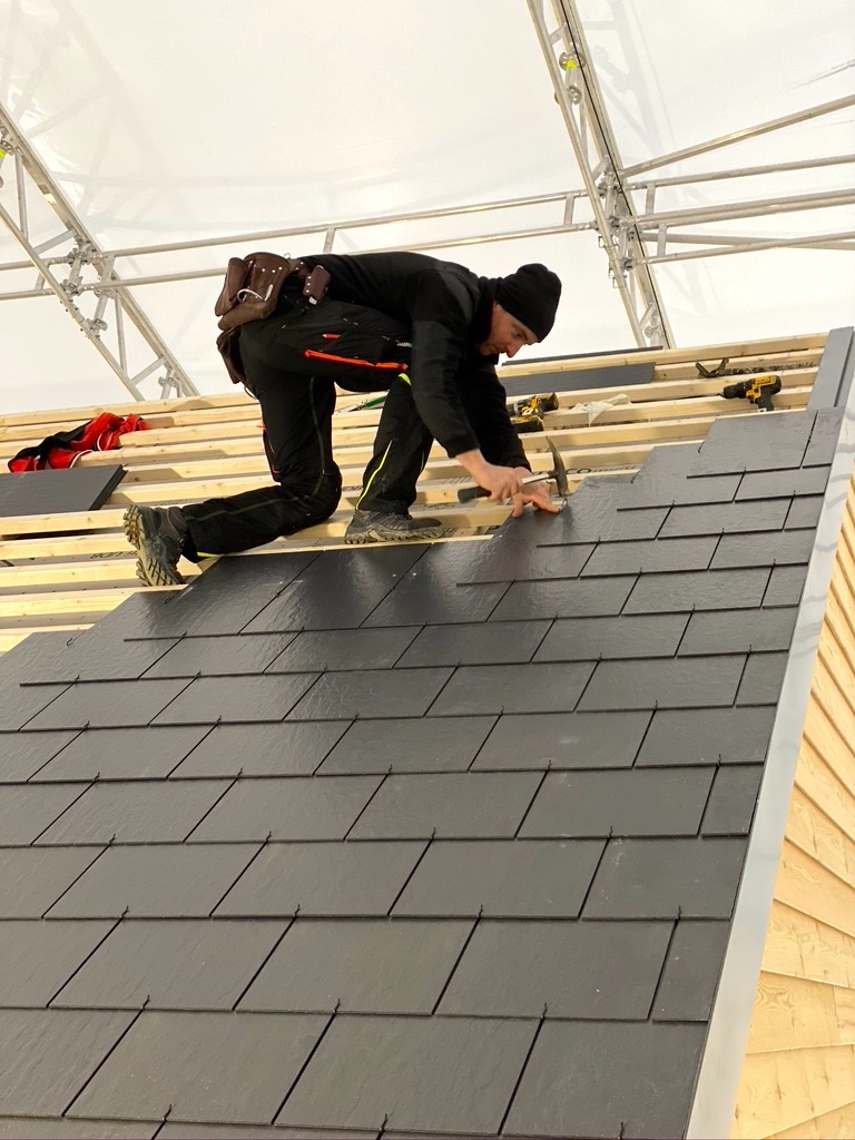 Praca z nimi jest łatwa i wygodna – co mogą potwierdzić nasi specjaliści, którzy wykonali ten piękny dach. Do obróbki wykorzystali najprostsze narzędzia, takie jak nożyce ręczne, młotek dekarski, kowadełko i gilotyny. Płytki miały już wywiercone otwory do montowania, odpowiednie do wymaganego zakładu. O czym należy pamiętać przed przystąpieniem do prac? Płytki należy przechowywać w suchym i przewiewnym miejscu. W innym przypadku na ich powierzchni, ze względu na naturalny materiał, z którego zostały wykonane, mogą pojawić się przebarwienia.