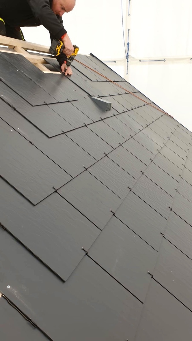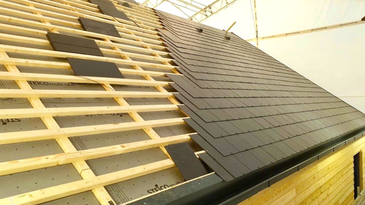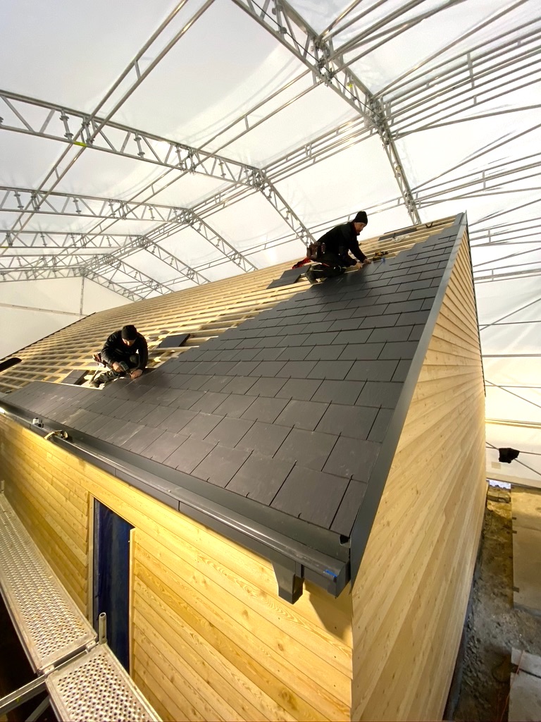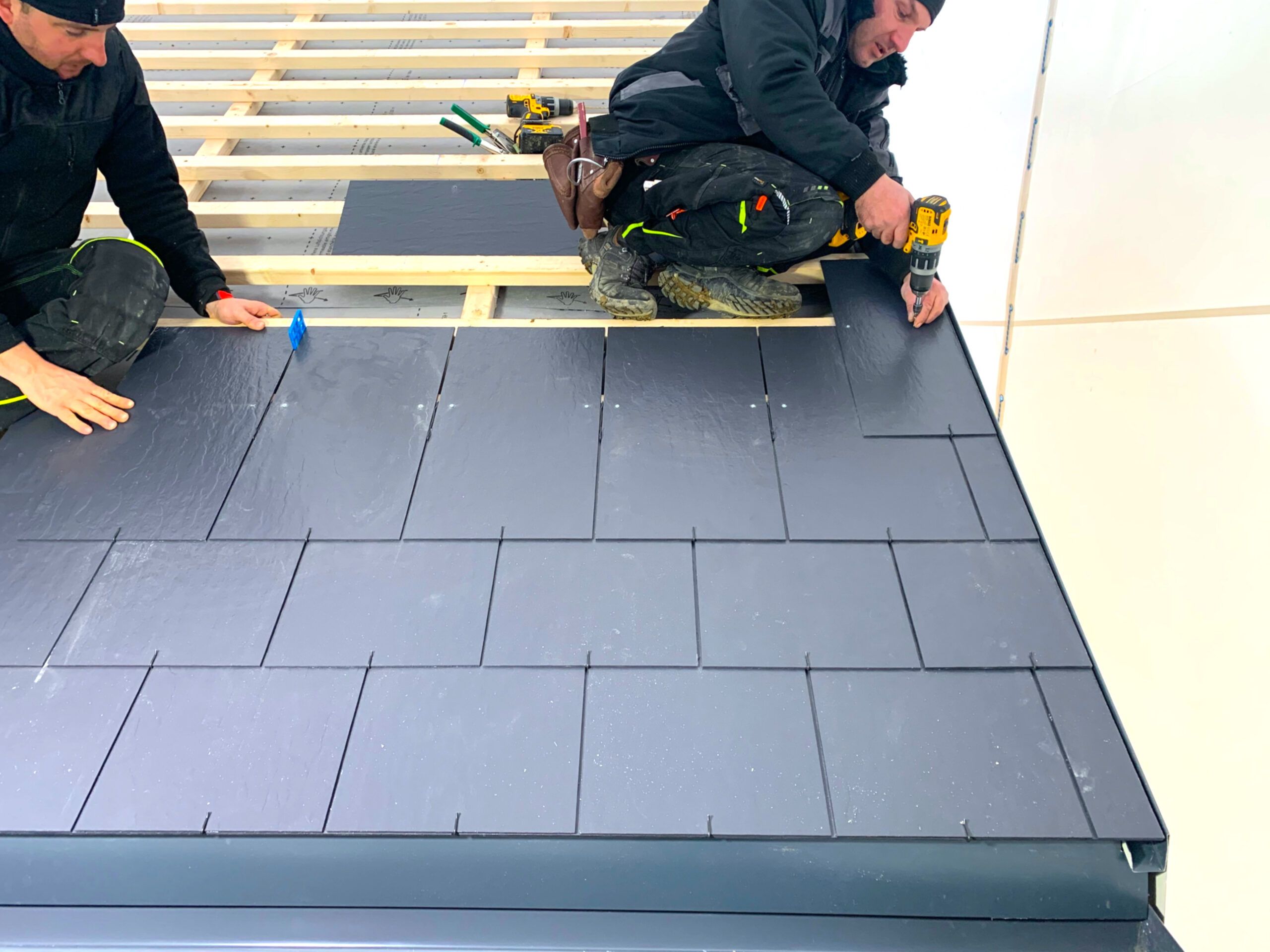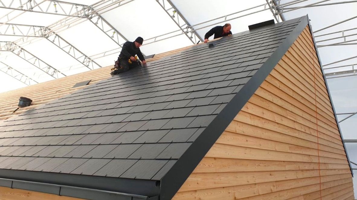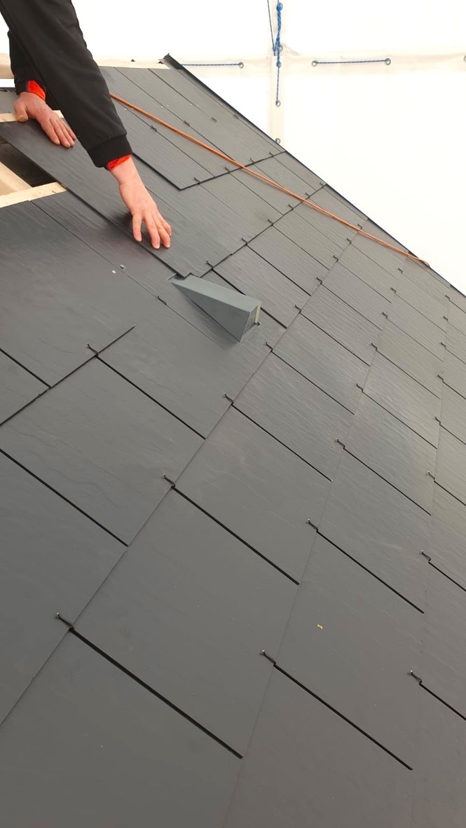 Praca z nimi jest łatwa i wygodna – co mogą potwierdzić nasi specjaliści, którzy wykonali ten piękny dach. Do obróbki wykorzystali najprostsze narzędzia, takie jak nożyce ręczne, młotek dekarski, kowadełko i gilotyny. Płytki miały już wywiercone otwory do montowania, odpowiednie do wymaganego zakładu. O czym należy pamiętać przed przystąpieniem do prac? Płytki należy przechowywać w suchym i przewiewnym miejscu. W innym przypadku na ich powierzchni, ze względu na naturalny materiał, z którego zostały wykonane, mogą pojawić się przebarwienia.