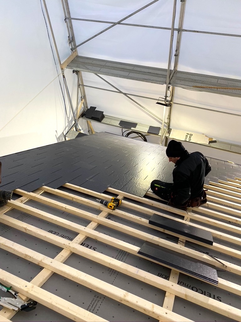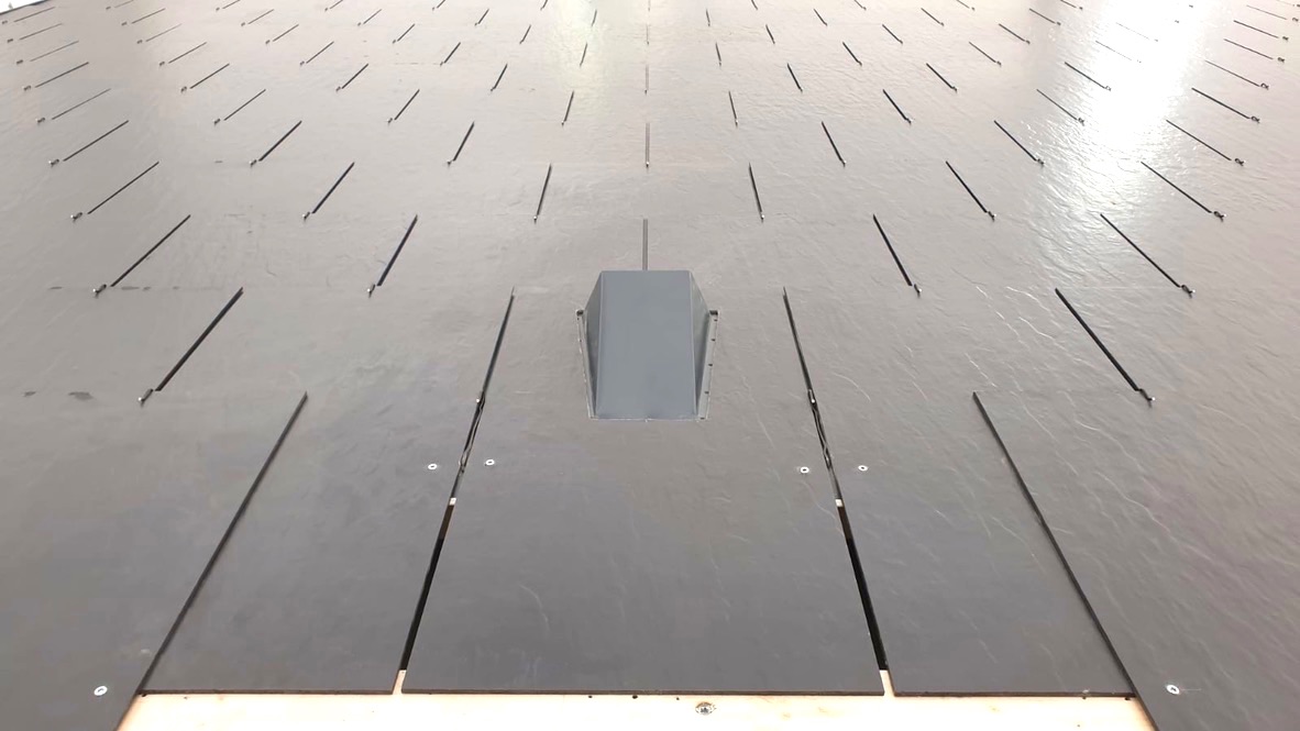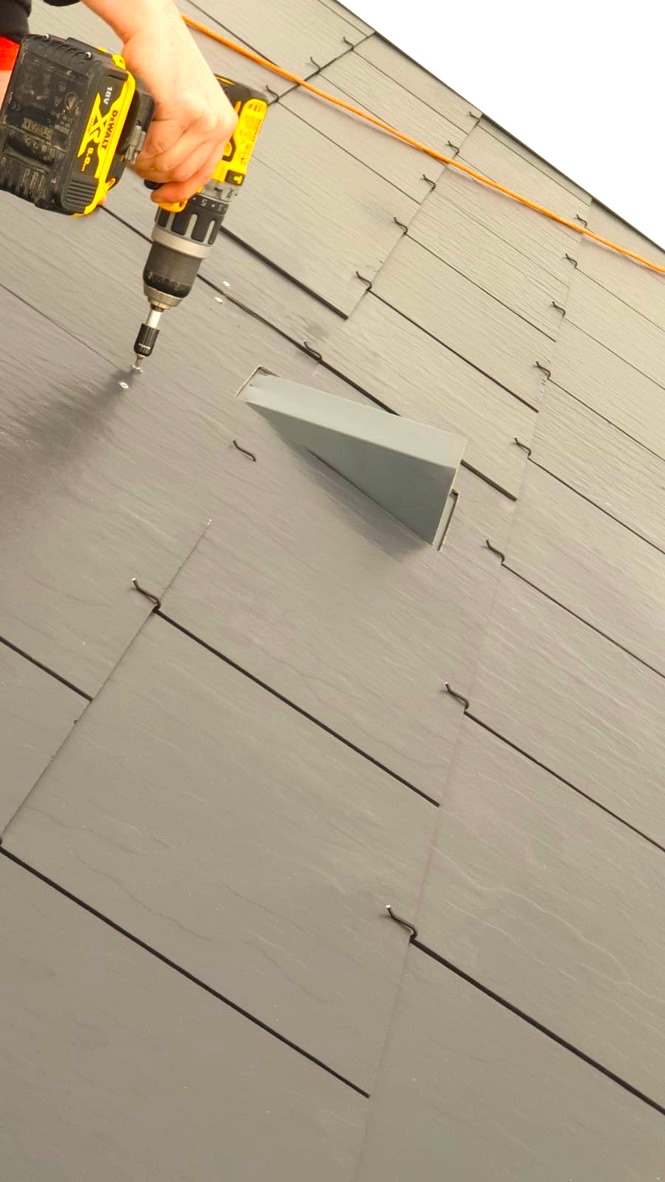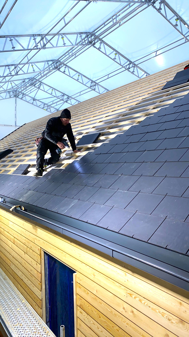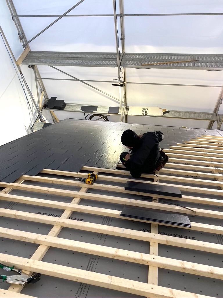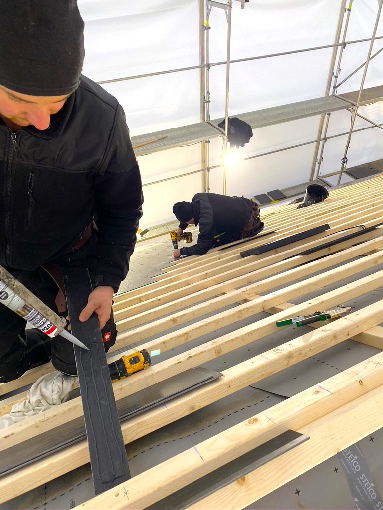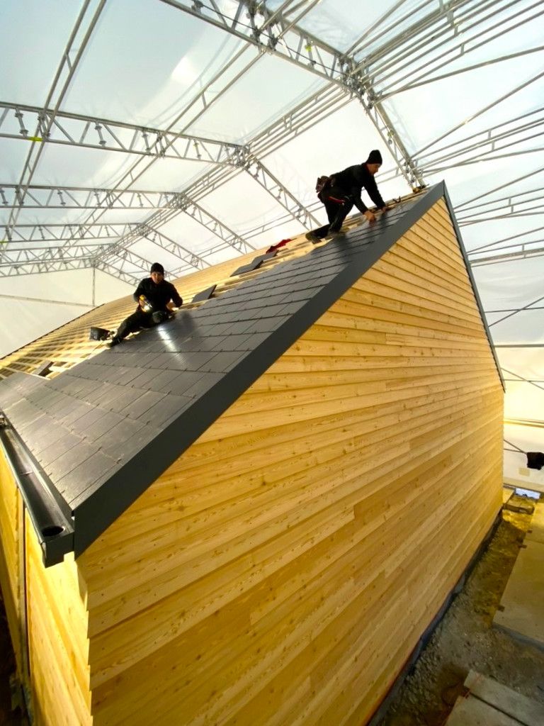 Praca z nimi jest łatwa i wygodna – co mogą potwierdzić nasi specjaliści, którzy wykonali ten piękny dach. Do obróbki wykorzystali najprostsze narzędzia, takie jak nożyce ręczne, młotek dekarski, kowadełko i gilotyny. Płytki miały już wywiercone otwory do montowania, odpowiednie do wymaganego zakładu. O czym należy pamiętać przed przystąpieniem do prac? Płytki należy przechowywać w suchym i przewiewnym miejscu. W innym przypadku na ich powierzchni, ze względu na naturalny materiał, z którego zostały wykonane, mogą pojawić się przebarwienia.