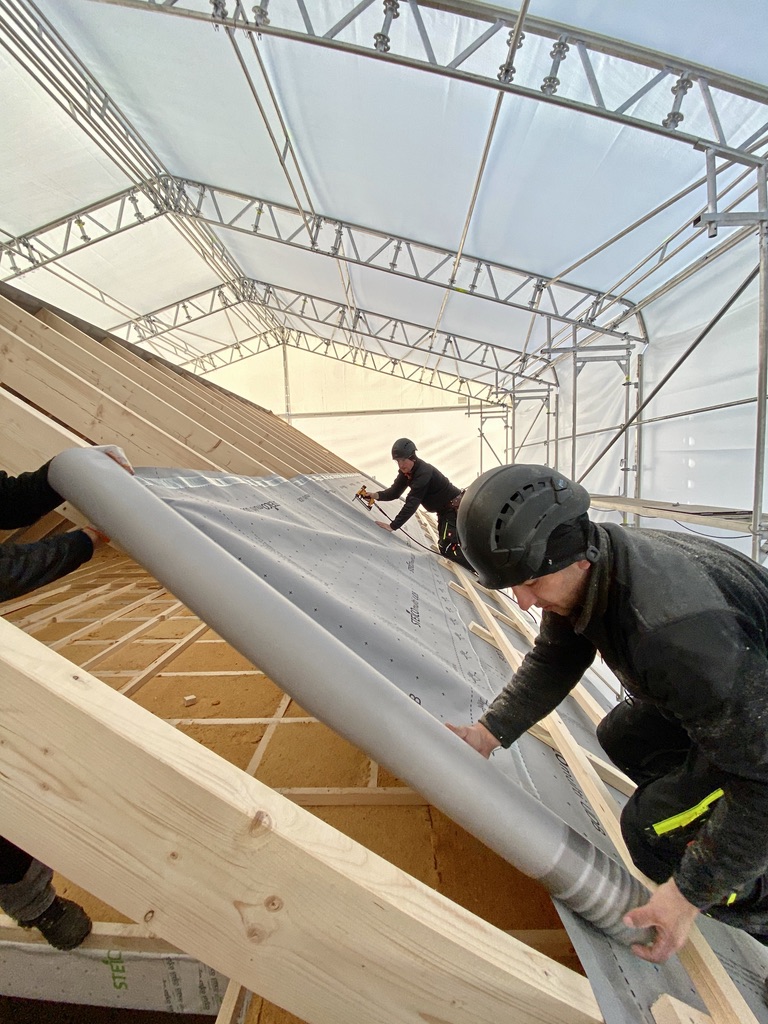 Prace wykonujemy od dołu, ku górze po jednej jak i po drugiej stronie połaci. Po dojściu do krawędzi szczytowej należy założyć na siebie membrany z zakładem minimum 10cm, lub przerzucić jeden bryt membrany na całej długości kalenicy, zachowując równy zakład po obu stronach. Wolną krawędź pozbawioną paska klejącego należy zespolić z membrana poniżej z zastosowaniem taśmy sytstemowej.