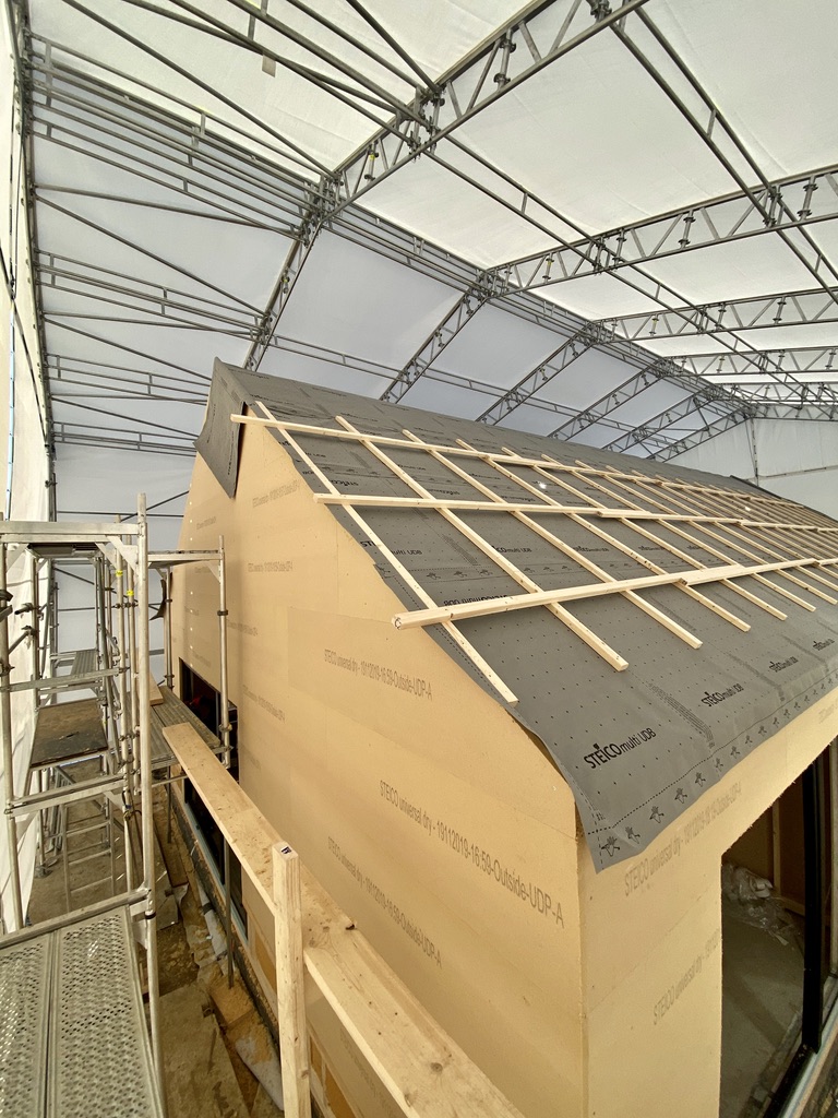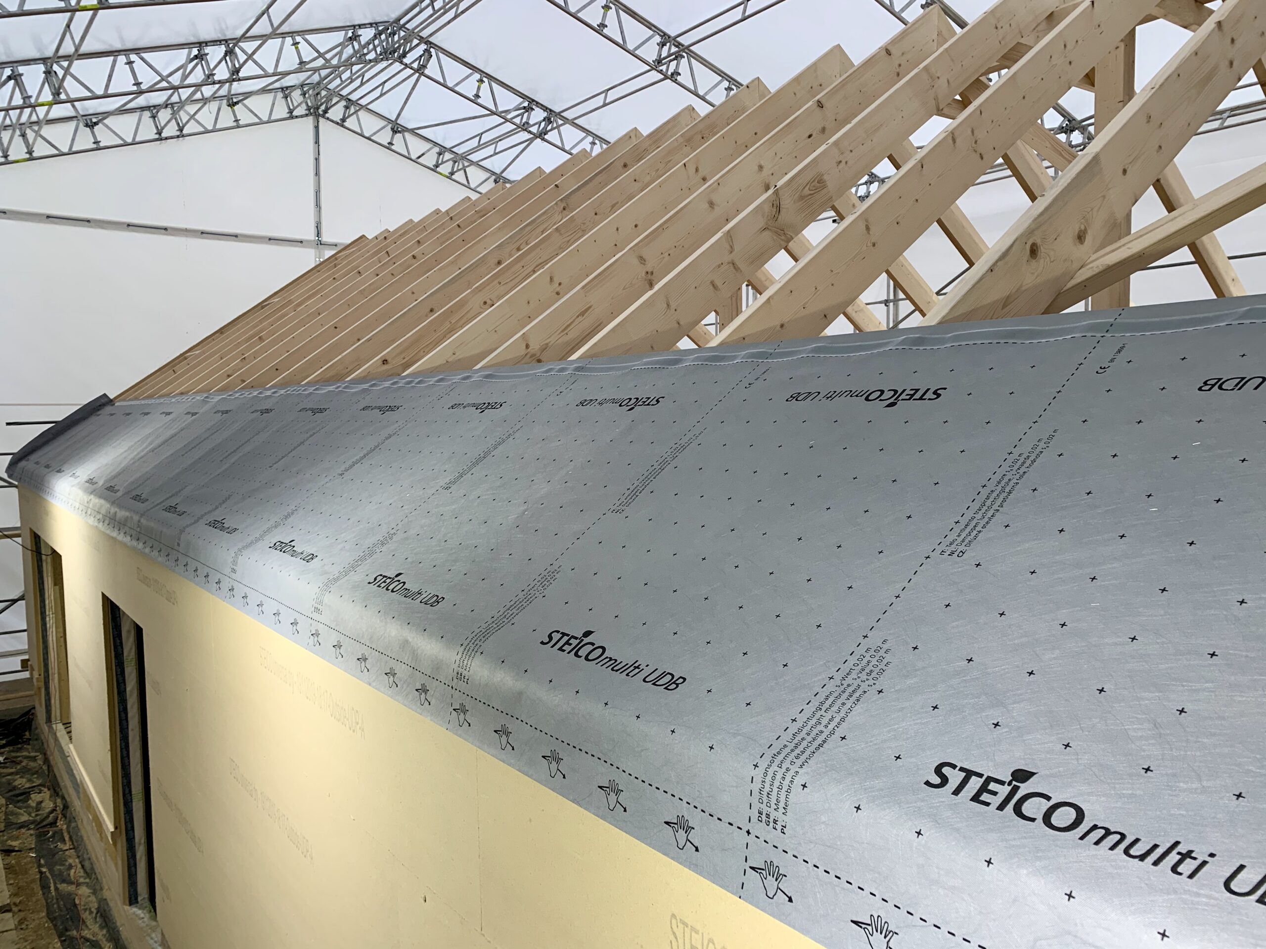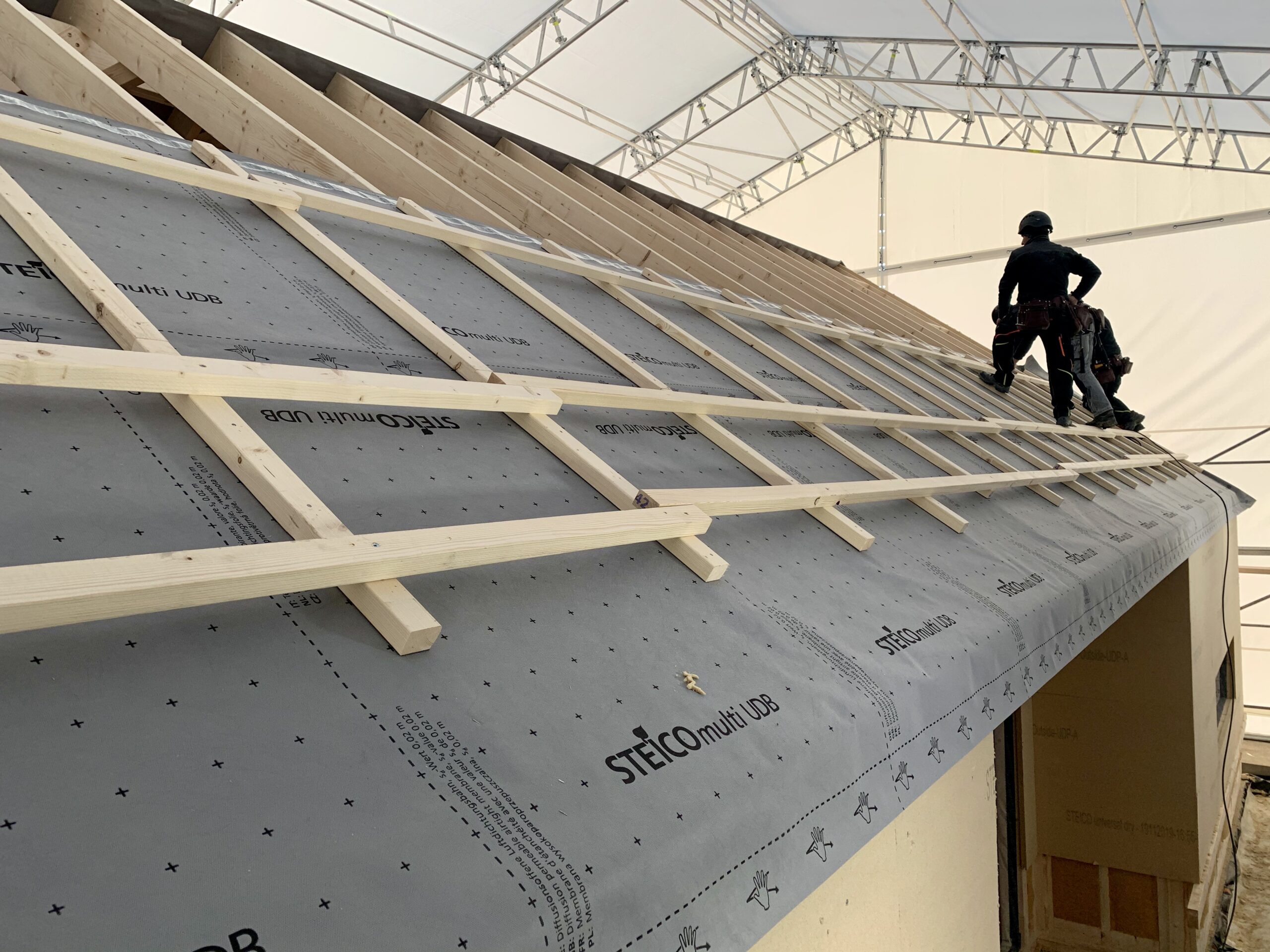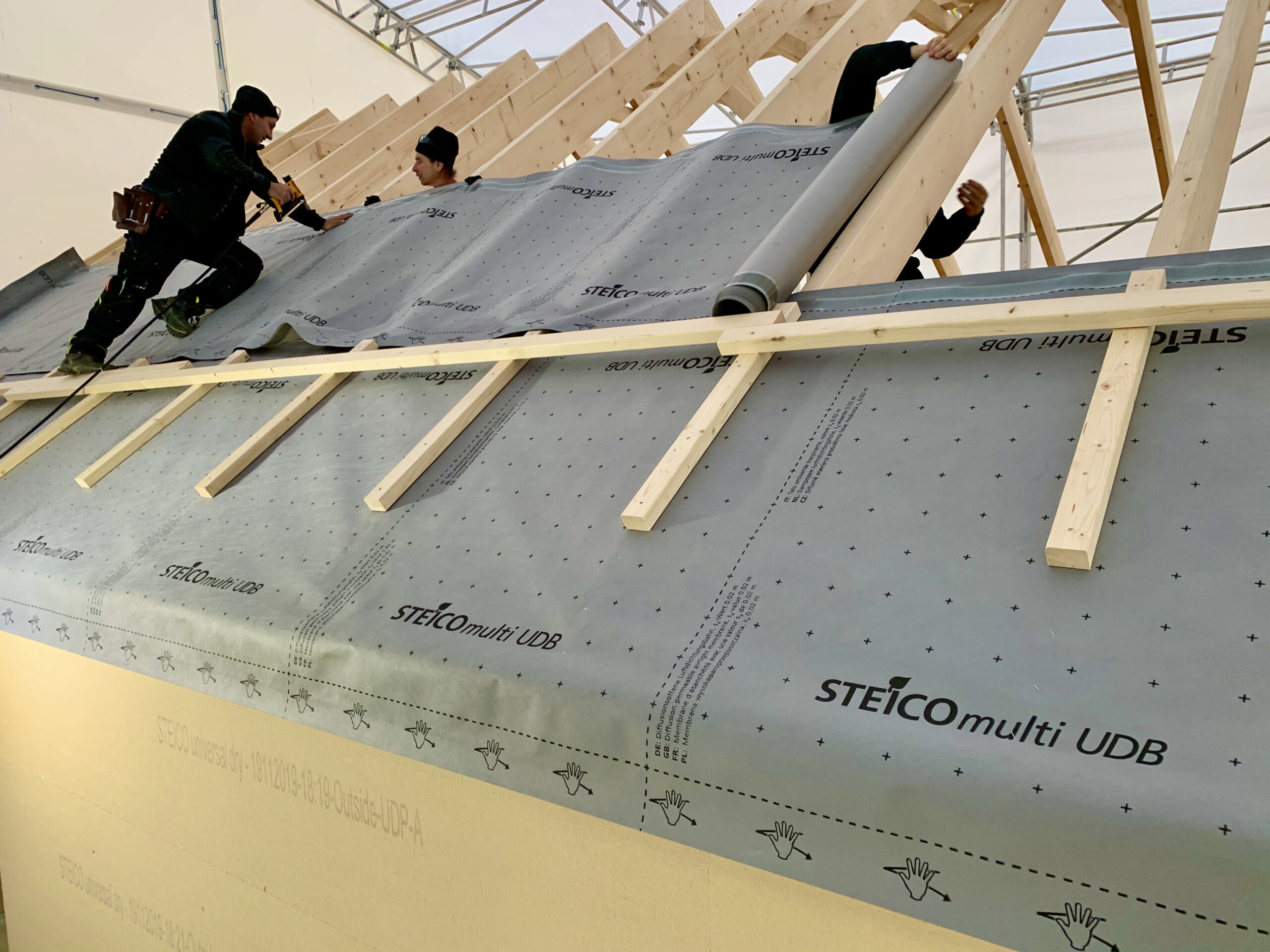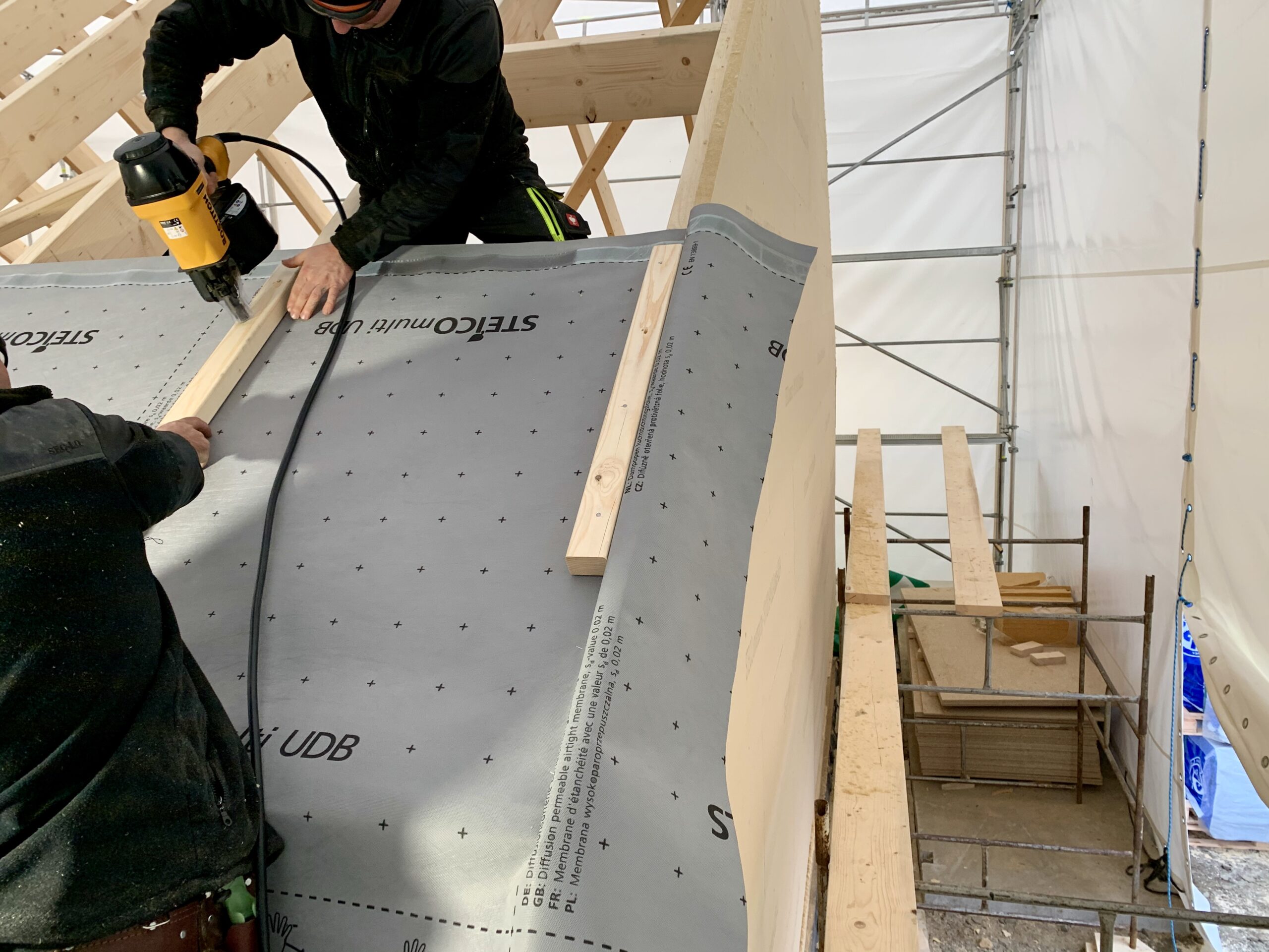 Pierwszą kontrłatę nalaży zamocować po każdej ze stron dachu w sposób taki, aby przylegała ona bokiem do płaszczyzny STEICO UNIVERSAL przez membranę dachową. Nadmiar membrany należy wywinąć poza obrys ściany- na zewnątrz. Płaszczyznę membrany znajdującą się na krawędzi płyty STEICO UNIVERSAL należy skleić taśmą systemową z kontrłatą, zabezpieczając tym samym szczelinę, która powstanie na styku łata/membrana po stronie STEICO UNIVERSAL.