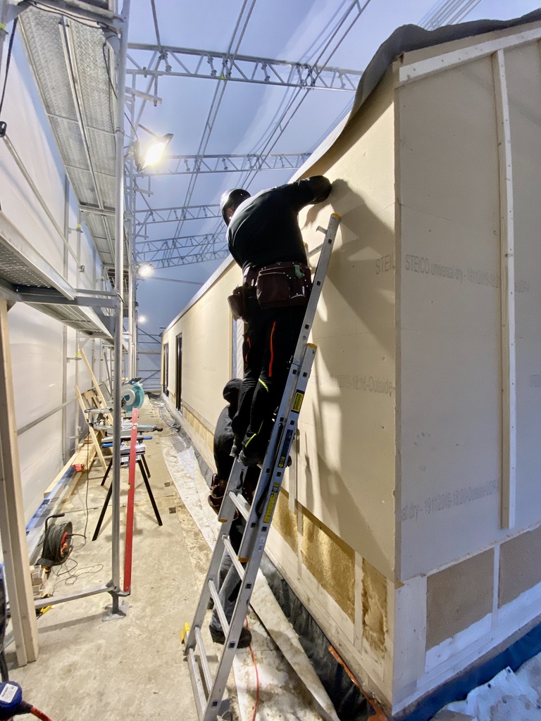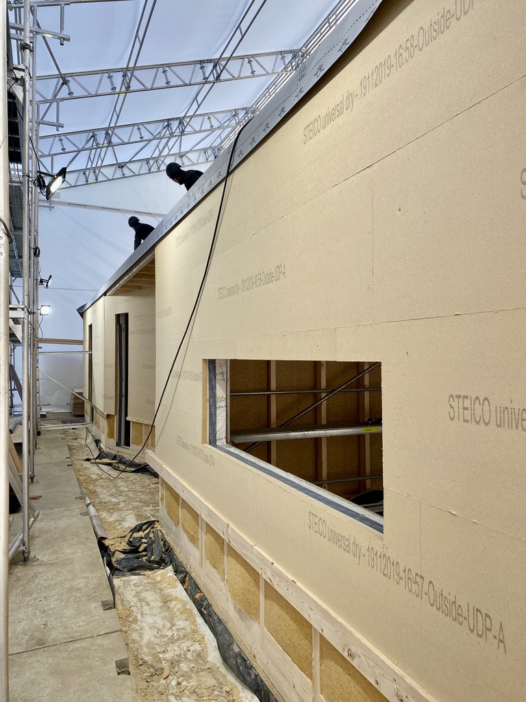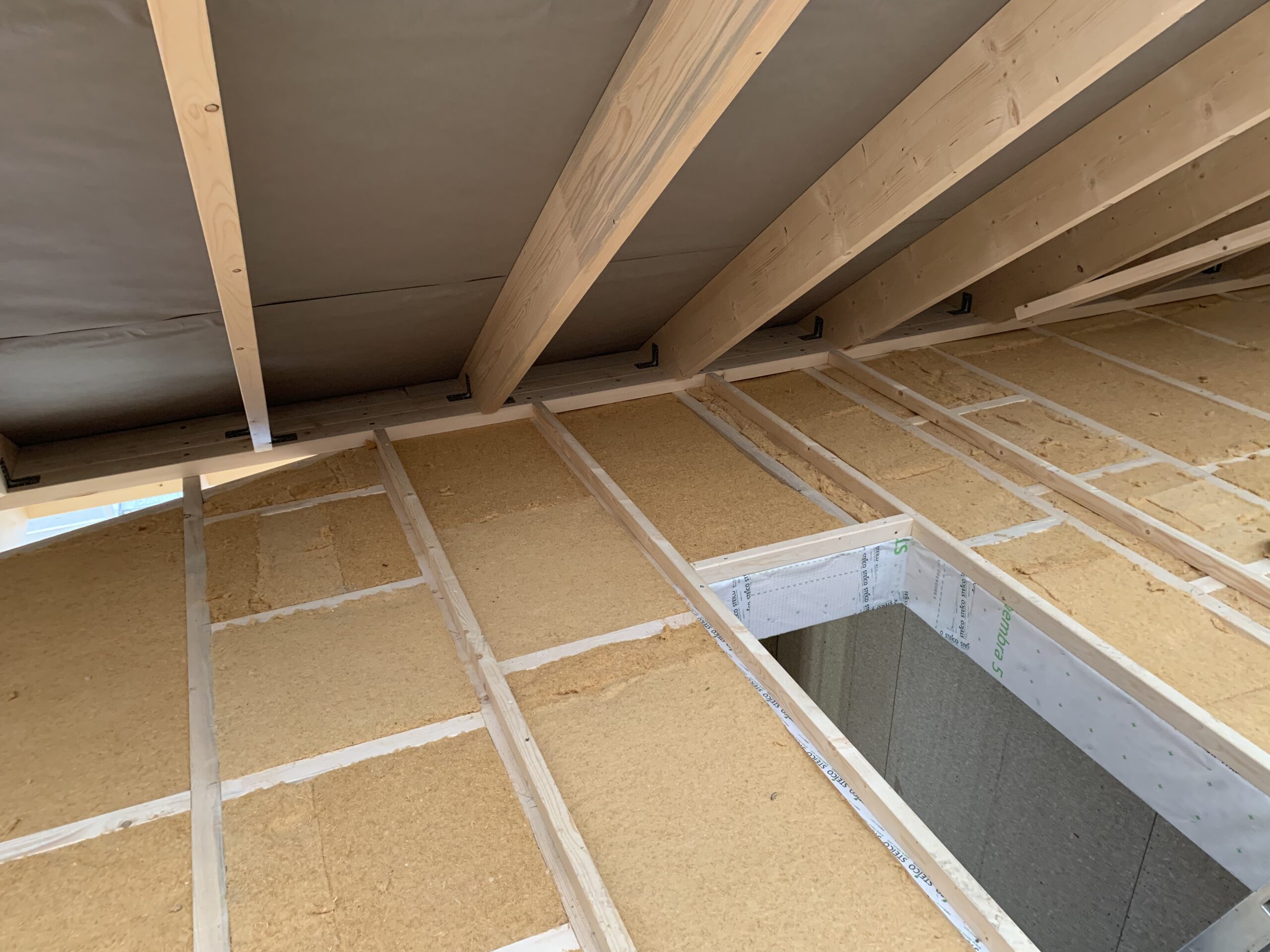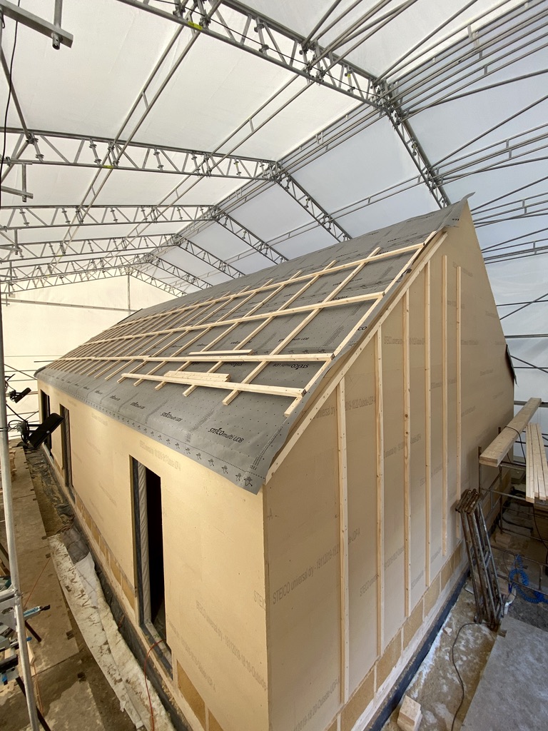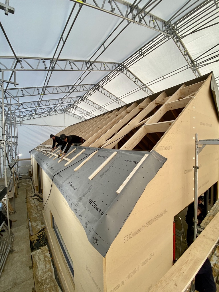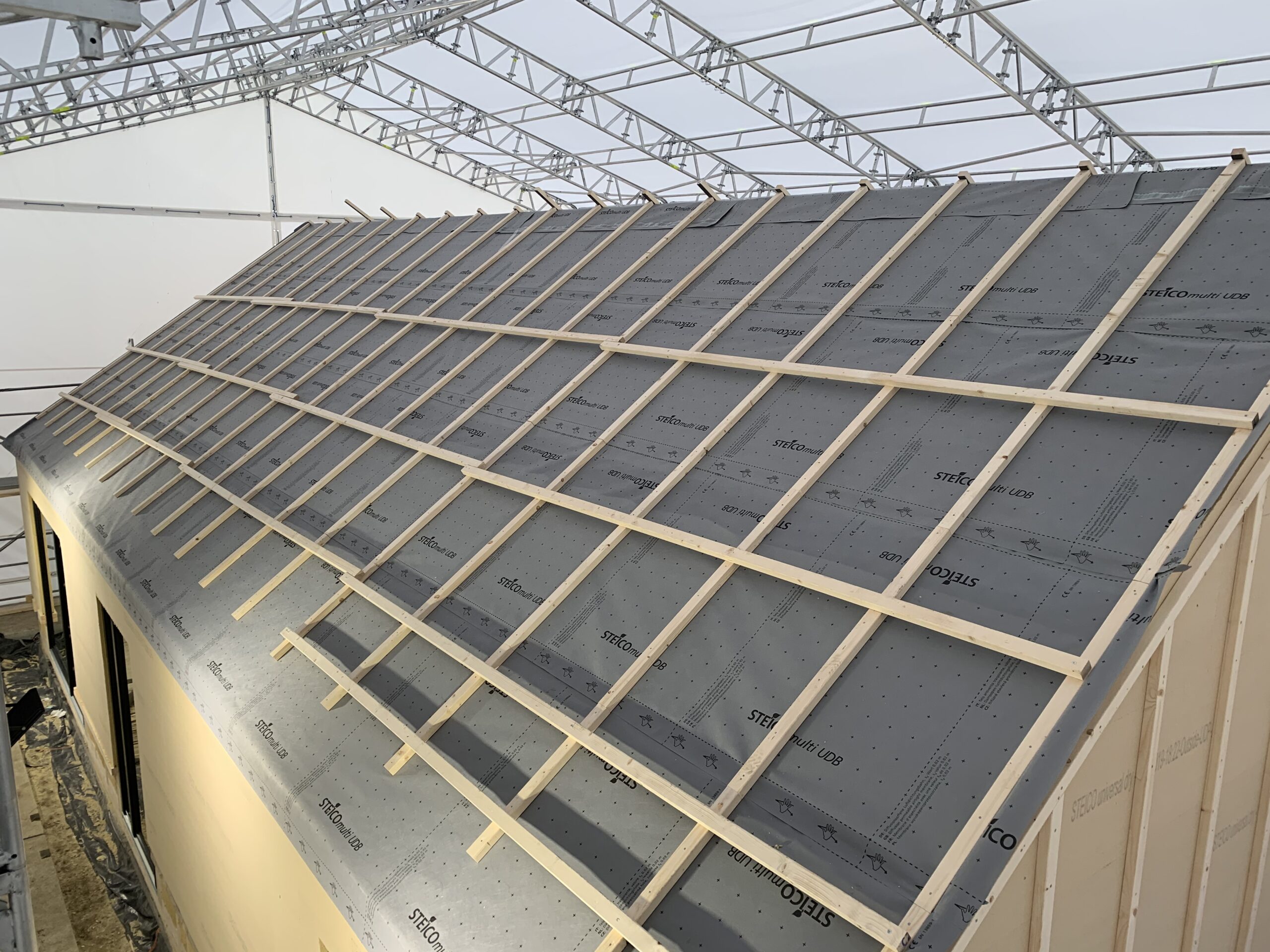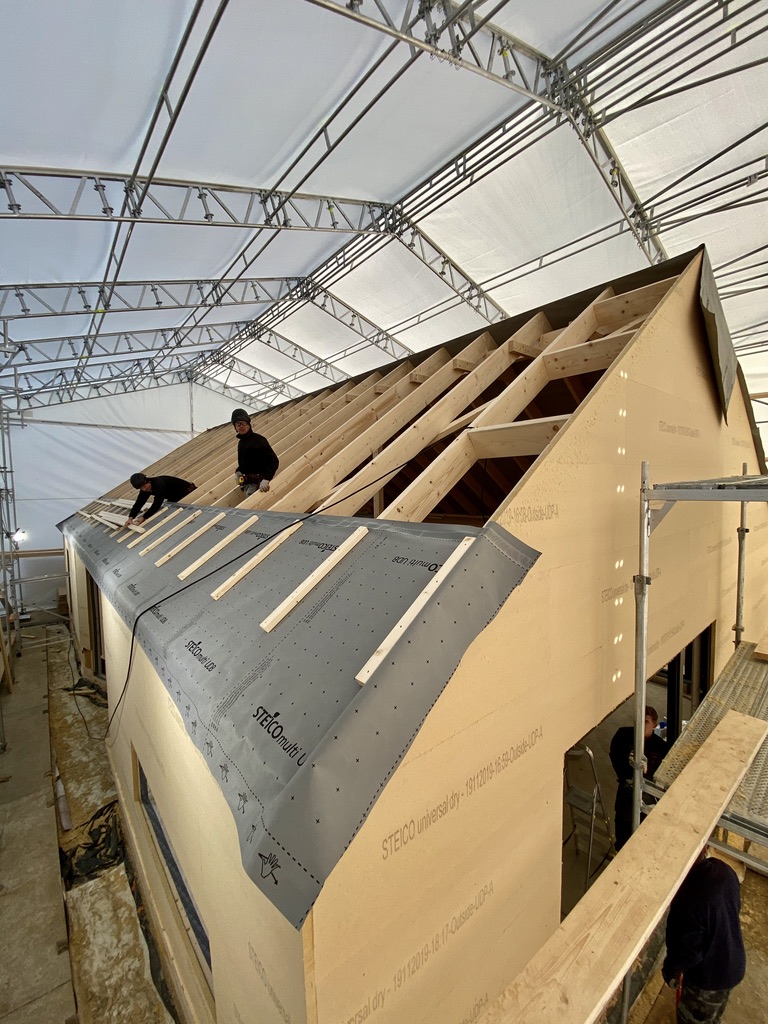 Pierwszą kontrłatę nalaży zamocować po każdej ze stron dachu w sposób taki, aby przylegała ona bokiem do płaszczyzny STEICO UNIVERSAL przez membranę dachową. Nadmiar membrany należy wywinąć poza obrys ściany- na zewnątrz. Płaszczyznę membrany znajdującą się na krawędzi płyty STEICO UNIVERSAL należy skleić taśmą systemową z kontrłatą, zabezpieczając tym samym szczelinę, która powstanie na styku łata/membrana po stronie STEICO UNIVERSAL.