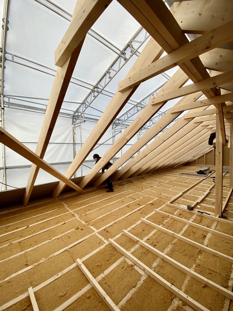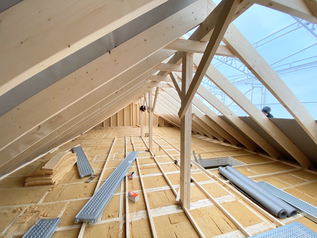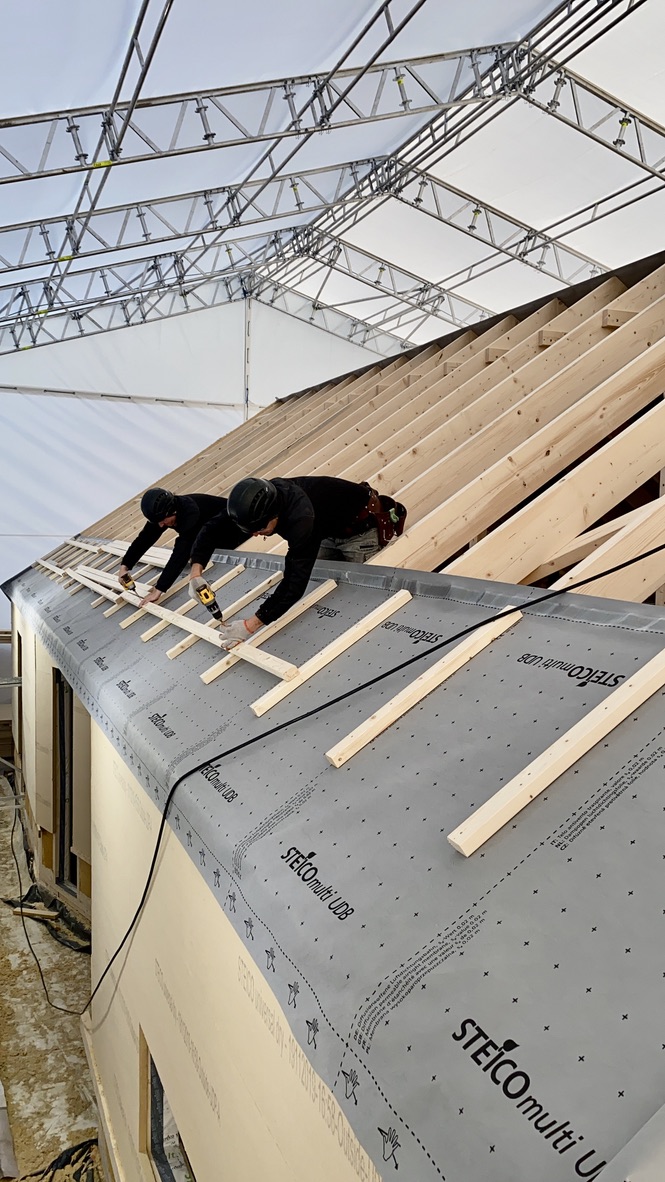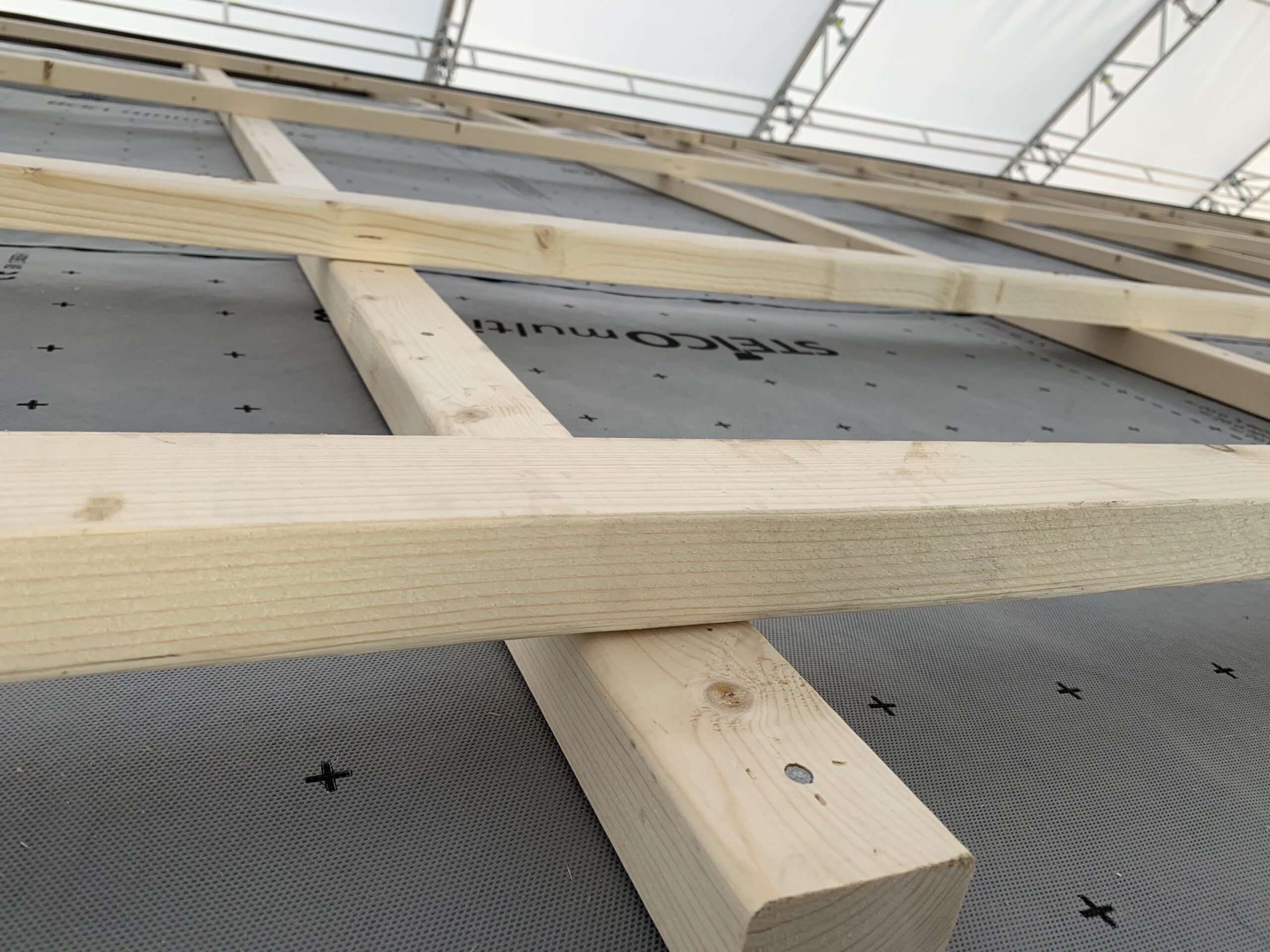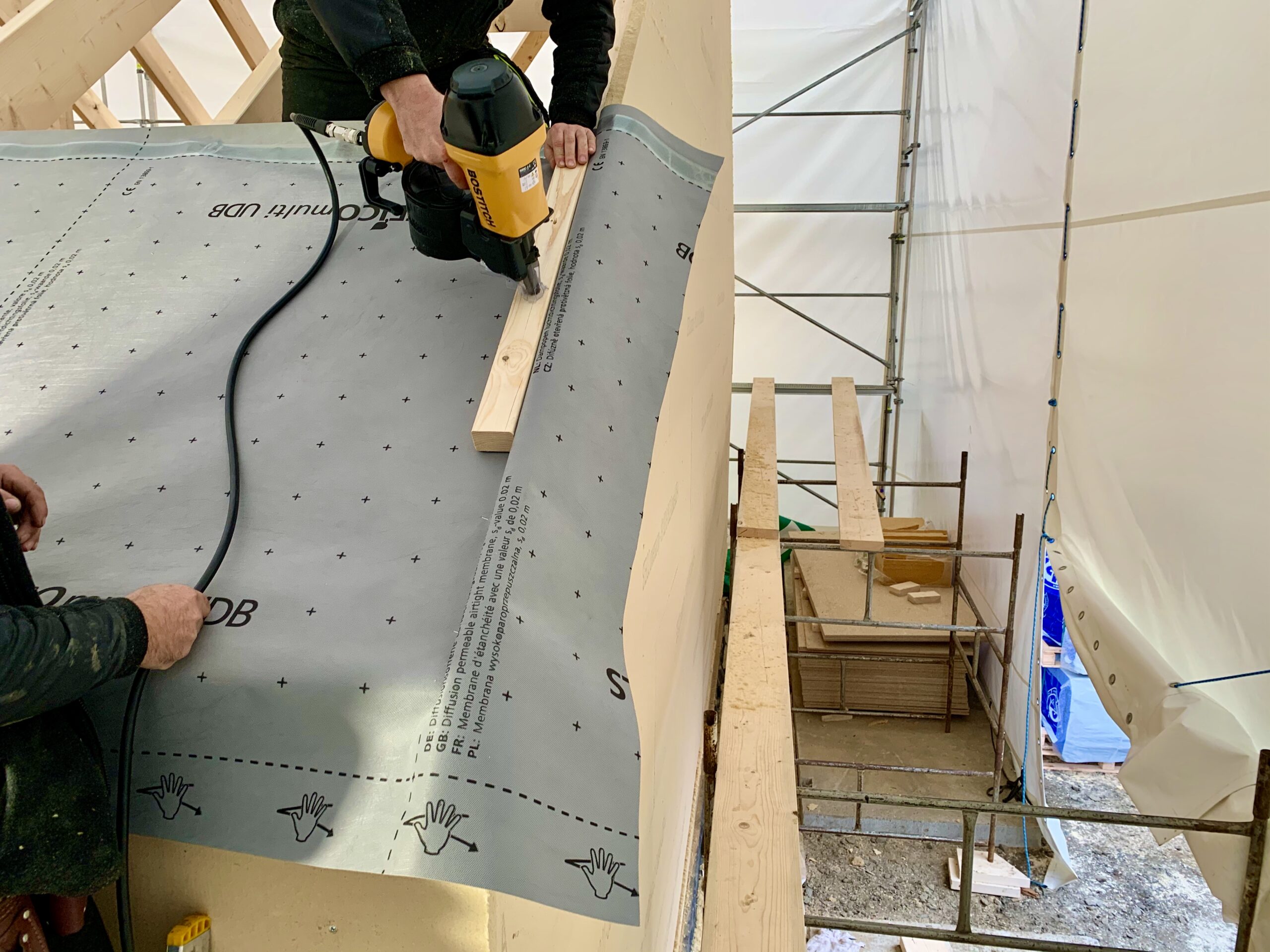 Co ważne – membrana winna być rozłożona w linii prostej, bez fałd i zagięć. Membrany nie napinamy, nie naciągamy – rozkładamy ją w delikatnym naprężeniu umożliwiającym doklejenie kolejnej warstwy membrany układanej na niej. Na powierzchni już przymocowanej membrany rozpoczynamy układanie kontrłat – te przybijamy przez membranę do konstrukcji nośnej za pomocą gwoździ.