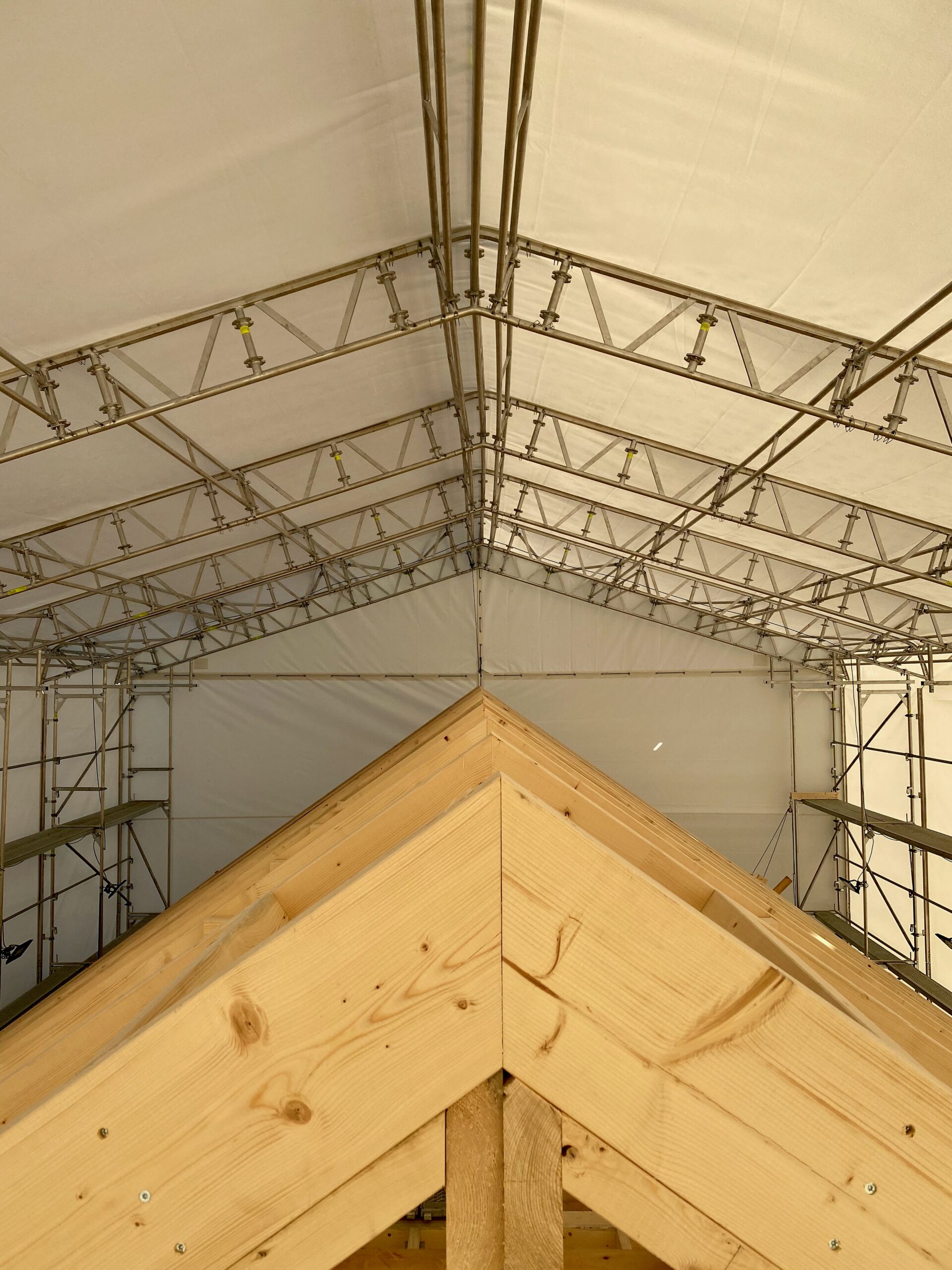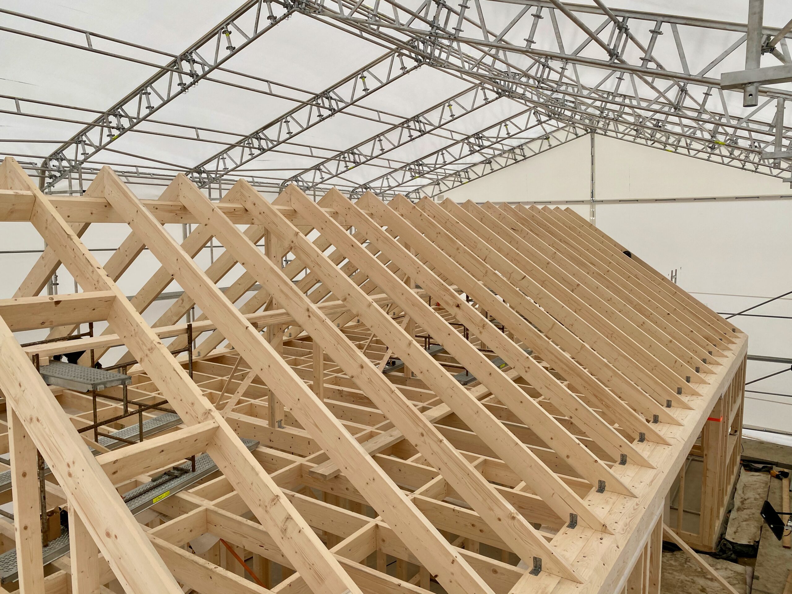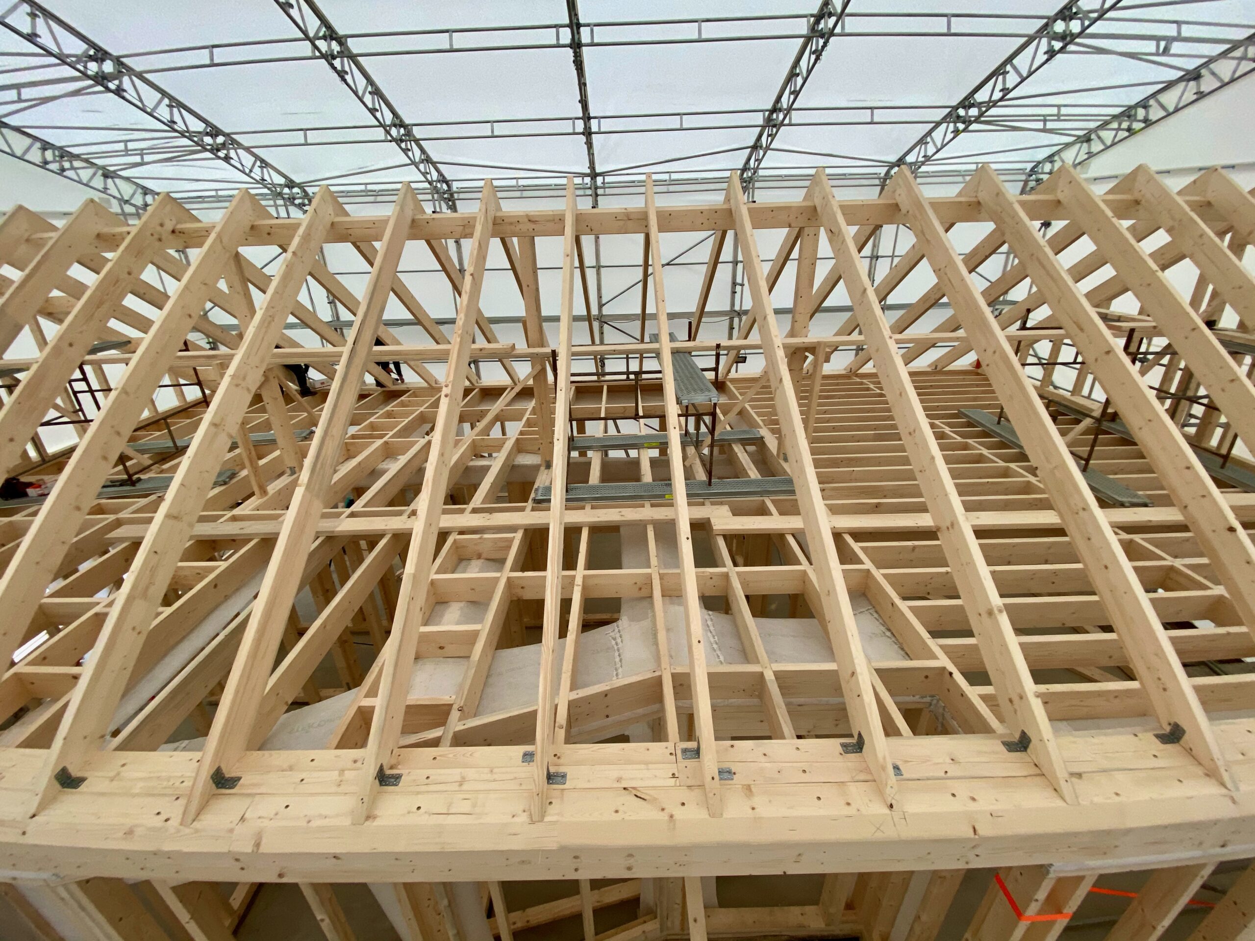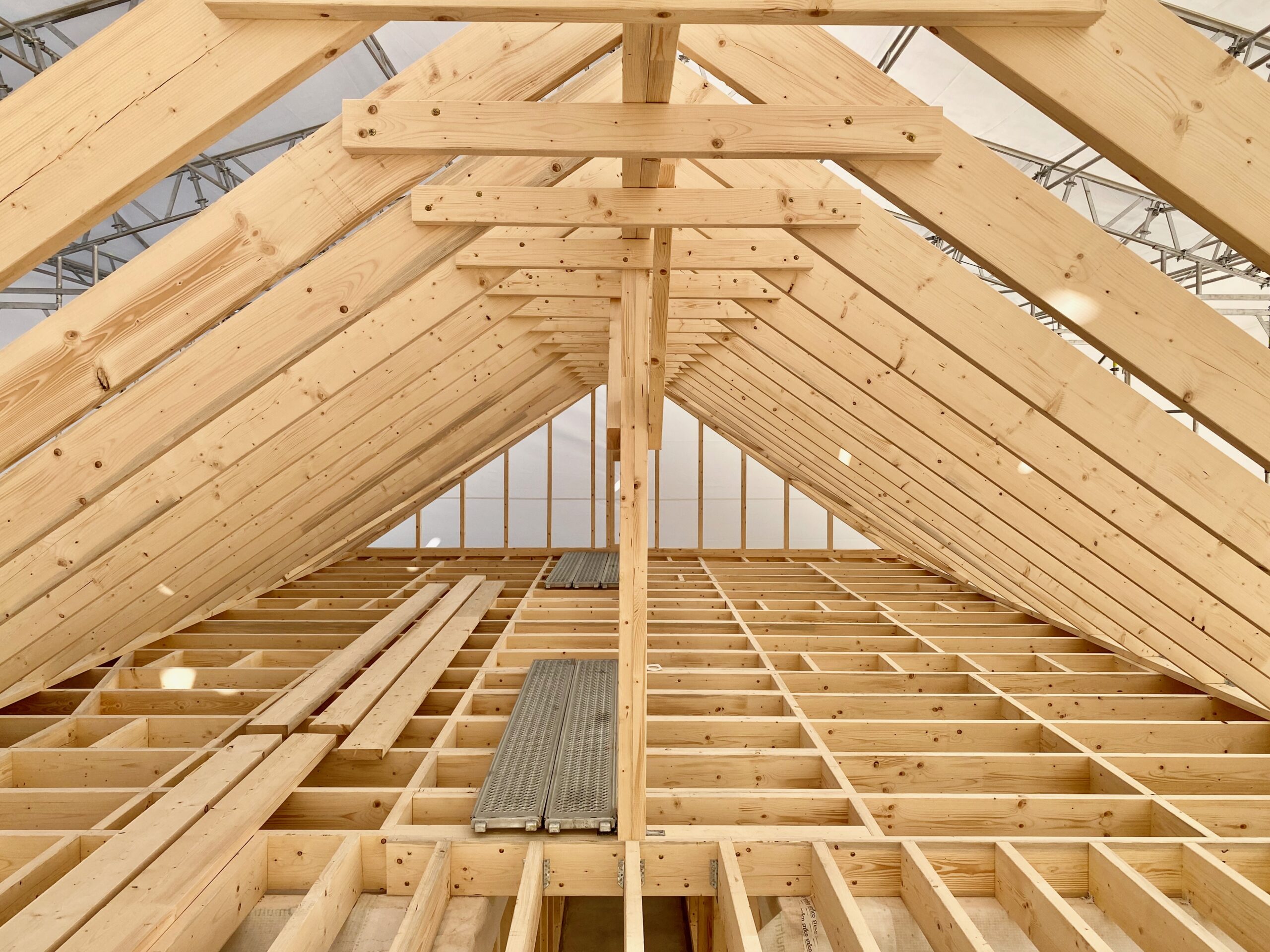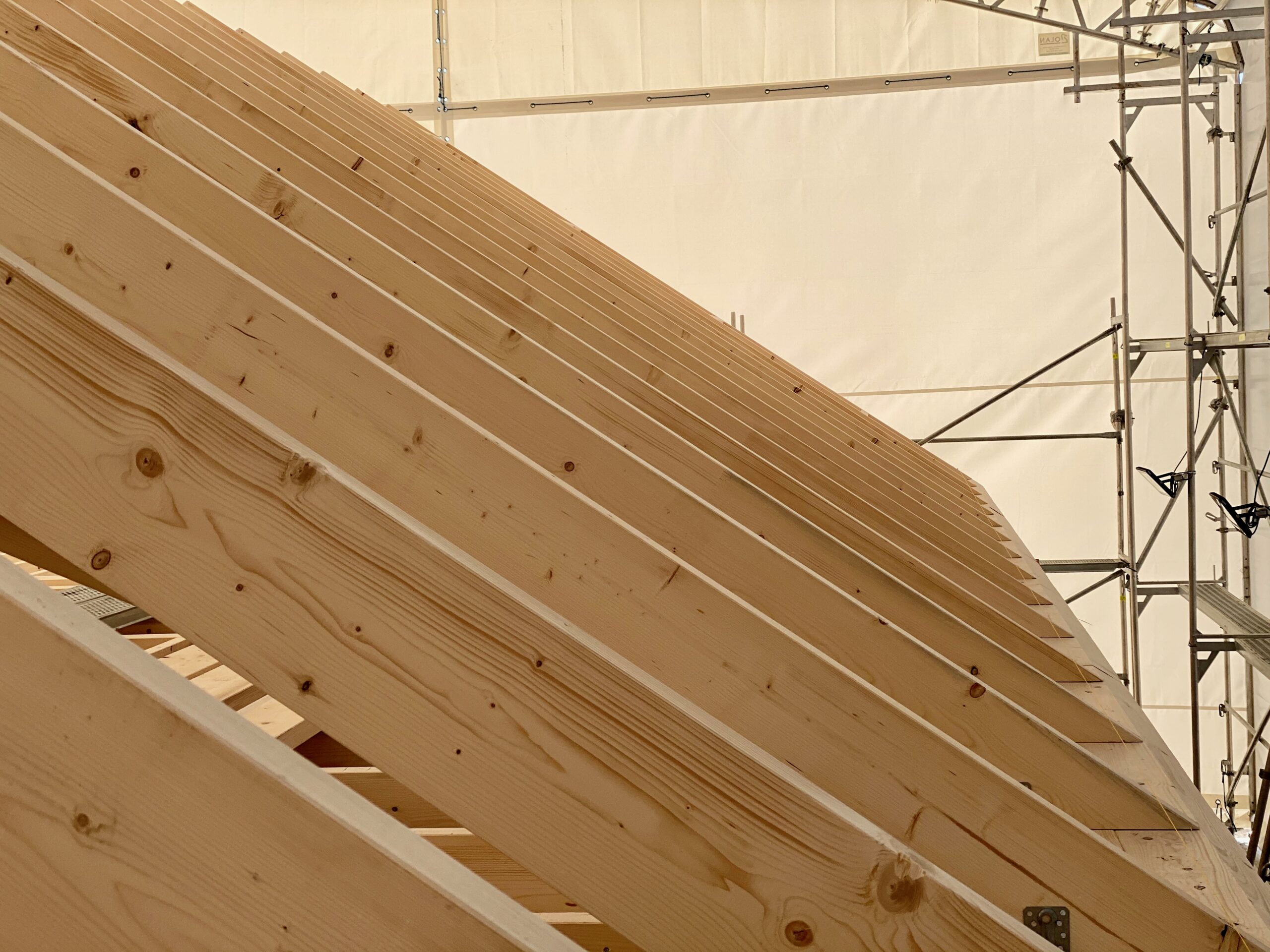 8. Usztywnienie konstrukcji dachu odbywa się poprzez dokręcenie do krokwi od spodu belek konstrukcyjnych z drewna KVH. Takie usztywnienie wykonuje się z użyciem materiału konstrukcyjnego (60×120). Na każdą krokiew przypadają dwa wkręty fi 6 o długości 12cm. Usztywnienie mocujemy w taki sposób, aby rozpoczynało ono swój bieg na pierwszej krokwi, a kończyło na krokwi, na której kolejny zastrzał się rozpoczyna. Usztywnienia montujemy w taki sposób, aby biegły zawsze od ściany szczytowej ku dołowi – w kierunku do wnętrza obiektu.