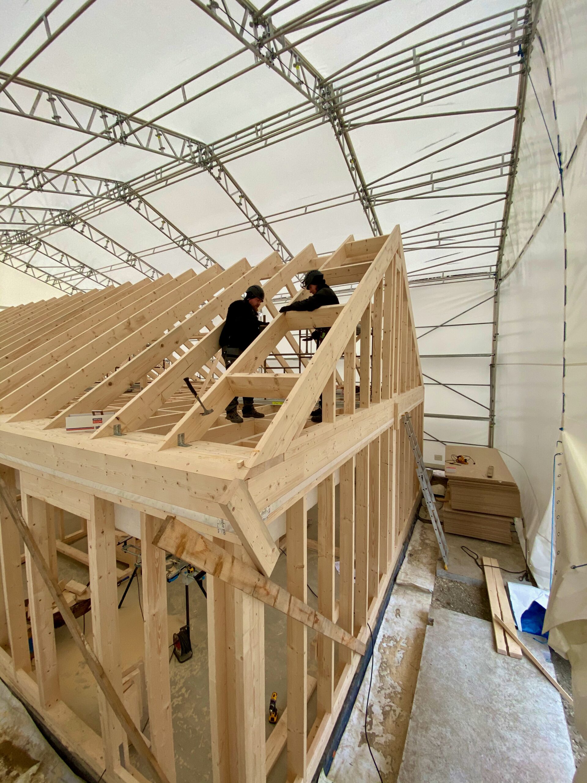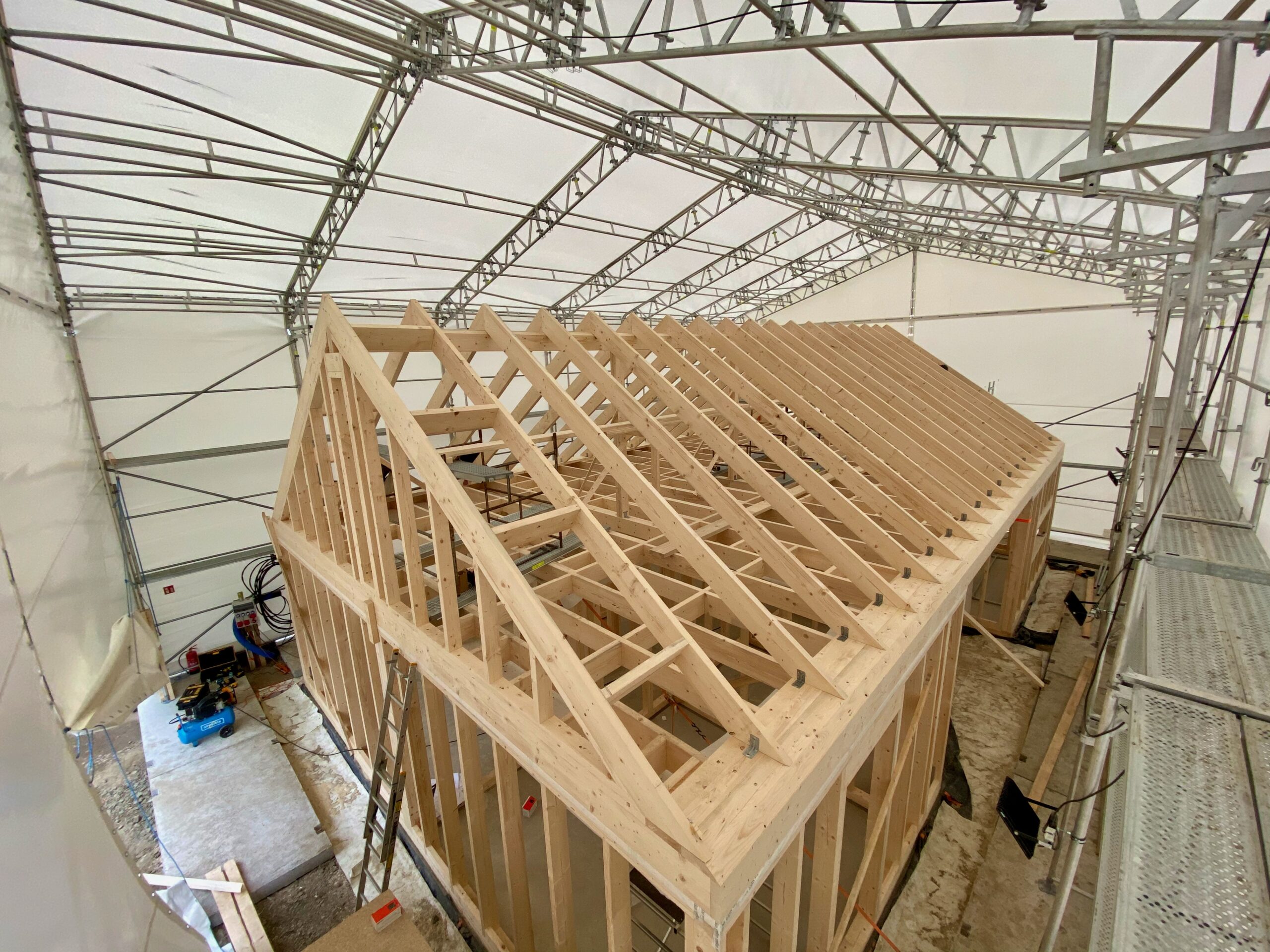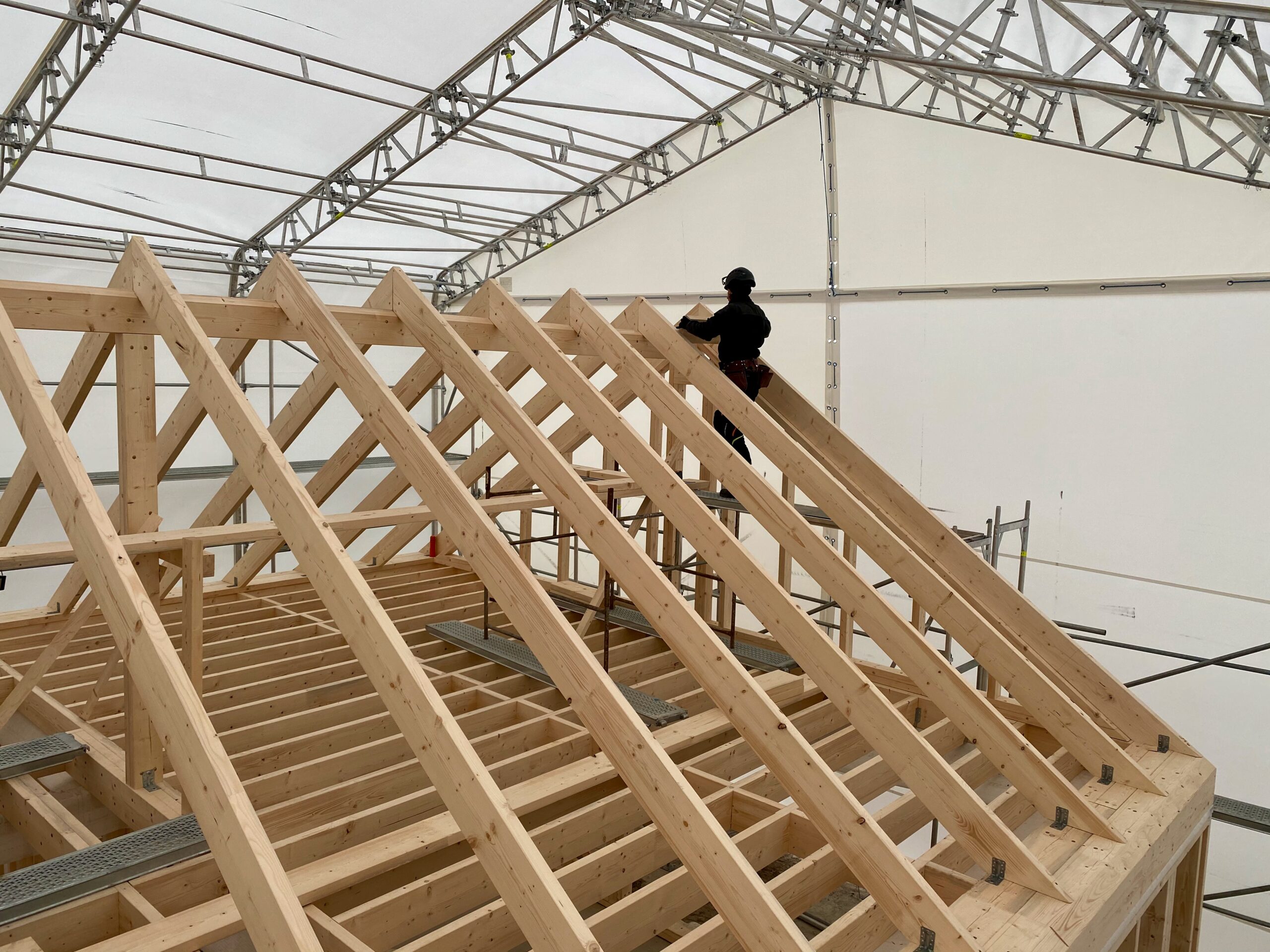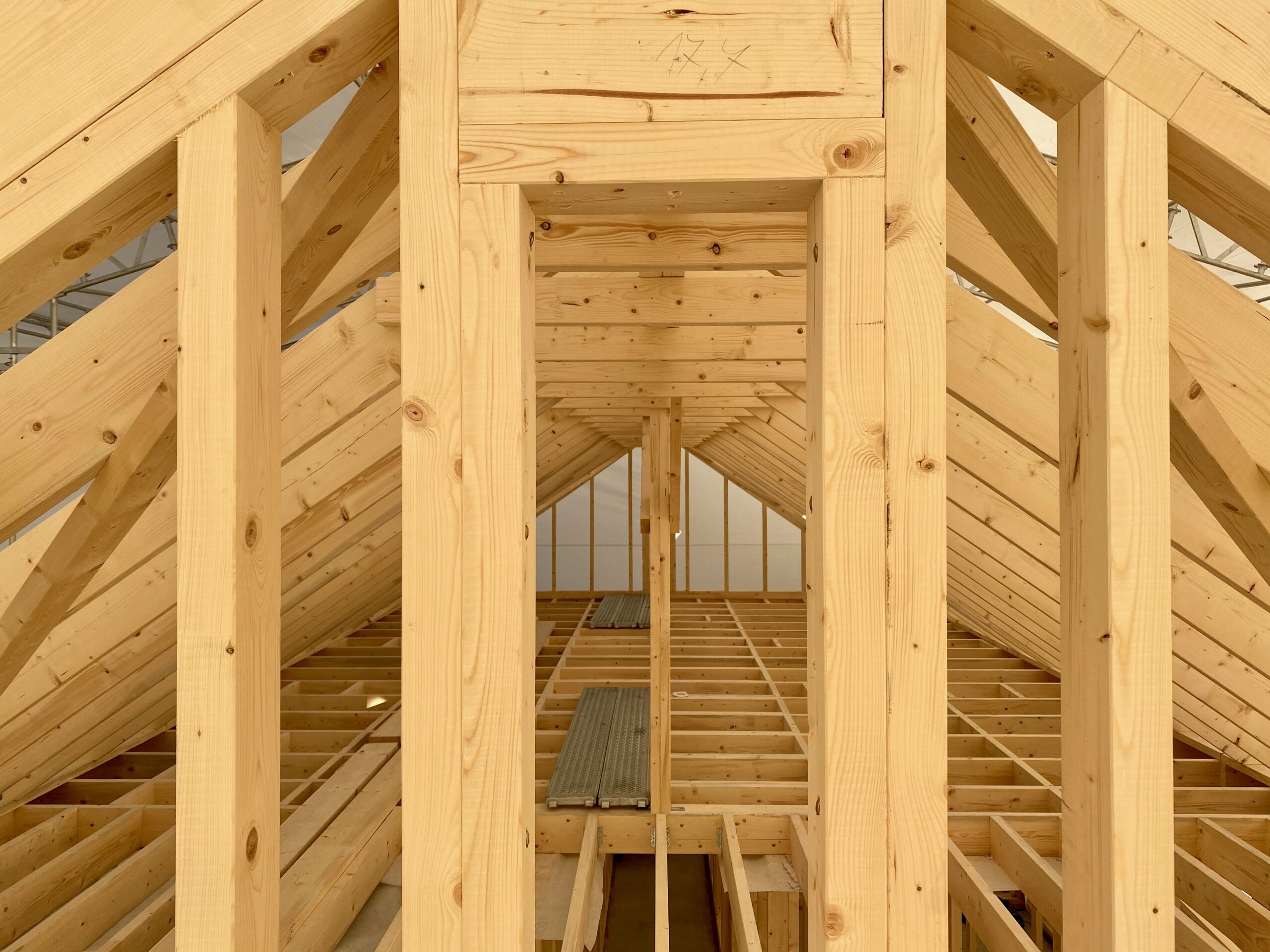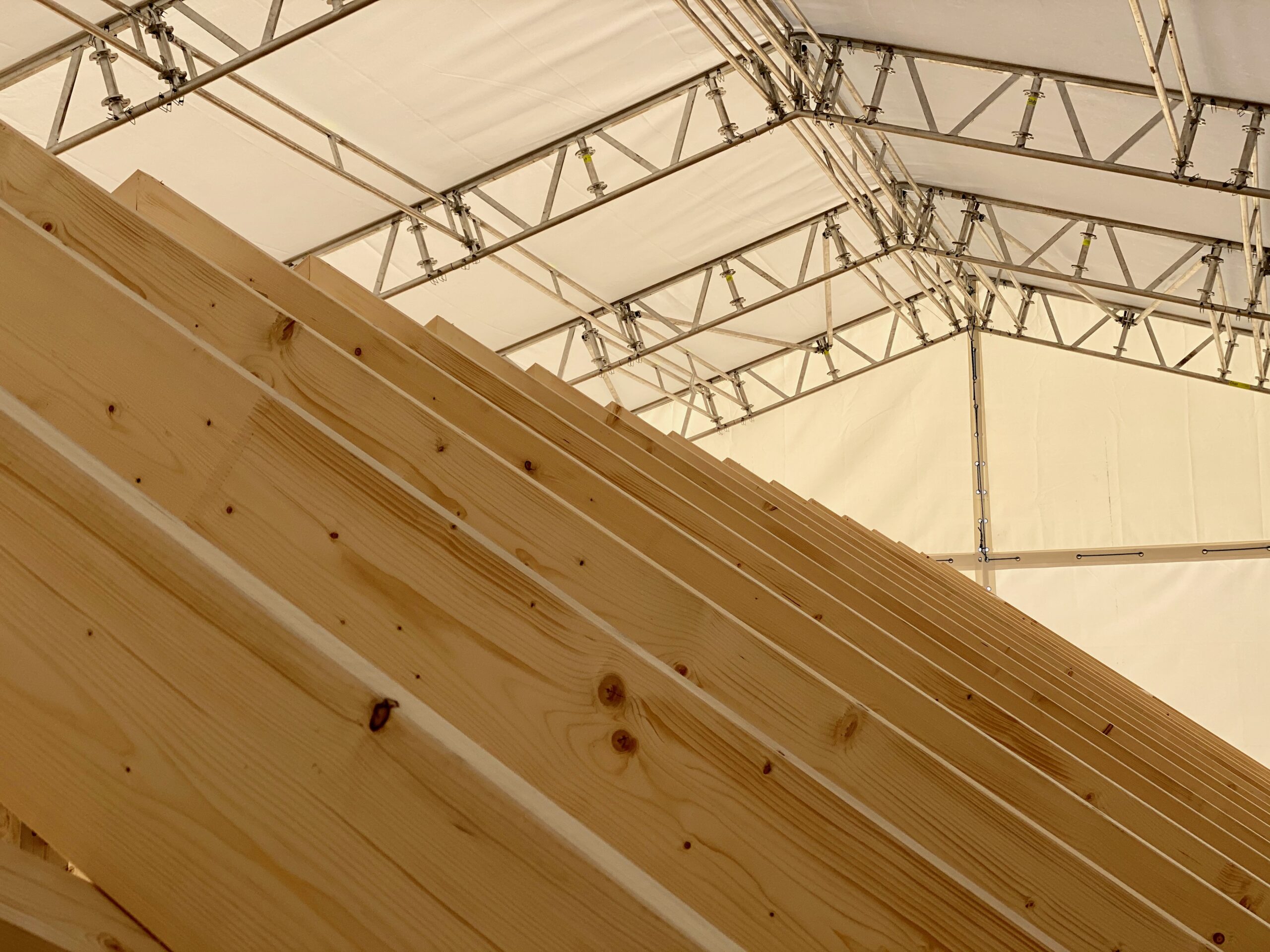 8. Usztywnienie konstrukcji dachu odbywa się poprzez dokręcenie do krokwi od spodu belek konstrukcyjnych z drewna KVH. Takie usztywnienie wykonuje się z użyciem materiału konstrukcyjnego (60×120). Na każdą krokiew przypadają dwa wkręty fi 6 o długości 12cm. Usztywnienie mocujemy w taki sposób, aby rozpoczynało ono swój bieg na pierwszej krokwi, a kończyło na krokwi, na której kolejny zastrzał się rozpoczyna. Usztywnienia montujemy w taki sposób, aby biegły zawsze od ściany szczytowej ku dołowi – w kierunku do wnętrza obiektu.