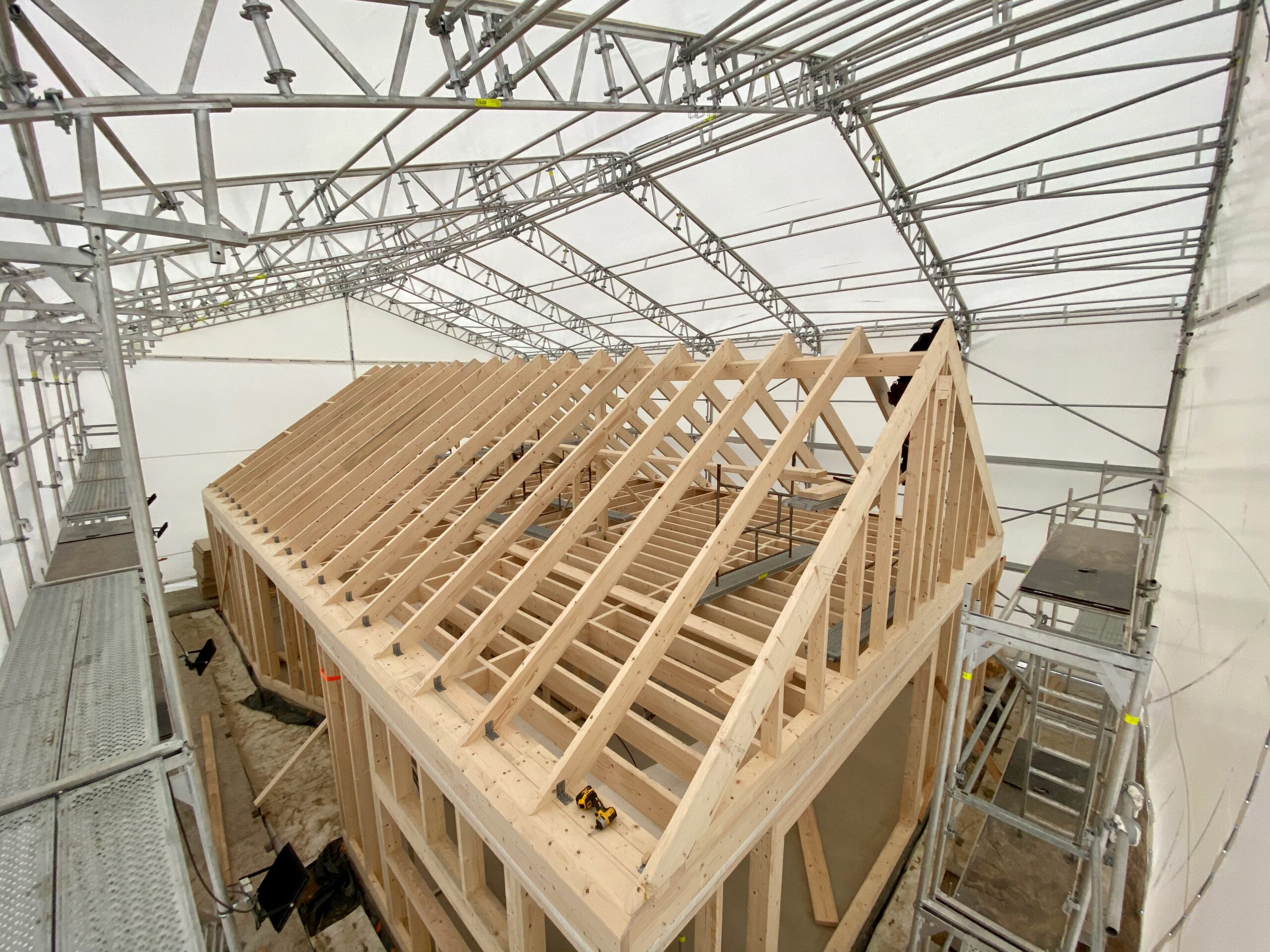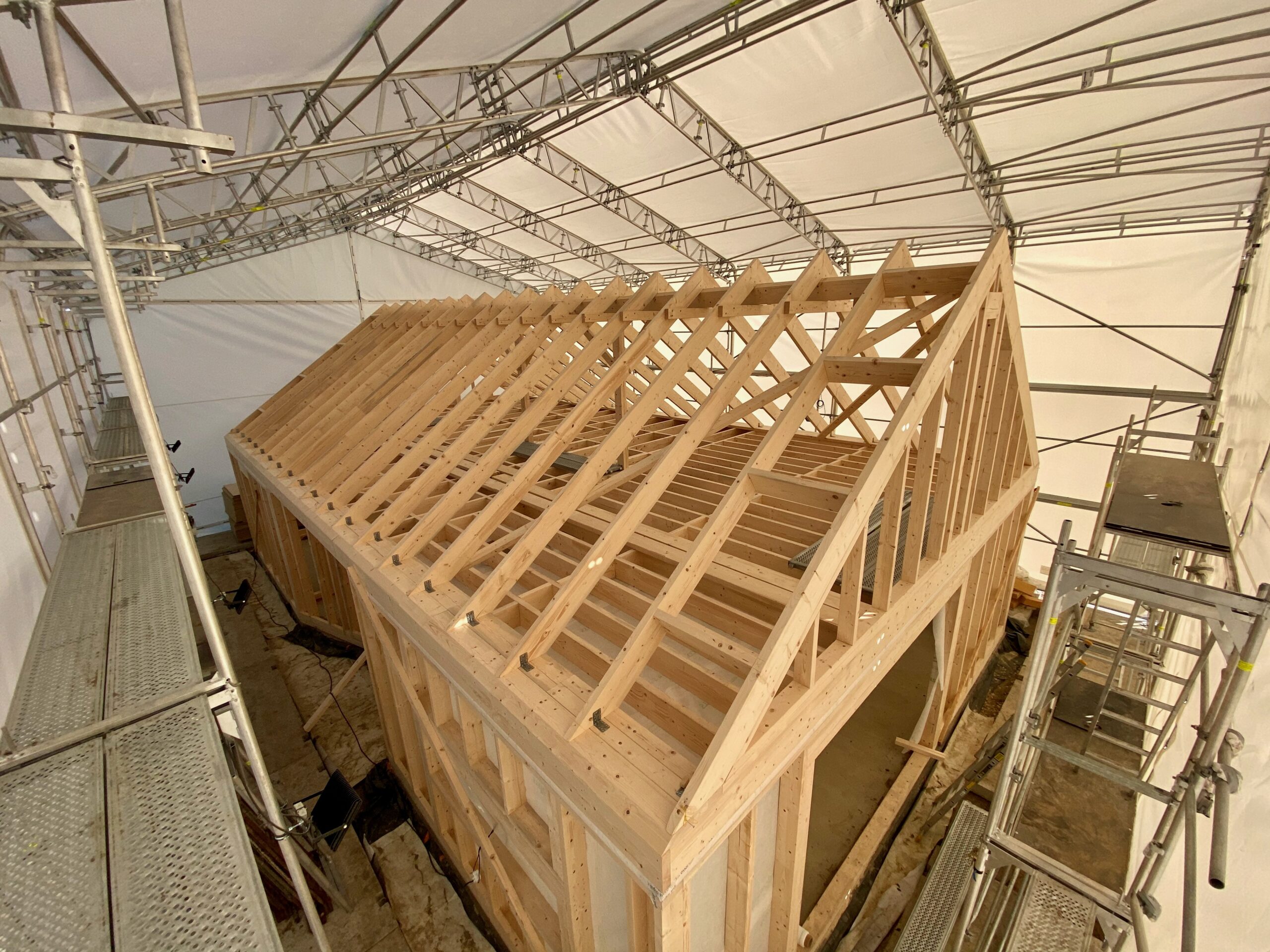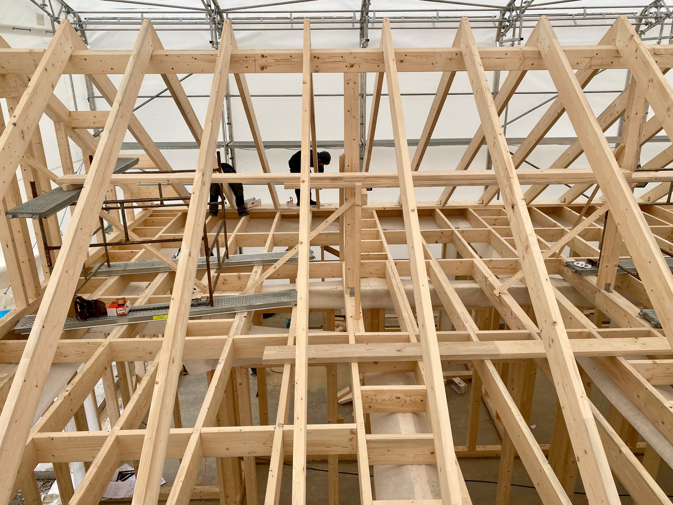 4. Belka kalenicowa – ze względu na długość belki kalenicowej zmuszeni jesteśmy wykonać ją aż z 6 elementów z profilu (60×240). Każda z belek wspierających cięta jest nie tylko poprzecznie, ale i wzdłużnie. Kąt nachylenia dachu określa kąt zacięcia belek. Operację tą wykonaliśmy niezwykle starannie – od jakości cięcia zależy głębokość podparcia krokwi na belce kalenicowej.