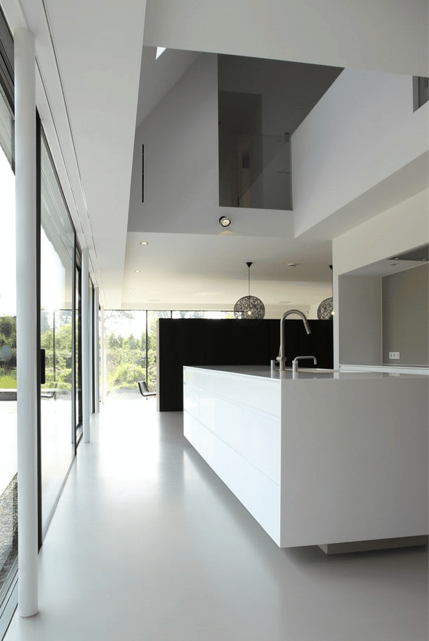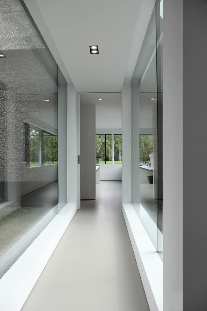 Długa ściana domu Outside-in’, która znajduje się od strony ulicy, jest w większości zamknięta, dzięki czemu wnętrze zachowuje bardziej prywatny charakter, otwierając się z kolei na ogród i sielskie otoczenie. Architekci zadbali o to, by piękny ogród stał się częścią wnętrza, wstawiając z tej strony duże tafle szkła. Po ich otwarciu nowoczesne pomieszczenia płynnie przechodzą w zieleń, zapewniając mieszkańcom namacalne doświadczanie otaczającej ich podmiejskiej przyrody.