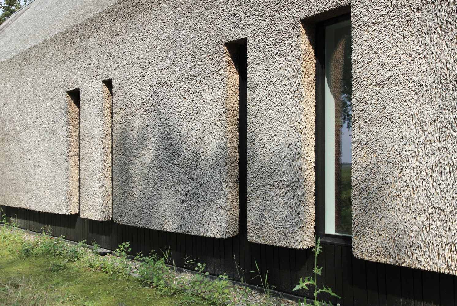 W elewacji materiał dominujący stanowi trzcina. Wykorzystano ją nie tylko do pokrycia dachu, ale też części ścian zewnętrznych. To właśnie trzcinowy budulec, który tak łatwo można przekształcić z żywej rośliny w materiał budowlany, nadaje całości wiejski charakter i doskonale współgra z naturalnym otoczeniem.