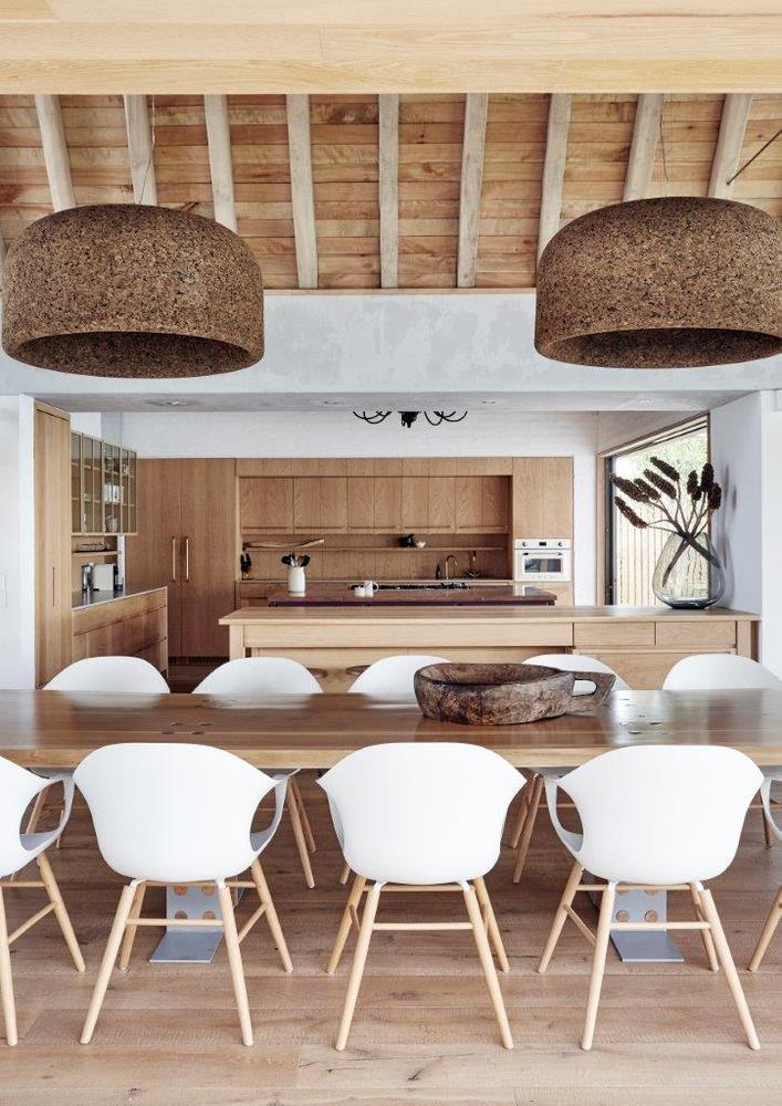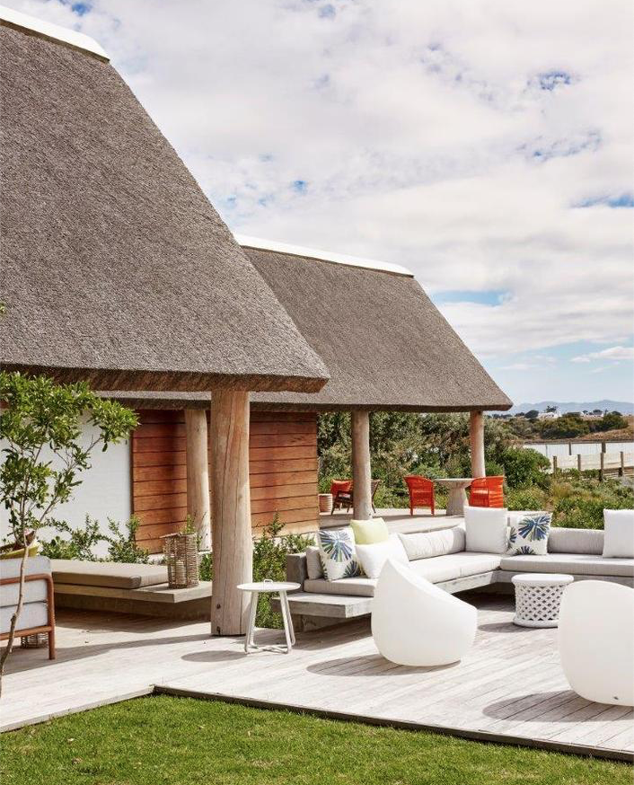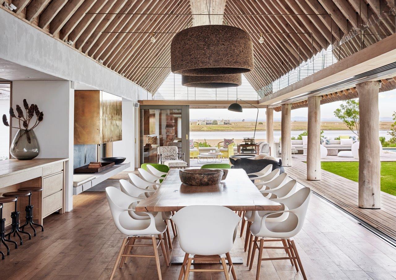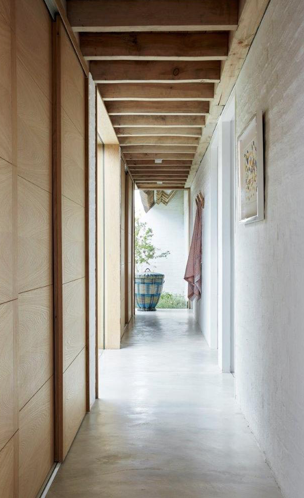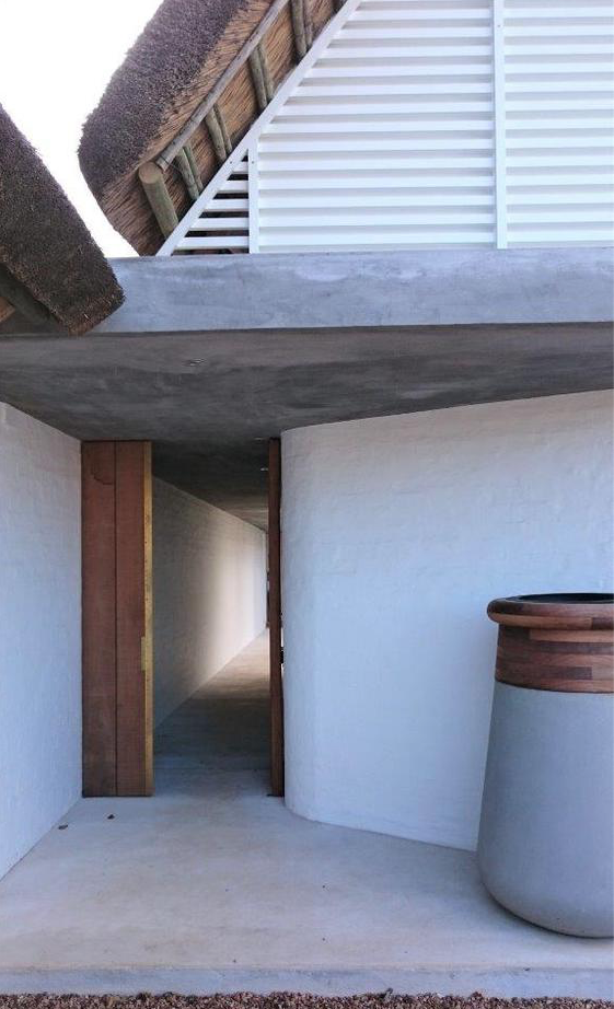 Tam, gdzie dom ma otwierać się na zewnątrz, duże dachy kryte strzechą podparto na szeregu przeskalowanych kolumn eukaliptusowych, przypominających pawilony. Te pawilony można otworzyć całkowicie, przesuwając szklane drzwi i drewniane okiennice do ukrytych wnęk. Gdy wszystkie są otwarte, konstrukcje przypominają szereg pawilonów krytych strzechą, które umożliwiają płynny, swobodny przepływ ruchu od wewnątrz na zewnątrz. Pozwala również na nieprzerwane przejście z jednego podwórka przez dom do drugiego. Ta zależność zachodzi w całym domu, łącznie z pomieszczeniami codziennymi i łazienkami. Te ostatnie otwierają się na prywatne, ogrodzone dziedzińce, oświetlone naturalnym światłem.