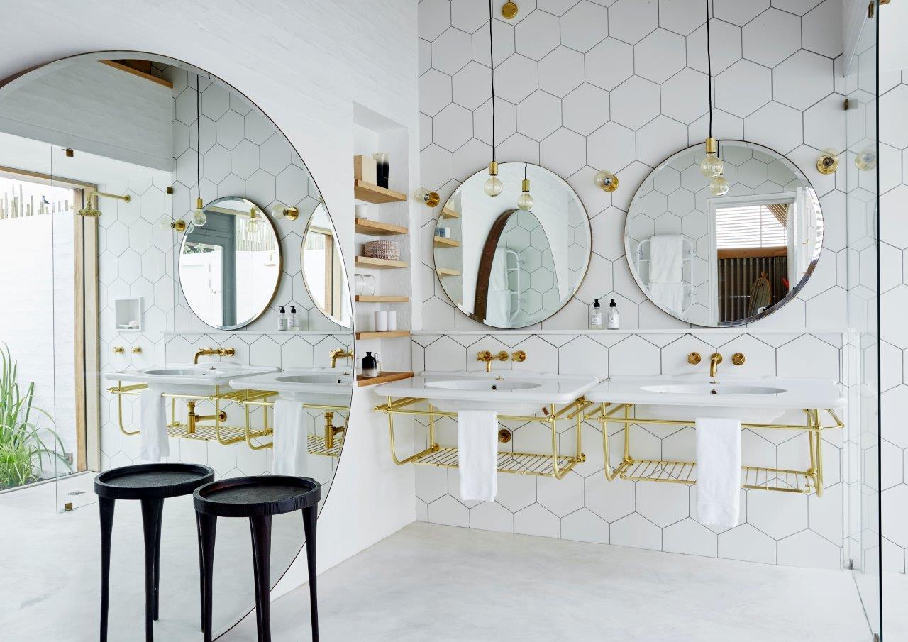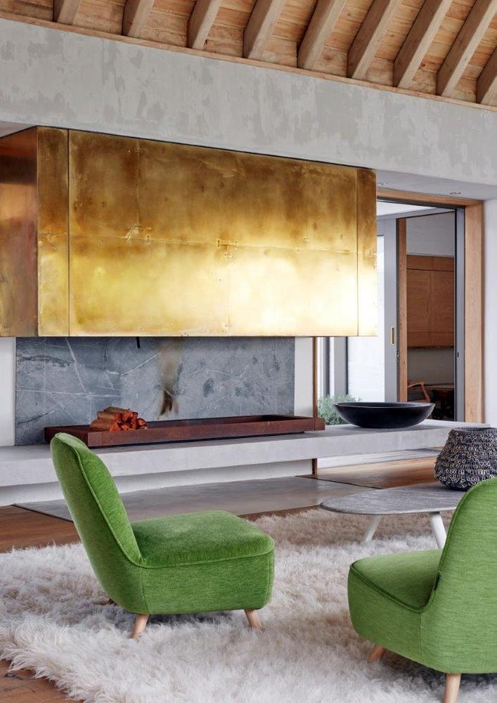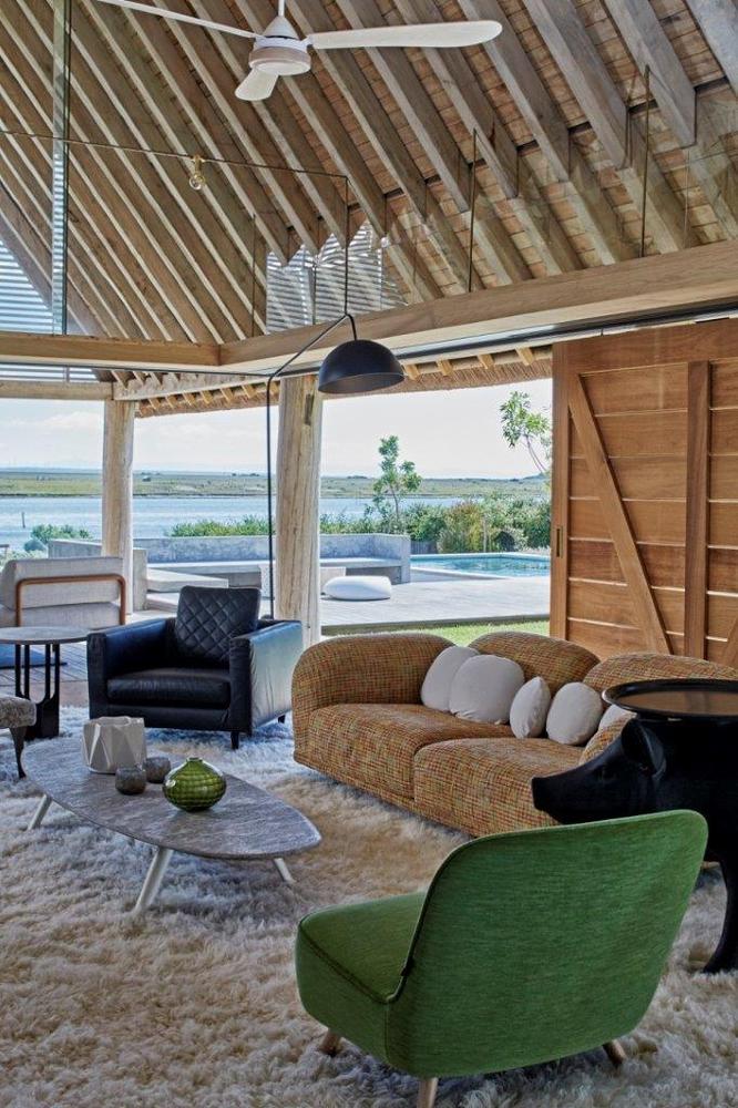 River House F wykończono paletą naturalnych materiałów, zapewniając neutralne tło dla kolorowych mebli i kontrastujących z nimi mosiężnych detali. Konsekwentne wykorzystanie ograniczonej palety materiałów tworzy spójne wnętrze, dające poczucie światła i spokoju. Dach to złożony kawałek inżynierii, solidny i organiczny. Zbudowany z belek topolowych, przypomina odwrócony kadłub łodzi. Natomiast tradycyjne, pełne szczyty zostały zastąpione listwowymi, aluminiowymi ekranami, które przepuszczają światło słoneczne w ciągu dnia, a jednocześnie stają się przezroczyste i przypominające gazę, oświetlając w nocy strukturę wnętrza. Przesuwane drewniane żaluzje przesłaniają pomieszczenia, zapewniając prywatność i cień oraz ochronę, gdy jest to wymagane.